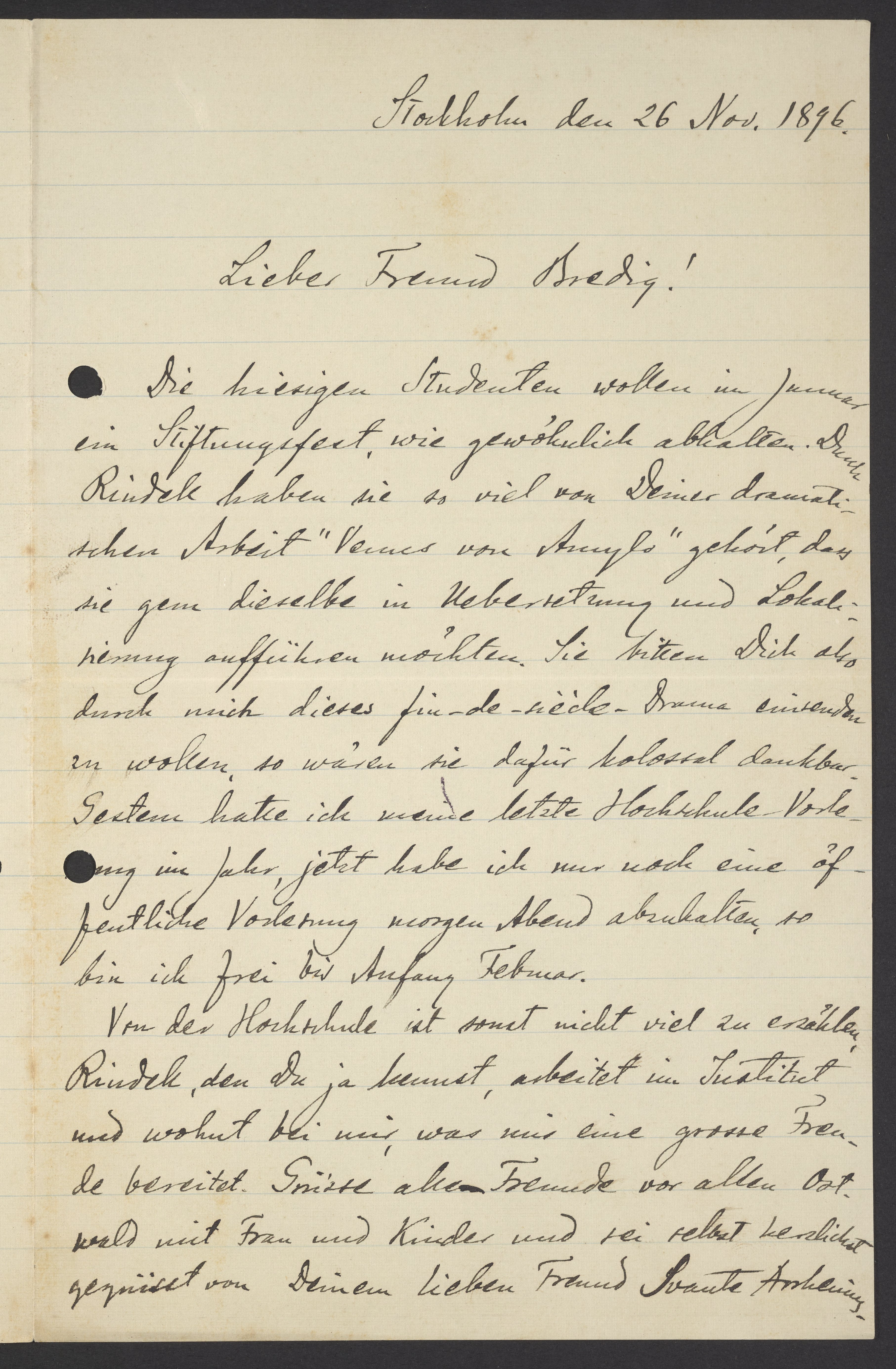 Die hiesigen Studenten wollen im Januar ein Stiftungsfest, wie gewöhnlich abhalten. Durch Rindell haben sie so viel von Deiner dramatischen Arbeit “Venus von Amylo” gehört, dass sie gern dieselbe in Uebersetzung und Lokalisierung aufführen möchten. Sie bitten Dich also durch mich dieses fin-de siècle Drama einsenden zu wollen, so wären sie dafür kolossal dankbar. Gestern hatte ich me meine letzte Hochschule-Vorlesung im Jahr, jetzt habe ich nur noch eine öffentliche Vorlesung morgen Abend abzuhalten, so bin ich frei bis Anfang Februar.