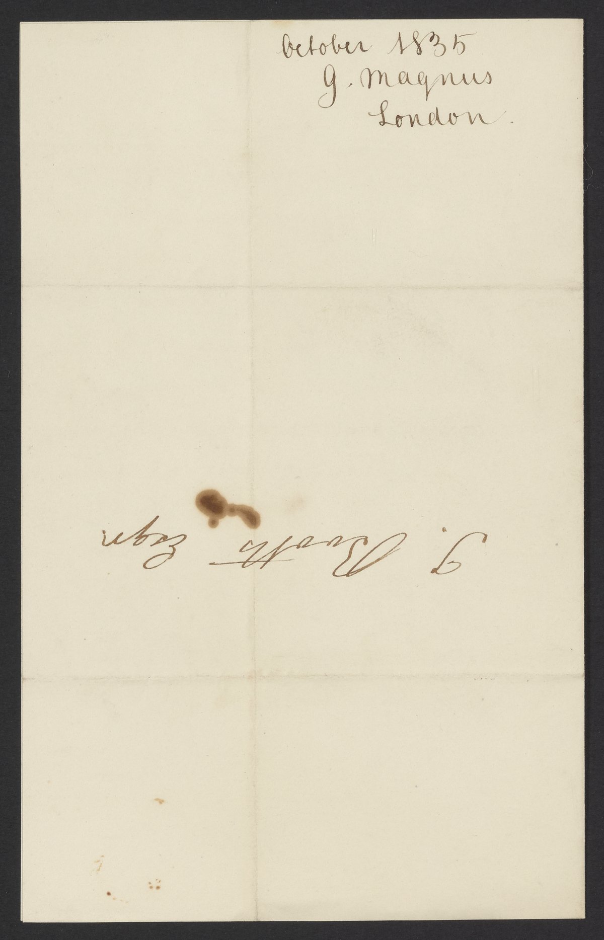 Magnus, Gustav. “Letter from Professor Gustav Magnus to James Curtis Booth, October 1825,” October 1825. Papers of James Curtis Booth, Box 1, Folder 2. Science History Institute. Philadelphia. https://digital.sciencehistory.org/works/jz6lcz7.