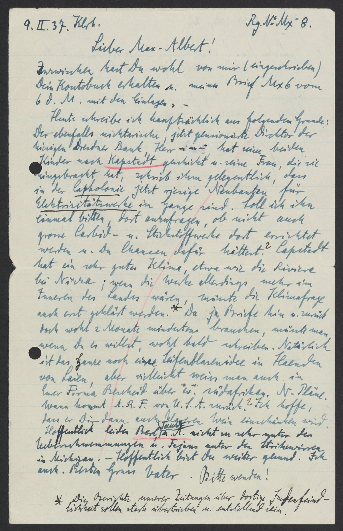 Heute schreibe ich hauptsächlich aus folgendem Grunde: Der ebenfalls nichtarische, jetzt plunionische Direktor der hiesigen Dresdner Bank, Herr ---, hat seine beiden Kinder nach Kapstadt geschickt u. seine Frau, die sie hingebracht hat, schrieb ihm gelegentlich, dass in den Capkolonie jetzt riesige Neubauten für Elektrizitätswerke im Gange sind. Soll ich ihn einmal bitten, dort anzufragen, ob nicht auch grosse Cardbid – u. Stickstoffwerke dort errichtet werden u. Du Chance dafür hättest? Capstadt hat ein sehr gutes Klima, etwa wie die Riviera bei Nirra; wenn die Werke allerdings mehr im Inneren des Landes wären, müsste die Klimafrage auch erst geklärt werden.* Da ja Briefe hin u. zurück doch wohl 2 Monate brauchen, müsste man, wenn Du willst, wohl bald schreiben. Natürlich ist das Ganze noch eine Seifenblase in Händen von Laien, aber vielleicht muss man auch in Eurer Firma Bescheid über eu. Südafrika N-Pläne. Wann kommt A.R.F von U.S.A zurück? Ich hoffe, dass er Dir dann auch klareren Wein einschenken wird. Hoffentlich leiden Berl u. Tausz u.A. nicht zu sehr unter den Überschwemmungen u. Fajans unter Strikewirren in Michigan. – Hoffentlich bist du weiter gesund. Ich auch. Besten Gruss Vater. Bitte wenden!