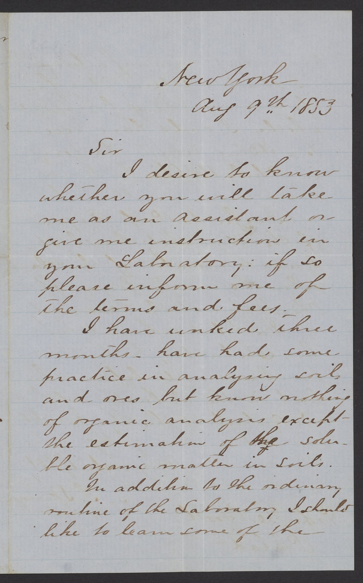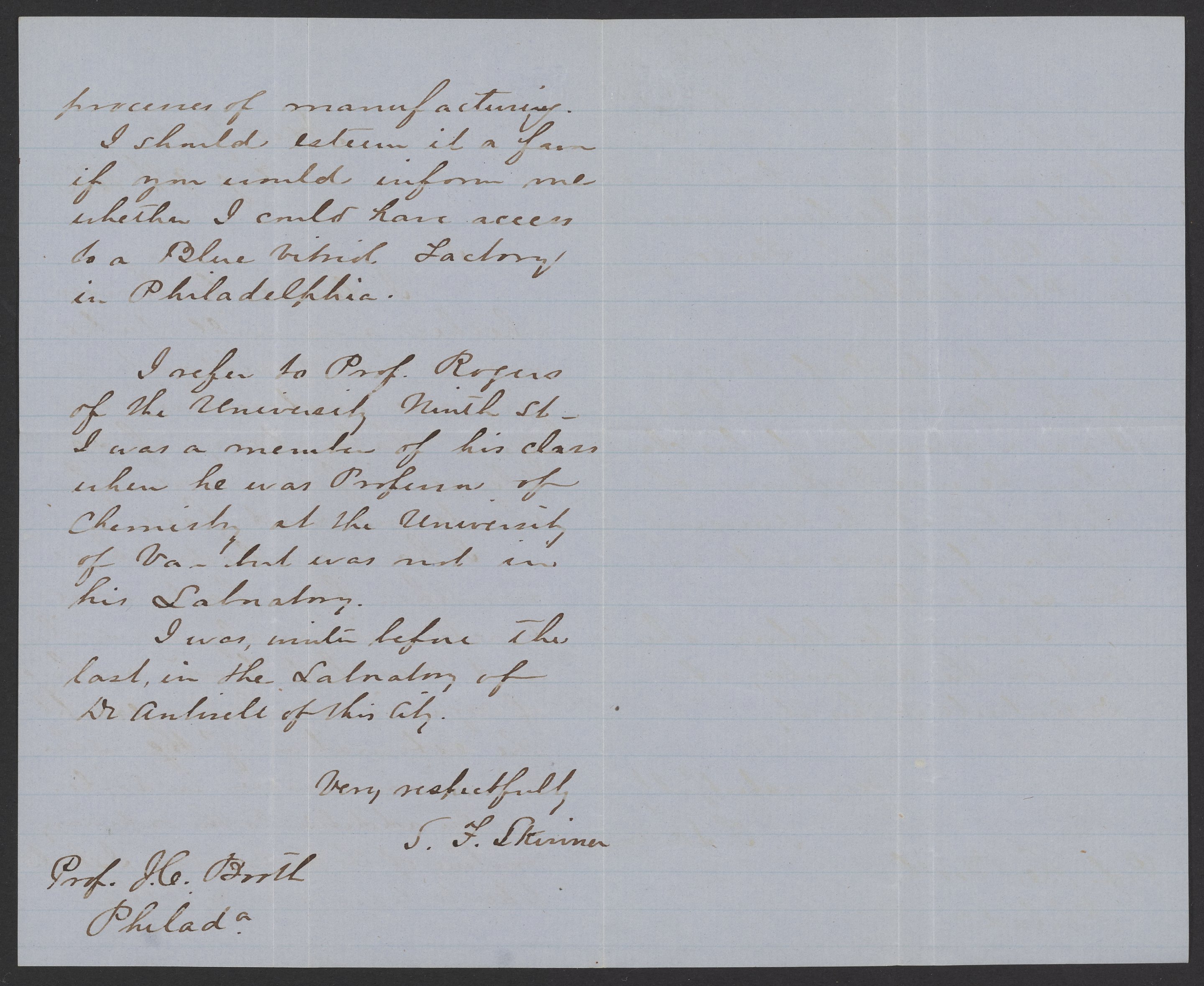 Skinner, S. F. “Letter from S.F. Skinner to James Curtis Booth, August 9, 1853,” August 9, 1853. Papers of James Curtis Booth, Box 1, Folder 6. Science History Institute. Philadelphia. https://digital.sciencehistory.org/works/k00x8f6.
