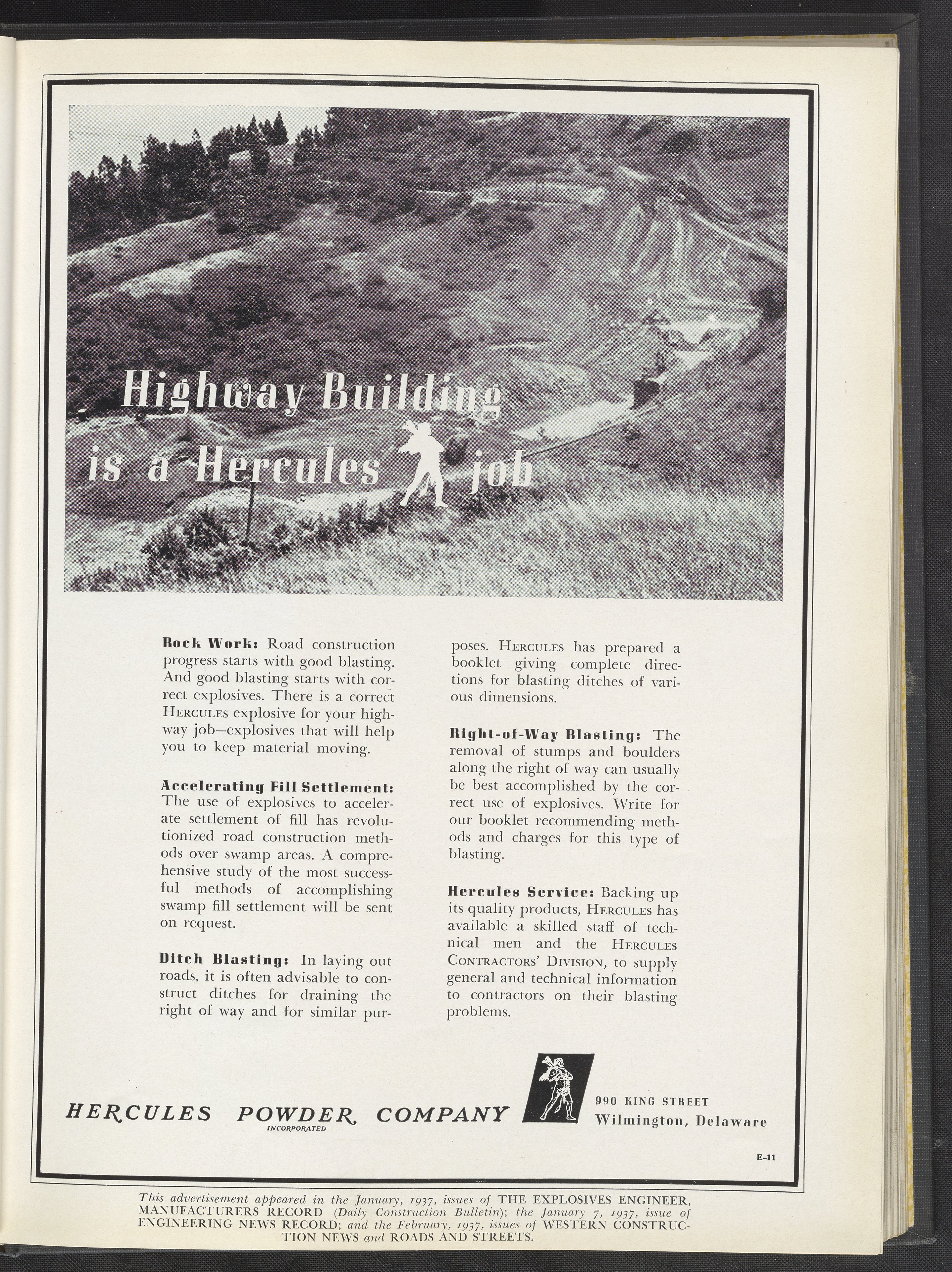 Hercules Incorporated. “Highway Building Is a Hercules Job.” 1937 Hercules Advertisements, 1937. Records of Hercules Incorporated, Volume 1937. Science History Institute. Philadelphia. https://digital.sciencehistory.org/works/k0698825b.