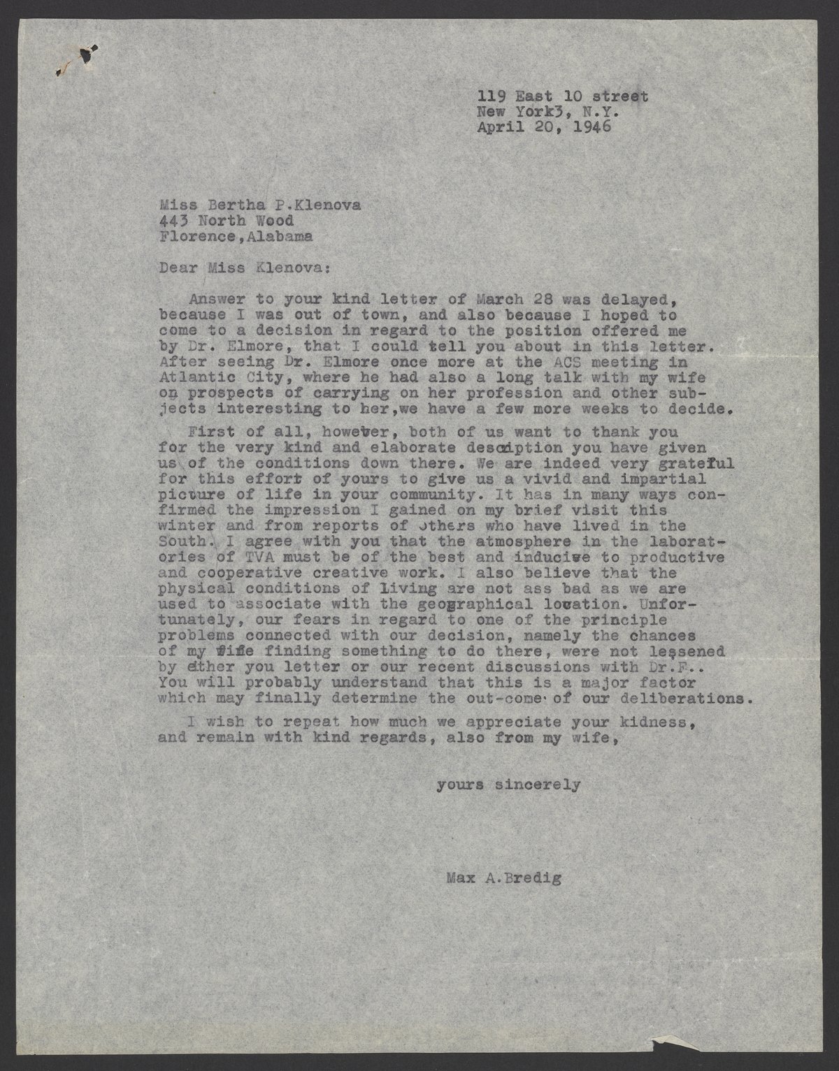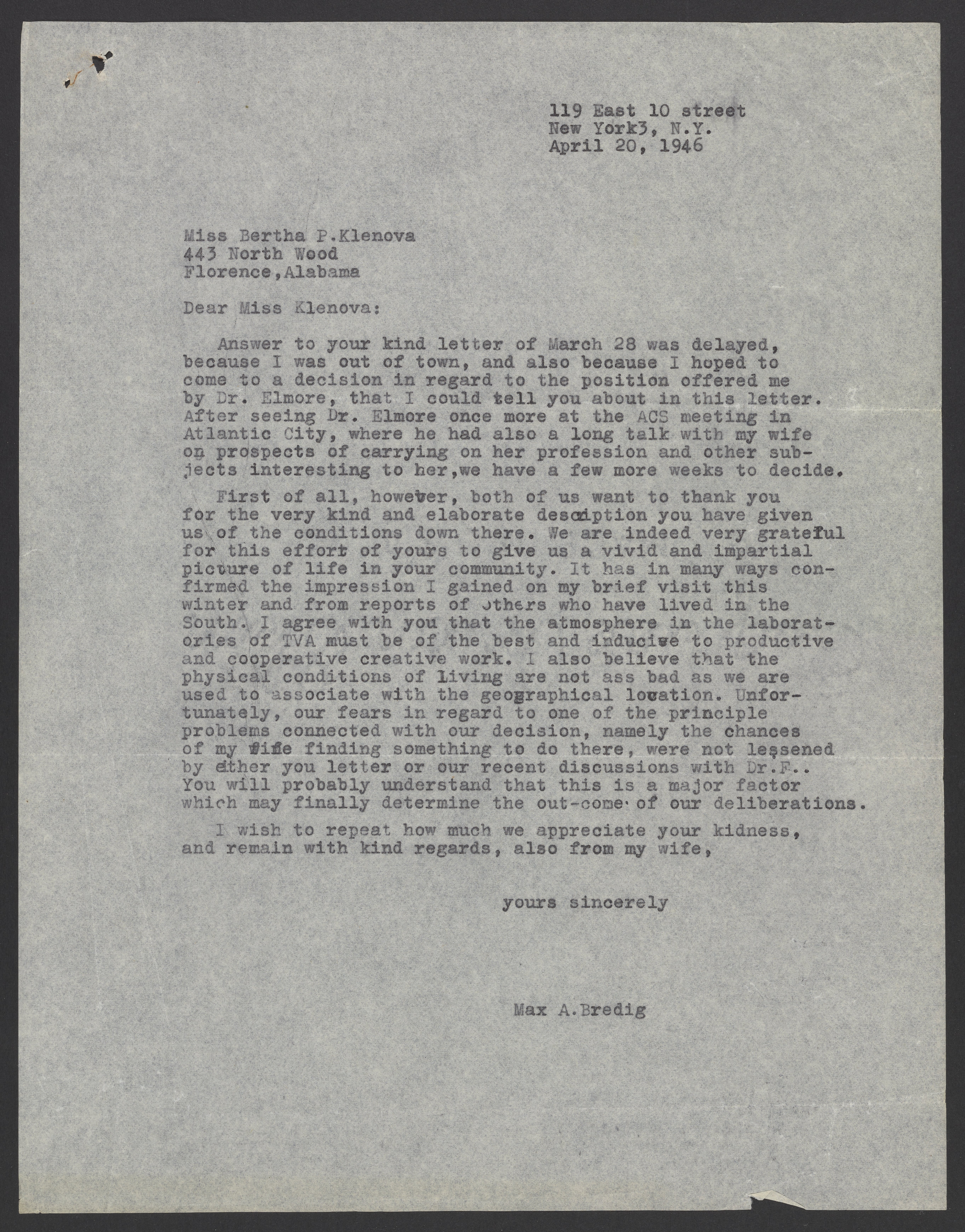 Letter from Max Bredig to Bertha P. Klenova, April 20, 1946