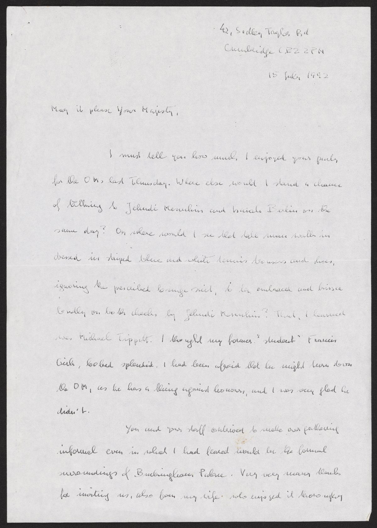 Letter from Max Perutz Queen Elizabeth II, July 15, 1992