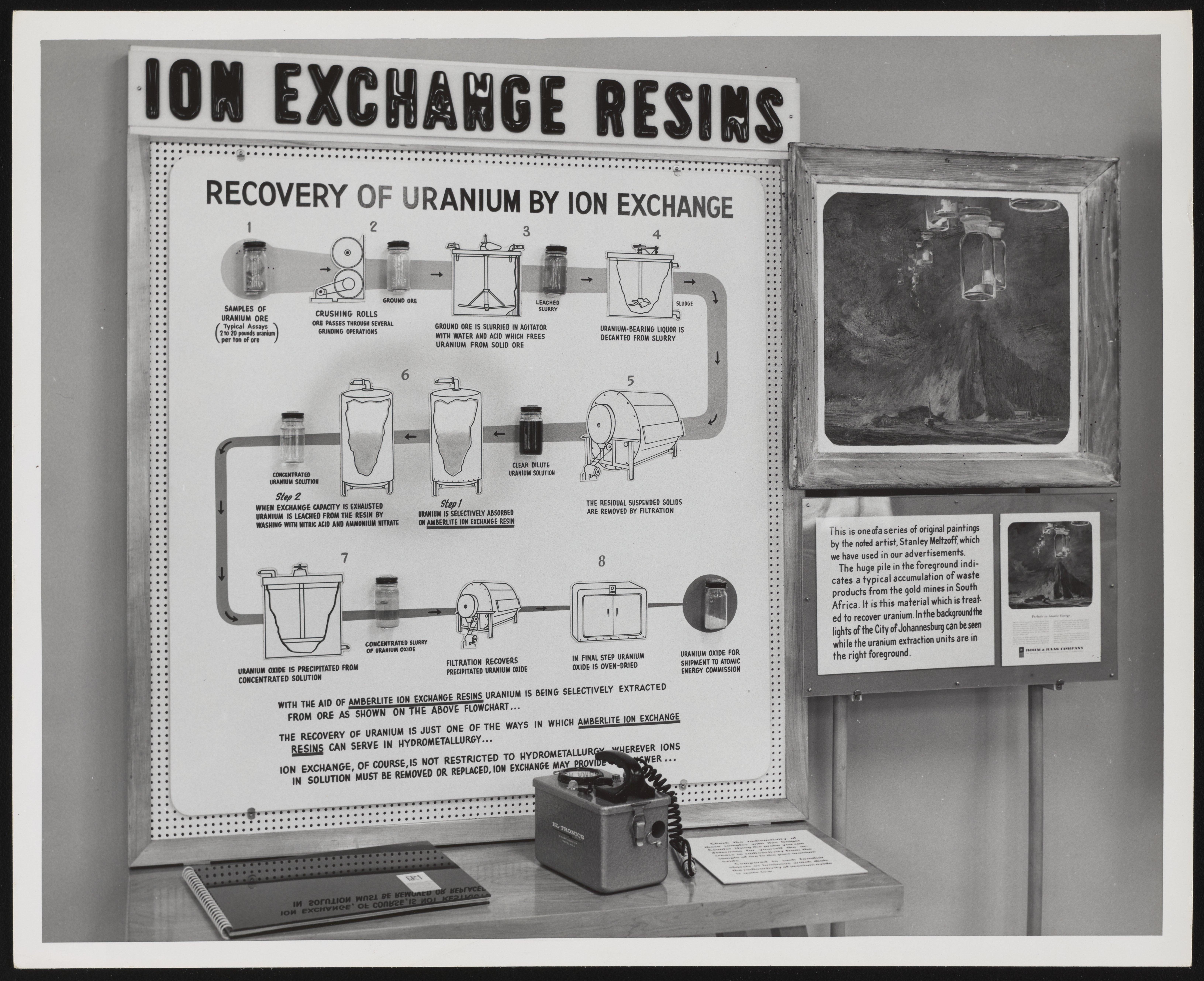 General view of an exhibit panel on ion exchange resins exhibited at the 1956 Rohm and Haas Company stockholders' meeting. The panel features a diagram depicting the process of recovering uranium by ion exchange. The panel is accompanied by a Geiger counter, as well as an original painting by artist Stanley Meltzoff (1917-2006) depicting a typical accumulation of waste products from South African gold mines.