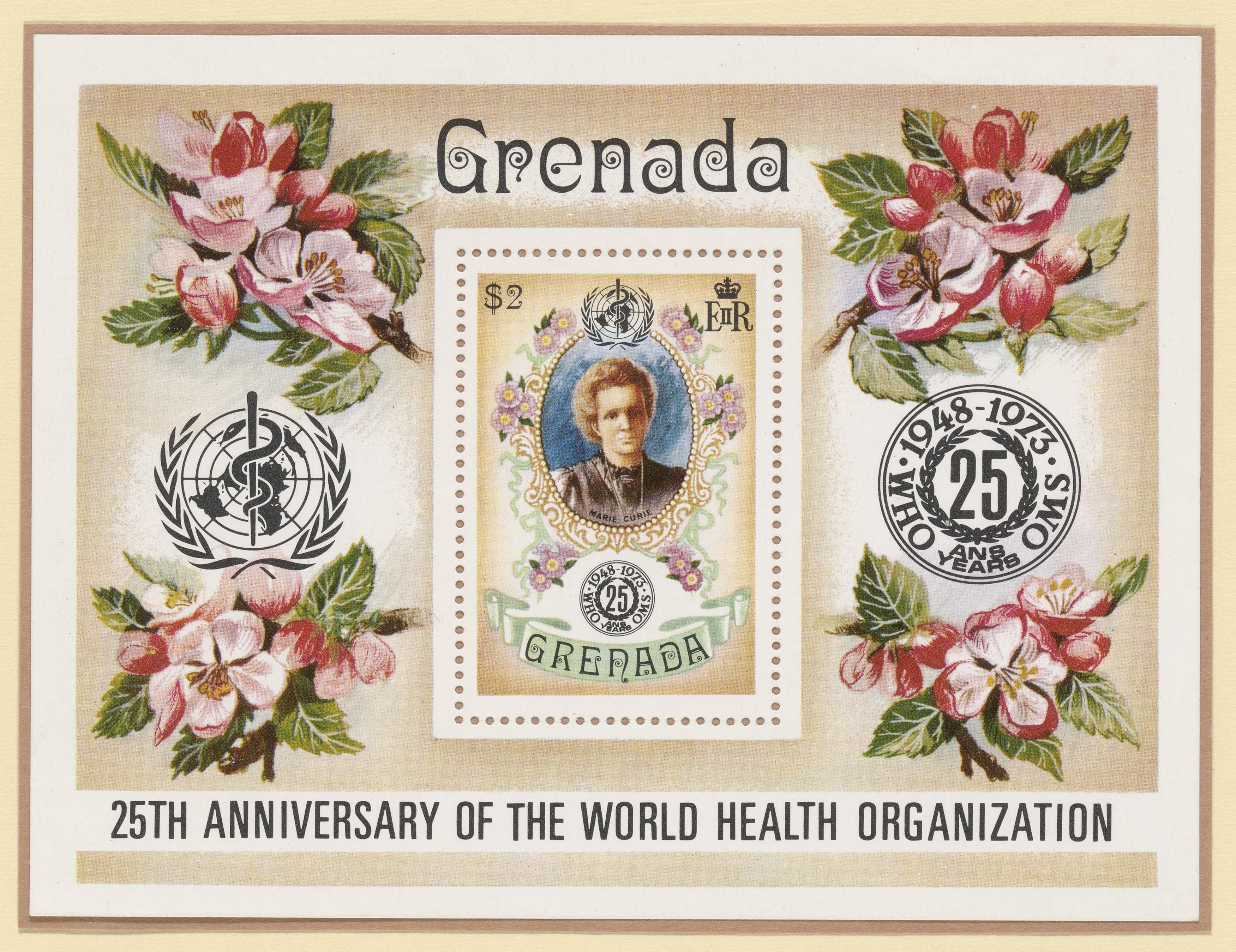 Souvenir sheet stamp commemorating the 25th anniversary of the World Health Organization (WHO). This stamp, issued in Grenada, features a portrait of Marie Skłodowska Curie (1867-1934) with the WHO symbol.