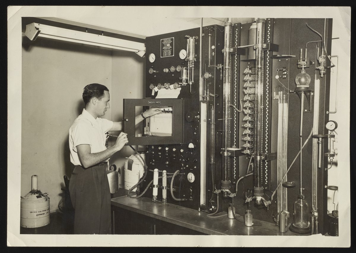 Wiseman, H.O. “Milton G. Guggenheim, Jr. at U.S. Gas Laboratory,” May 17, 1948. Box Small Collections. Science History Institute. Philadelphia. https://digital.sciencehistory.org/works/k3569500q.