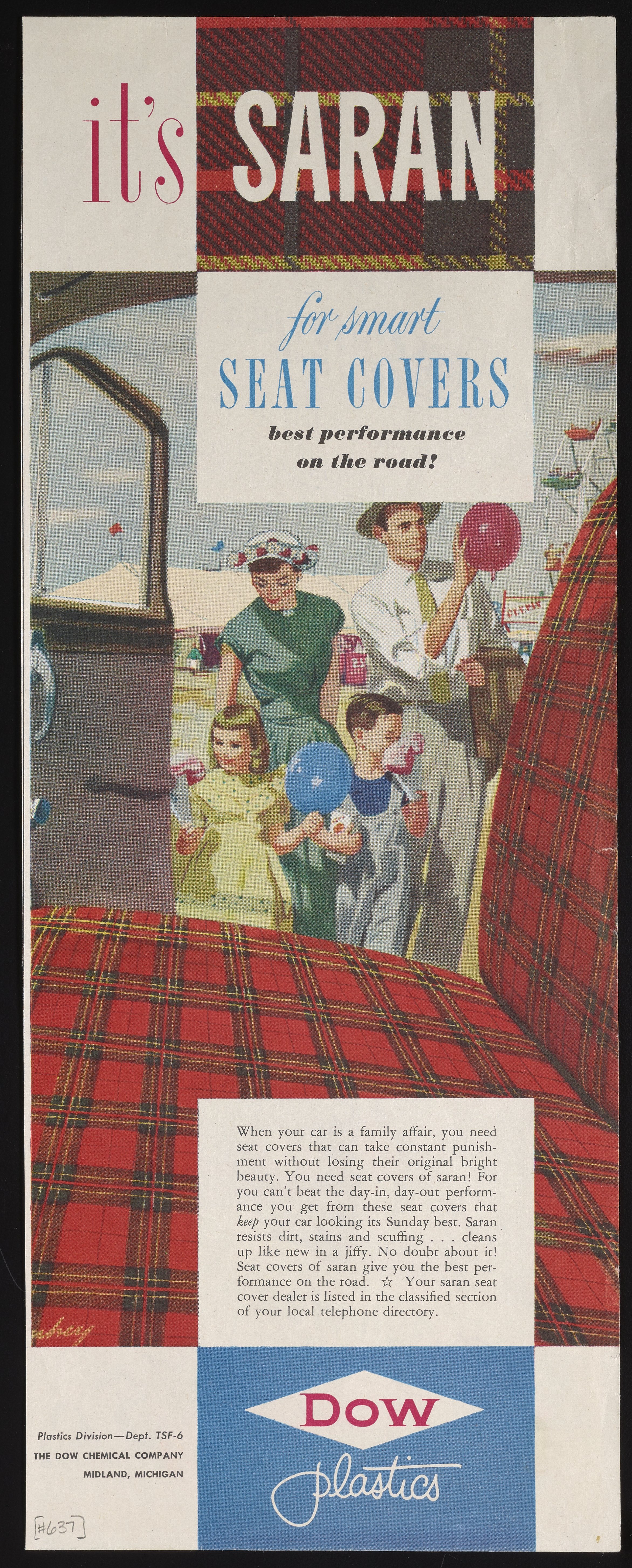 Dow Chemical Company. “It’s Saran for Smart Seat Covers...Best Performance on the Road!,” 1950–1959. Advertisements from the Dow Chemical Historical Collection, Box 9. Science History Institute. Philadelphia. https://digital.sciencehistory.org/works/k442kco.