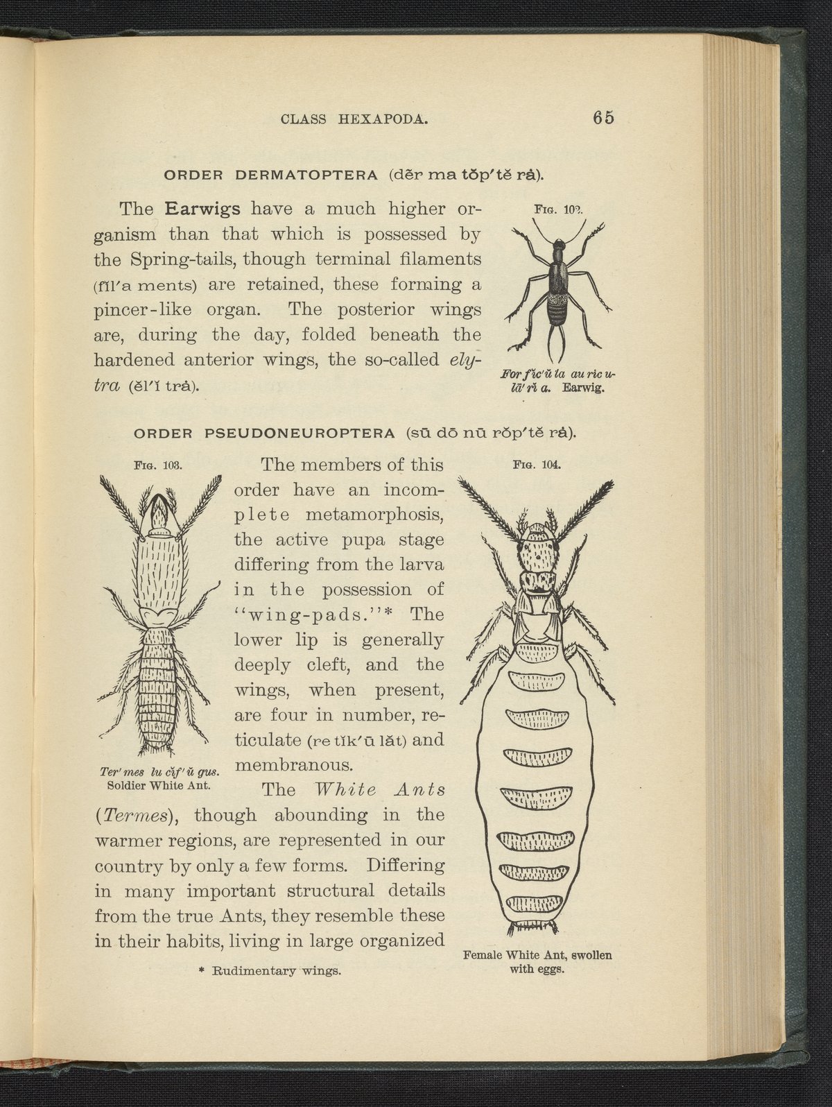 Figures 102, 103, and 104 of the 1887 volume Popular Zoology. Figure 102 depicts an earwig. Figure 103 depicts a soldier white ant. Figure 104 depicts a female soldier white ant swollen with eggs.