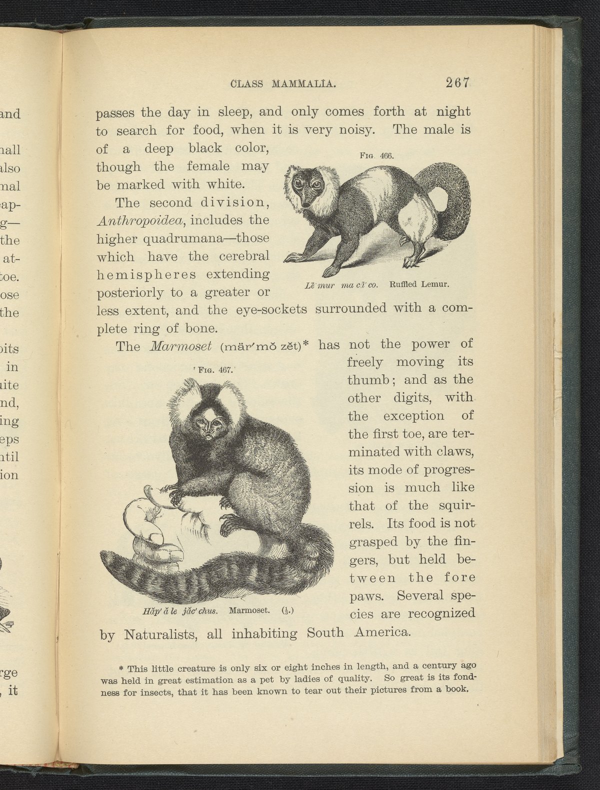Figures 466 and 467 of the 1887 volume Popular Zoology. Figure 466 depicts a ruffled [ruffed] lemur. Figure 467 depicts a marmoset.