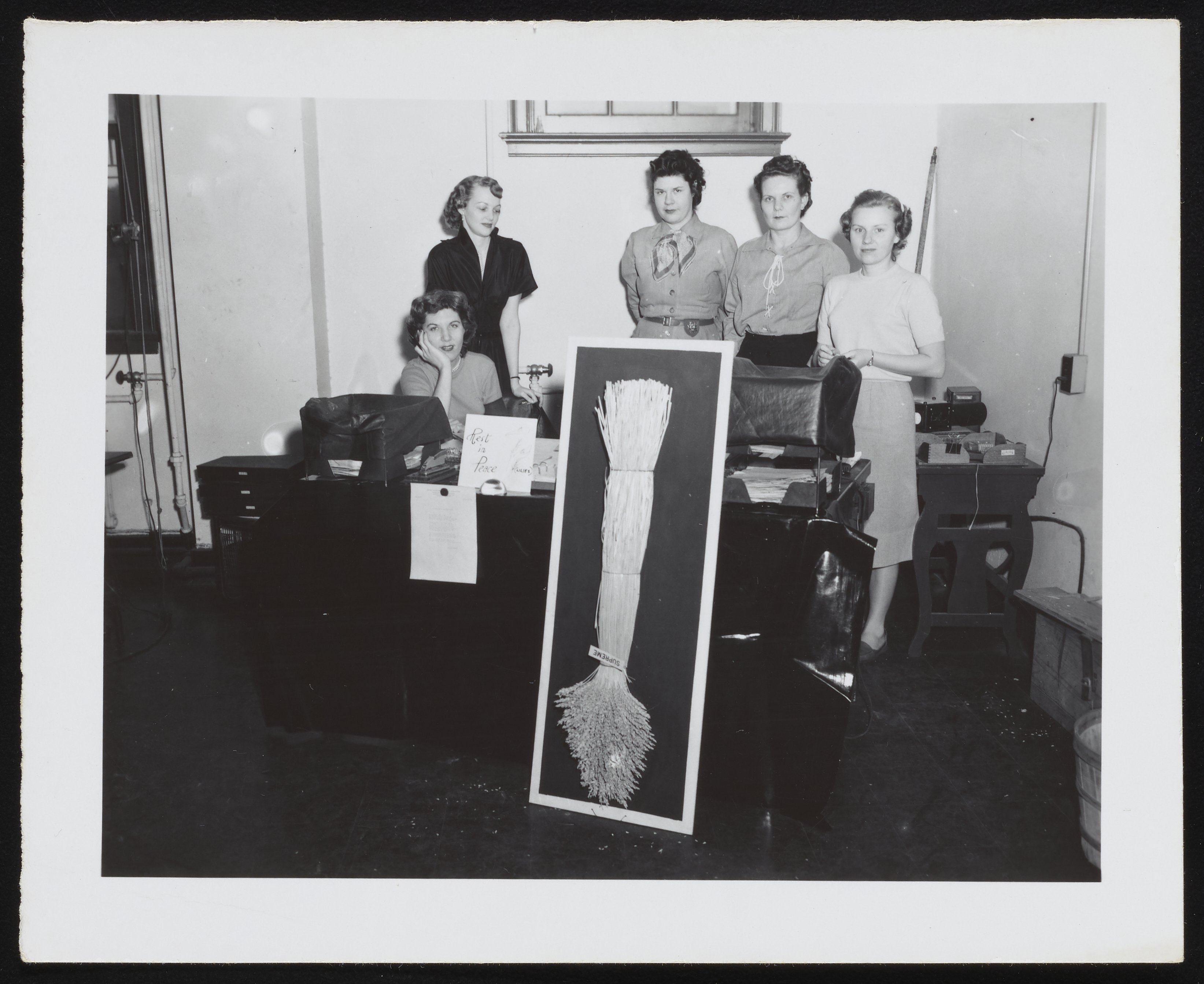 Group photograph of unidentified female personnel at an unidentified United States Department of Agriculture facility. A large board bearing a sheaf of wheat is visible in front of the group.