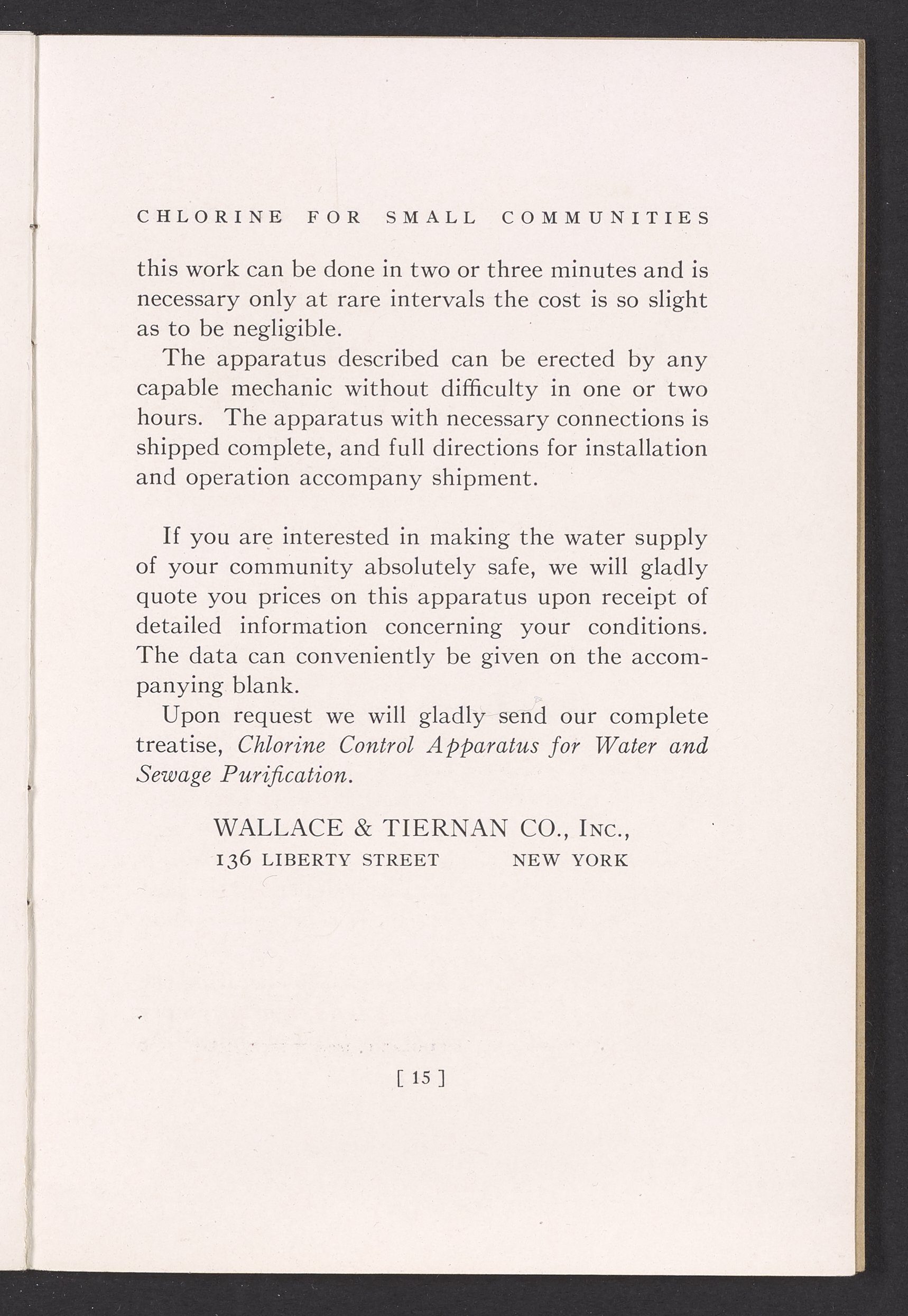 Wallace & Tiernan Company. “Water Purification by Liquid Chlorine for Small Communities.” New York (State): Wallace & Tiernan Company, 1917. TD468 .W35 1917. Science History Institute. Philadelphia. https://digital.sciencehistory.org/works/k64mxav.
