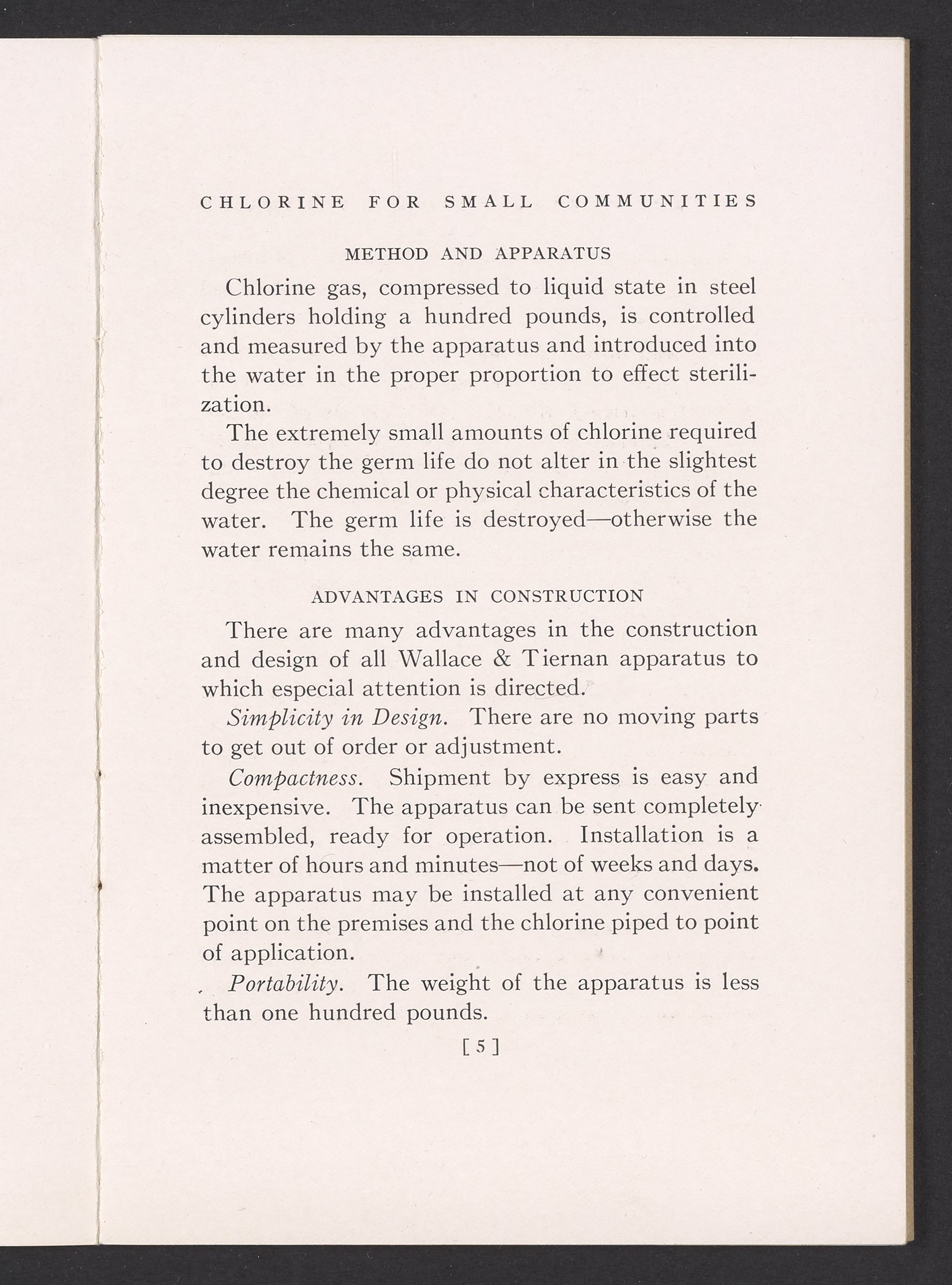Small JPG1200 x 1731px — 362 KBFull-sized JPG1725 x 2488px — 711 KBOriginal fileTIFF — 1725 x 2488px — 12.3 MBTechnical publication pamphlet providing information regarding the Wallace & Tiernan Co., Inc. manual control chlorinator apparatus. Discusses the sterilization of water by chlorination and the advantages of using liquid chlorine for this purpose. The majority of the publication describes the mechanical construction and technical specifications of the control chlorinator apparatus. Includes diagrams of the apparatus and a photographic print. The work is digitized in its entirety.