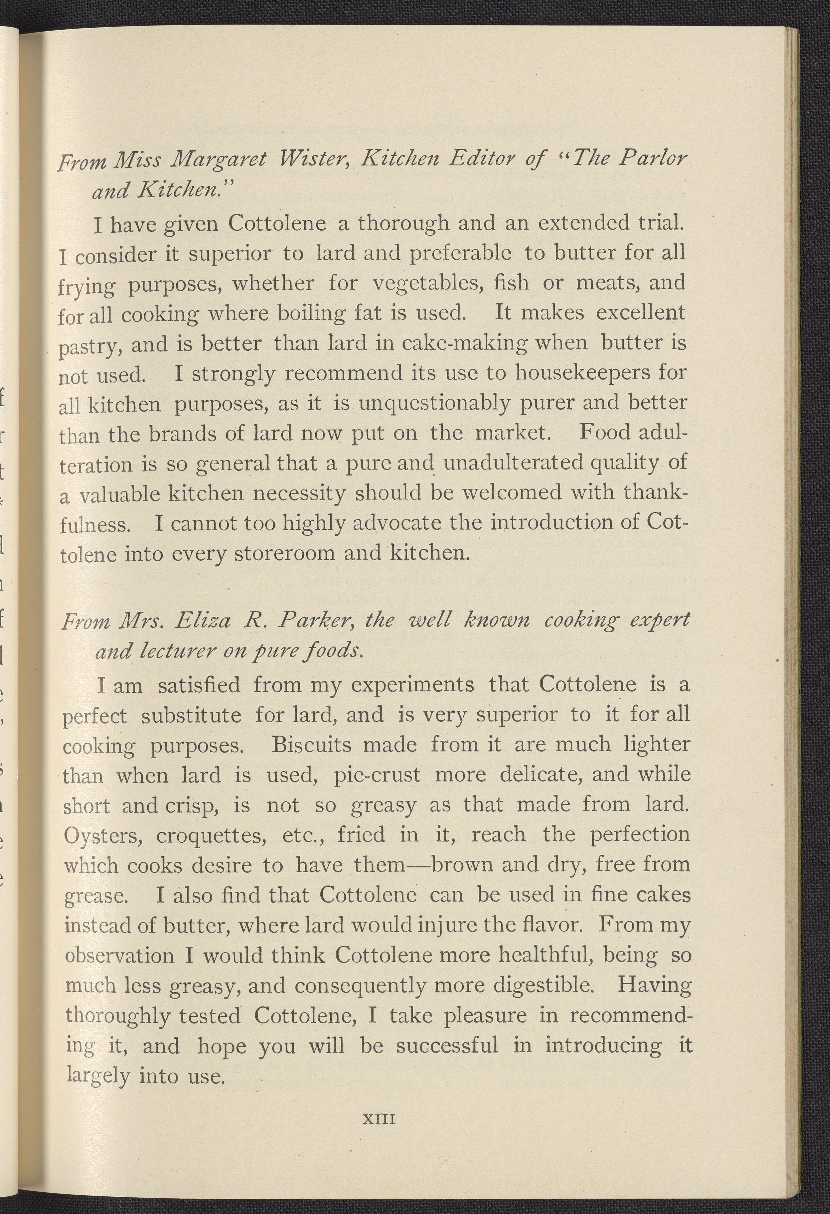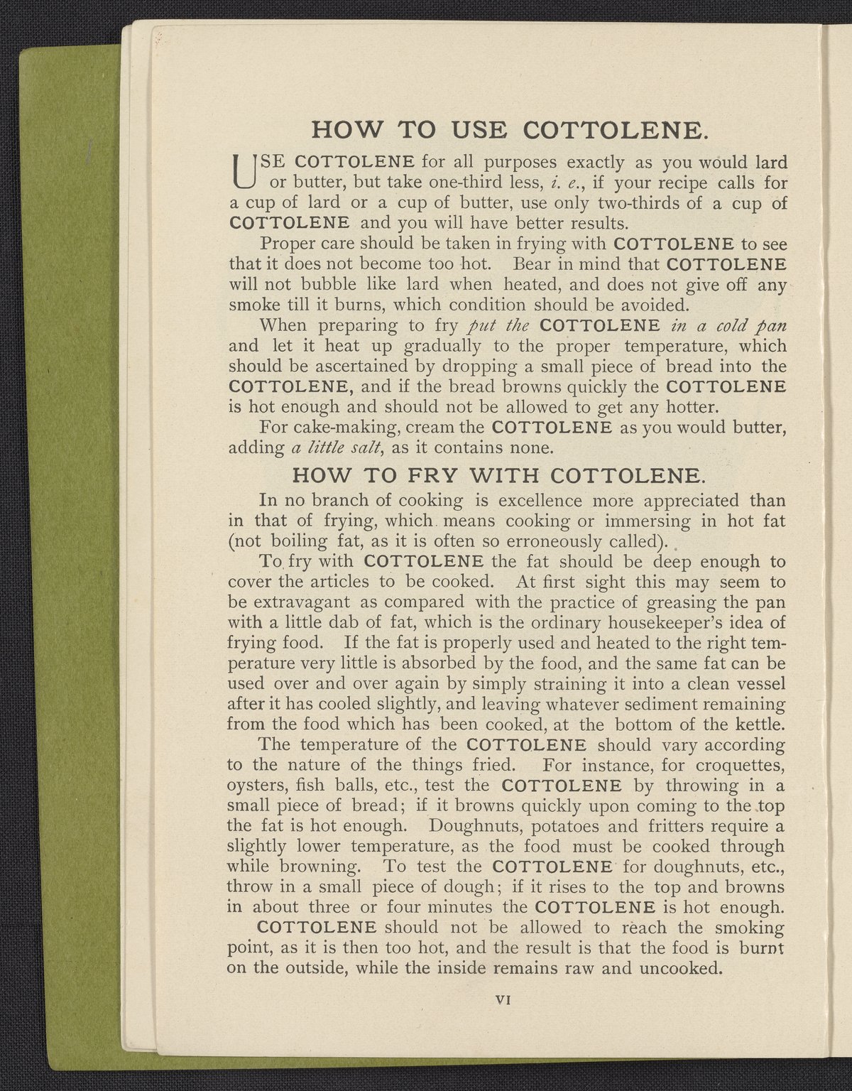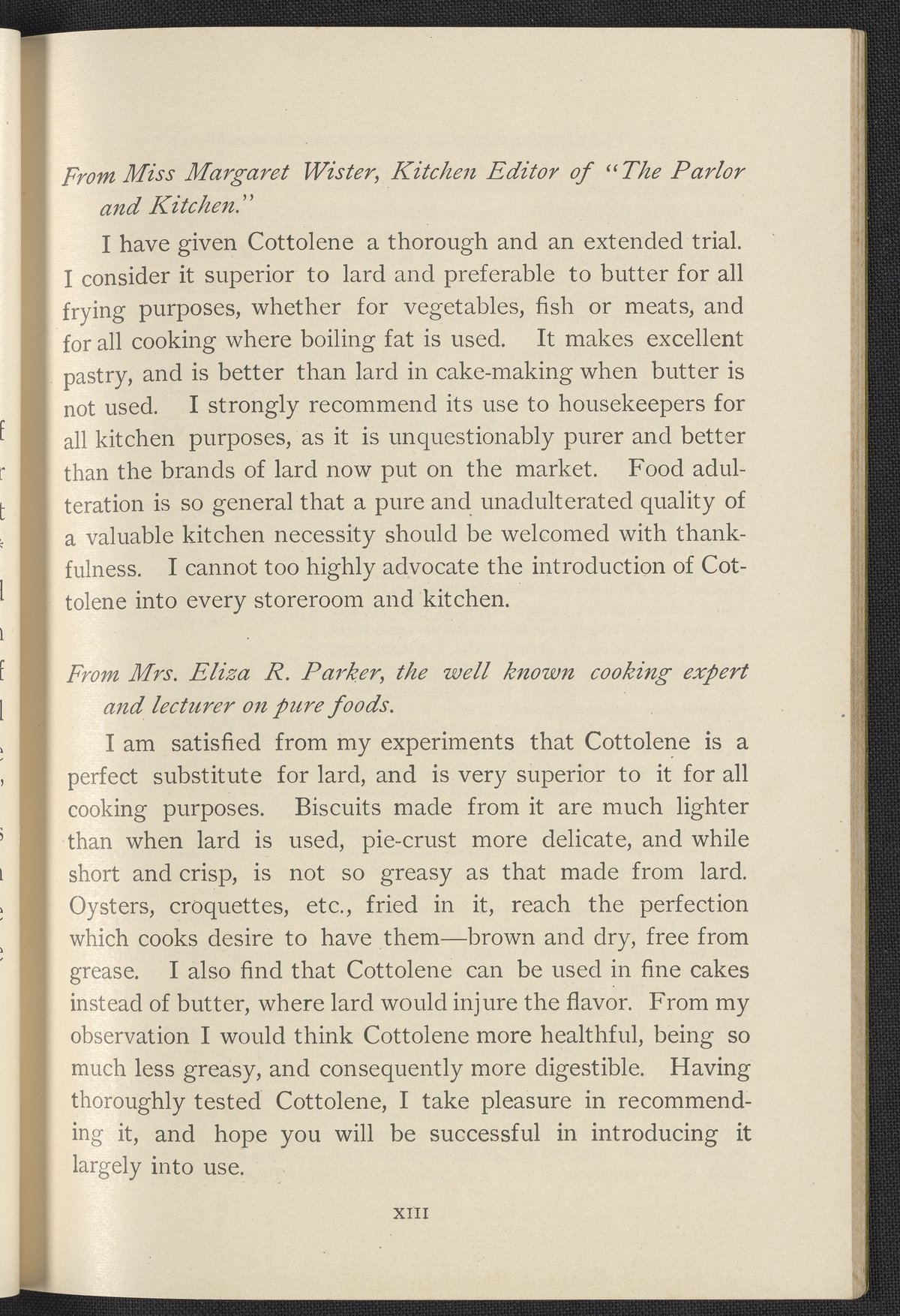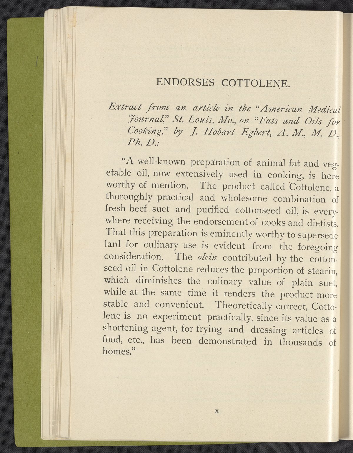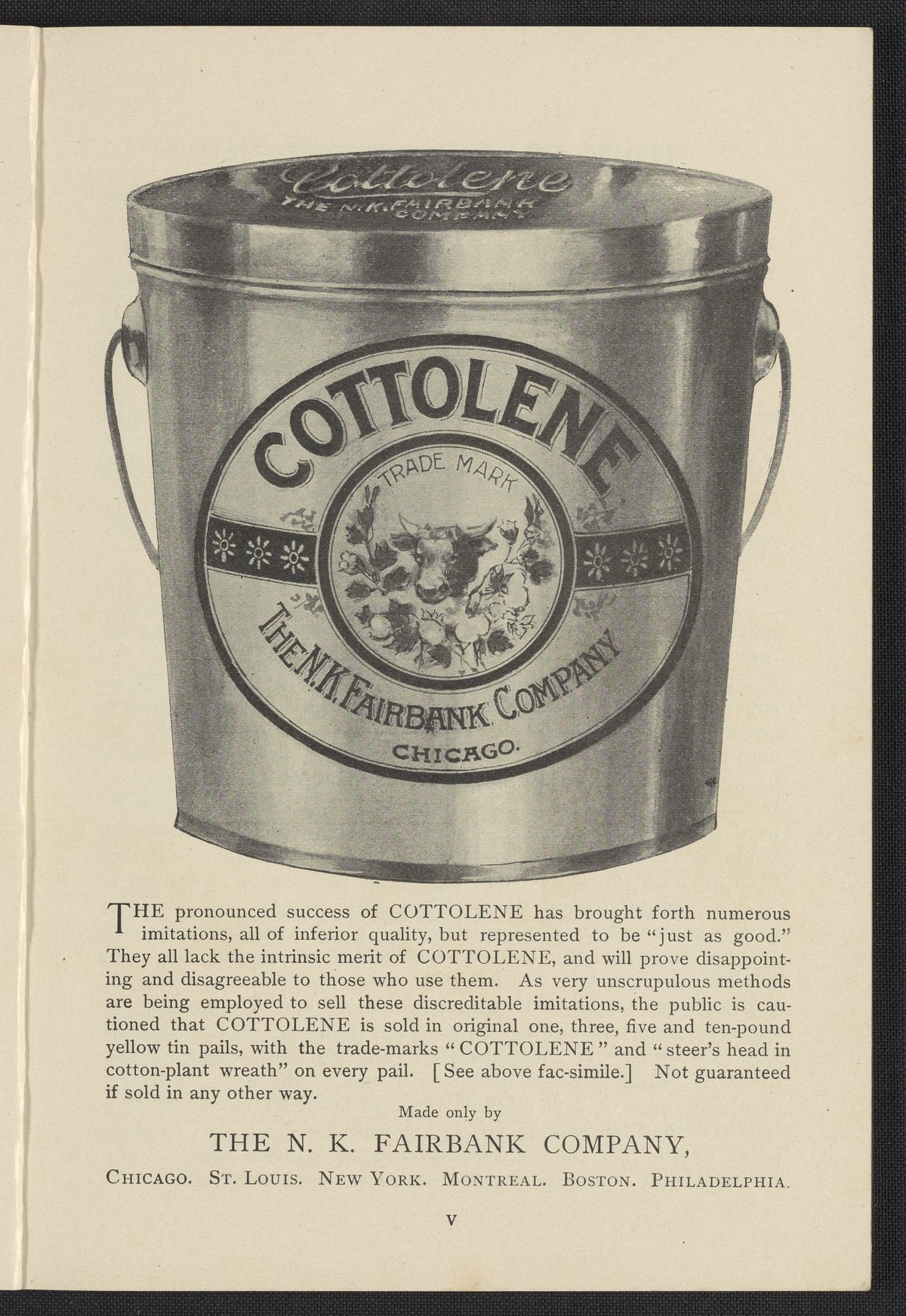 Small JPG1200 x 1648px — 361 KBLarge JPG2880 x 3956px — 2.1 MBFull-sized JPG3266 x 4486px — 2.7 MBOriginal fileTIFF — 3266 x 4486px — 42.0 MBA collection of recipes using Cottolene, a brand of shortening made from beef tallow and cottonseed oil, that was manufactured by the N. K. Fairbank Company. Cottolene was produced from 1868 until the mid-20th century. Many cookbooks, such as this one, were written to promote its use. Advertisements for other products are interspersed throughout.