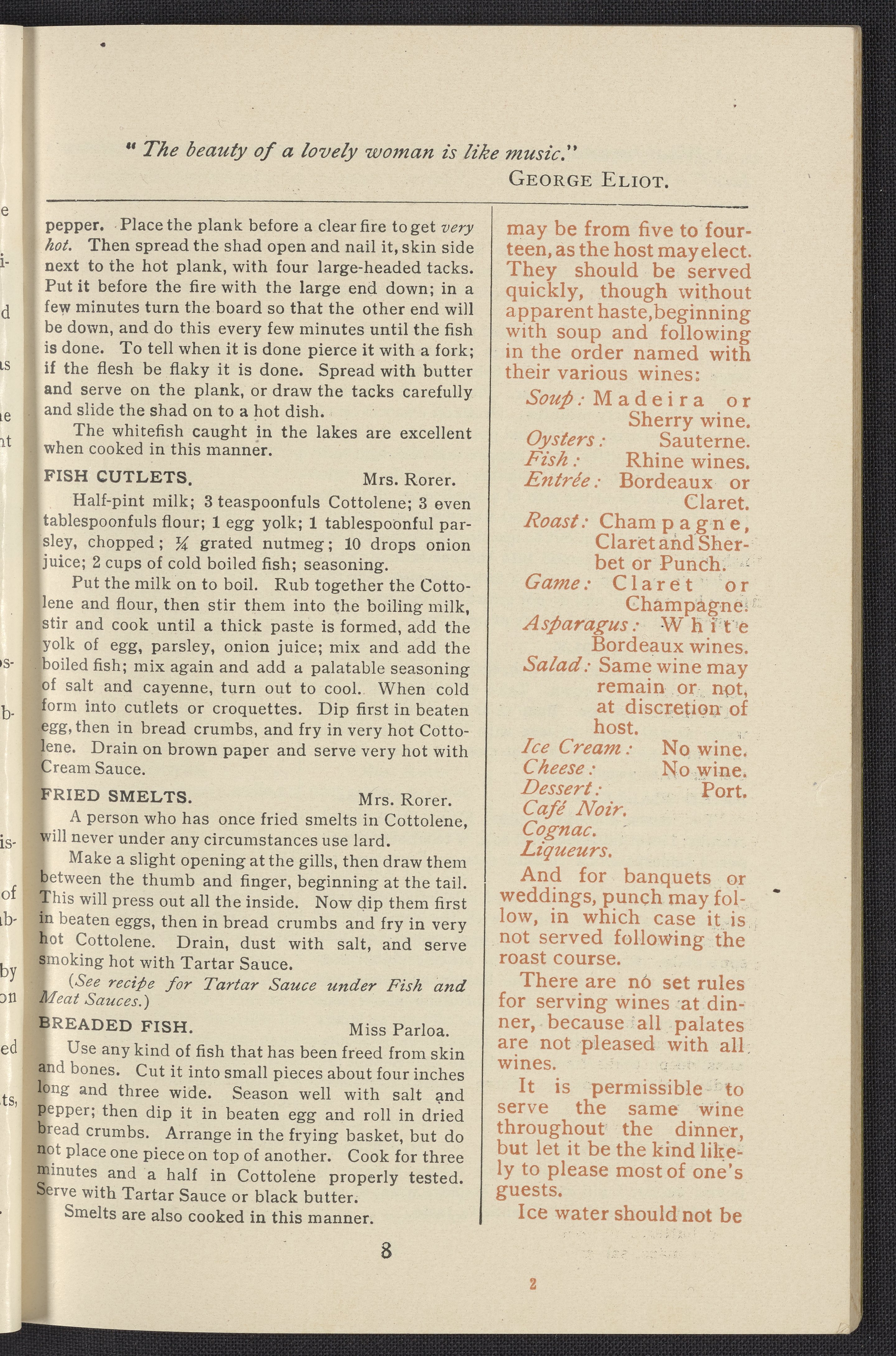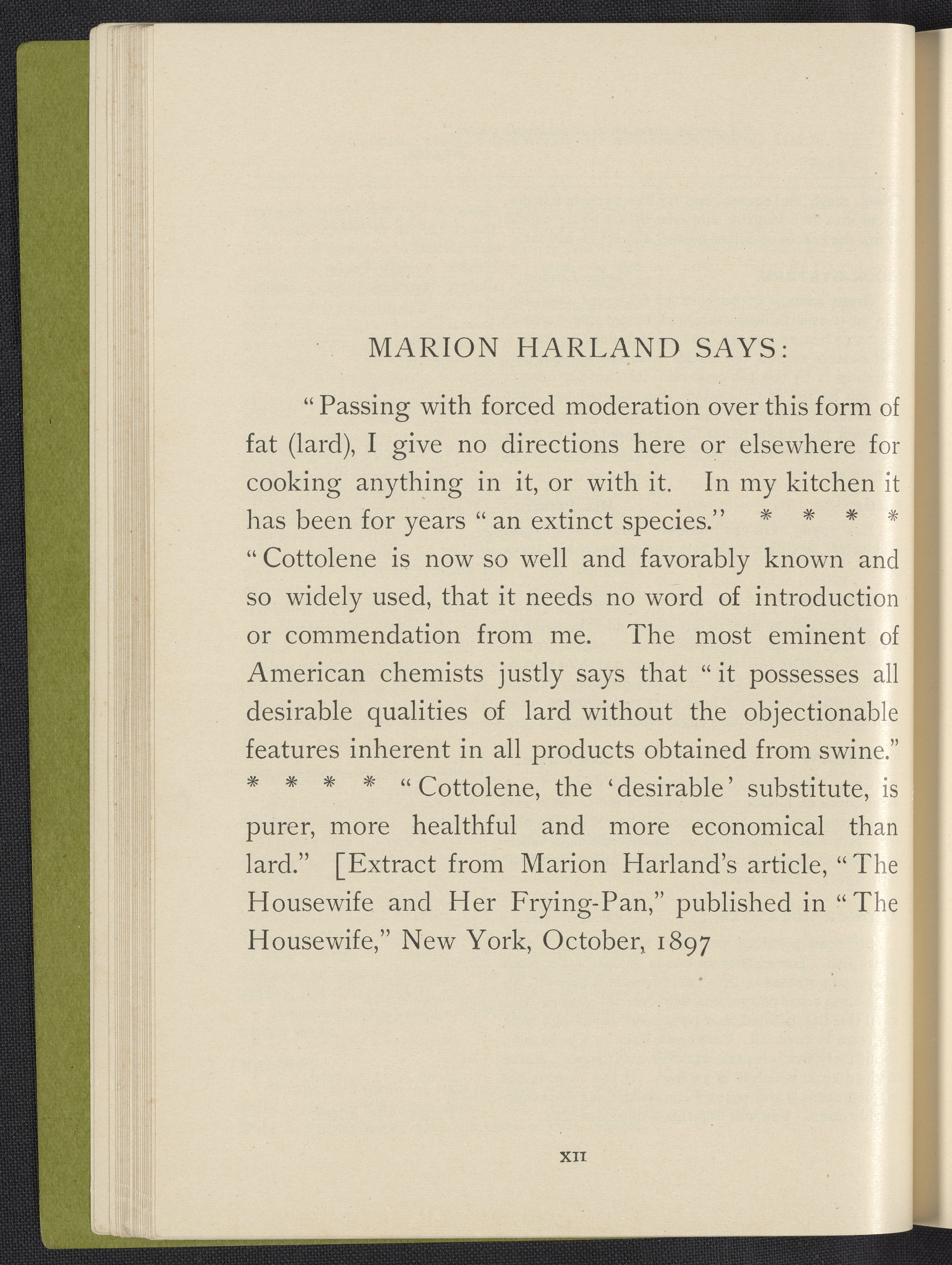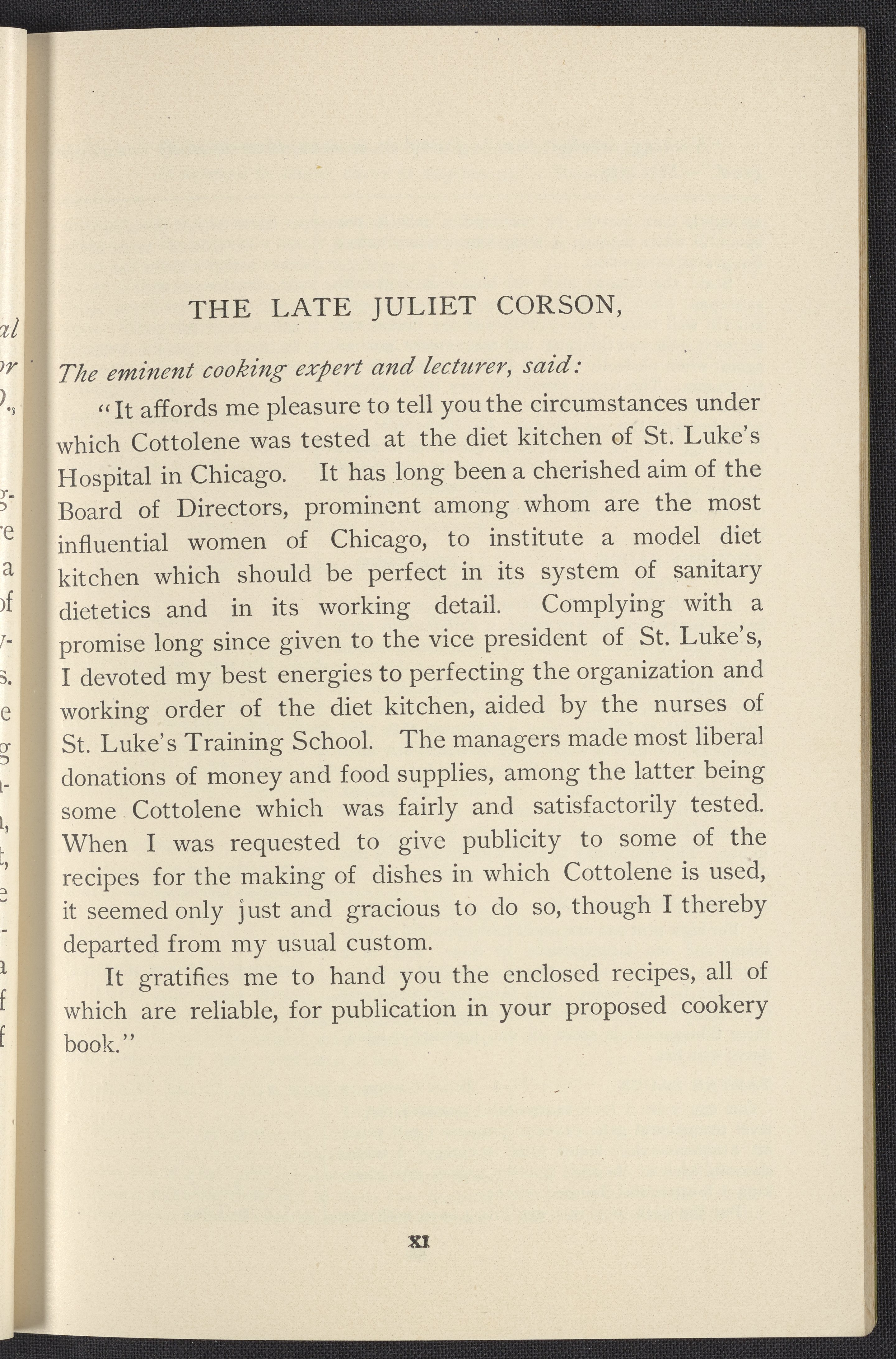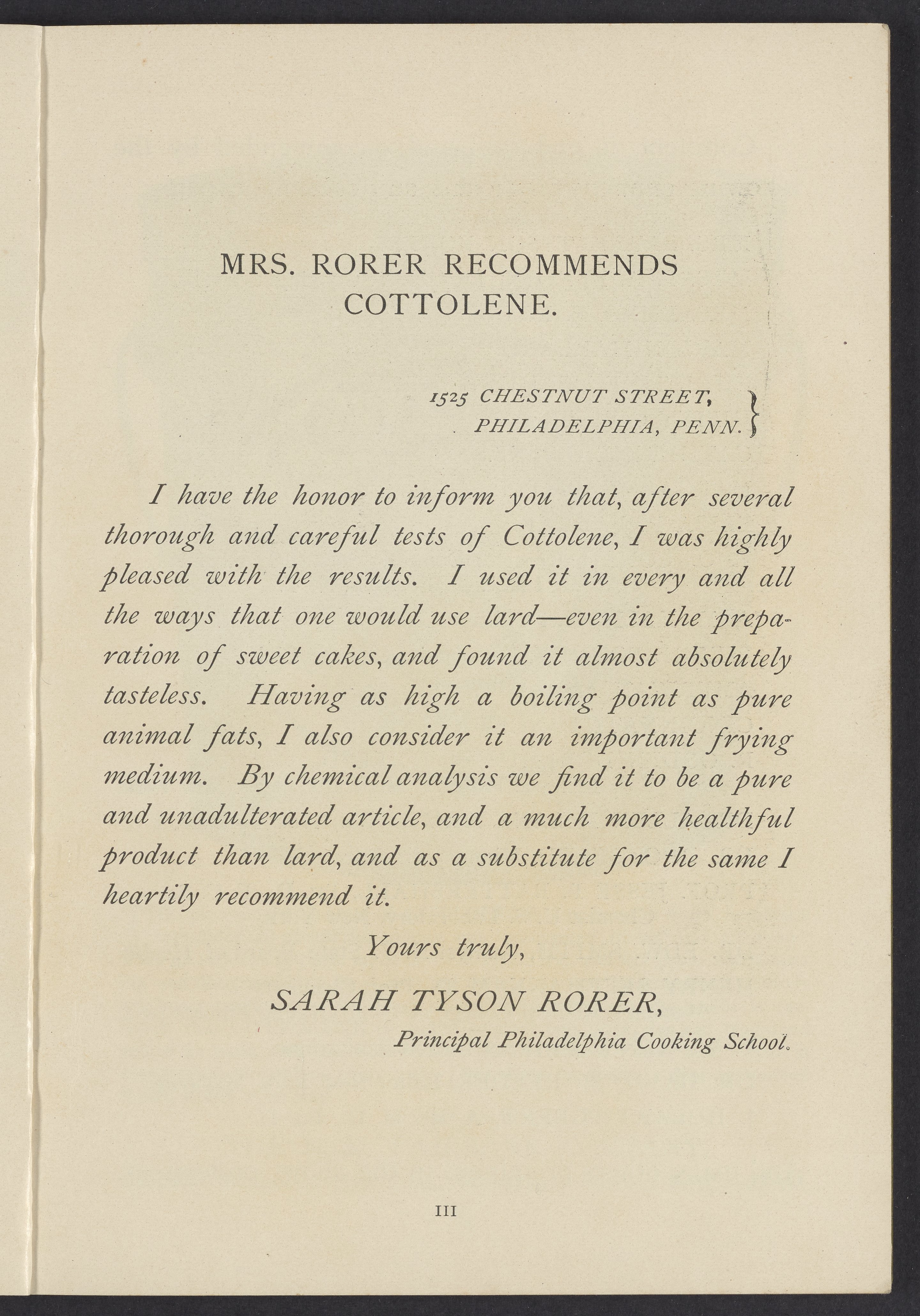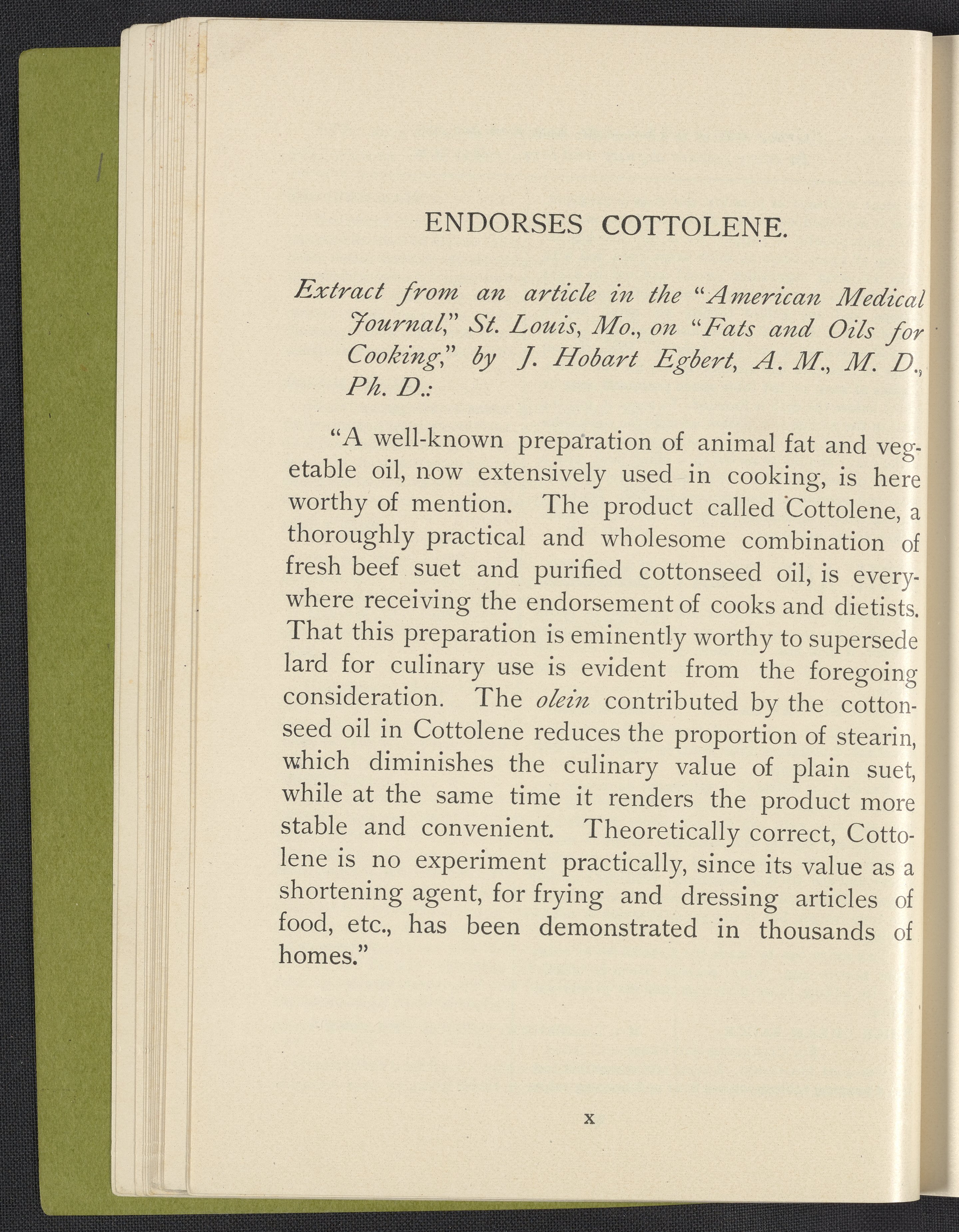 Small JPG1200 x 1648px — 361 KBLarge JPG2880 x 3956px — 2.1 MBFull-sized JPG3266 x 4486px — 2.7 MBOriginal fileTIFF — 3266 x 4486px — 42.0 MBA collection of recipes using Cottolene, a brand of shortening made from beef tallow and cottonseed oil, that was manufactured by the N. K. Fairbank Company. Cottolene was produced from 1868 until the mid-20th century. Many cookbooks, such as this one, were written to promote its use. Advertisements for other products are interspersed throughout.