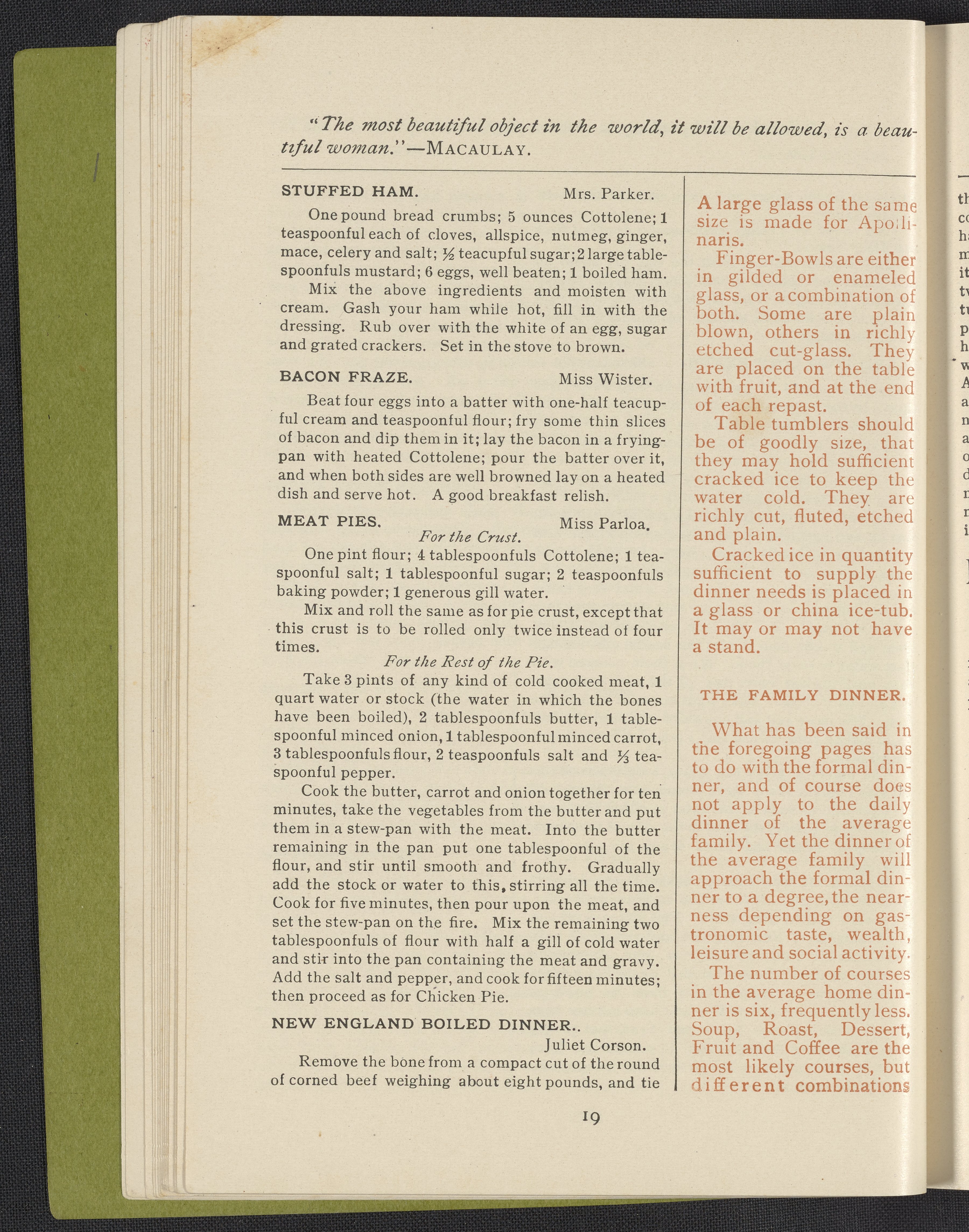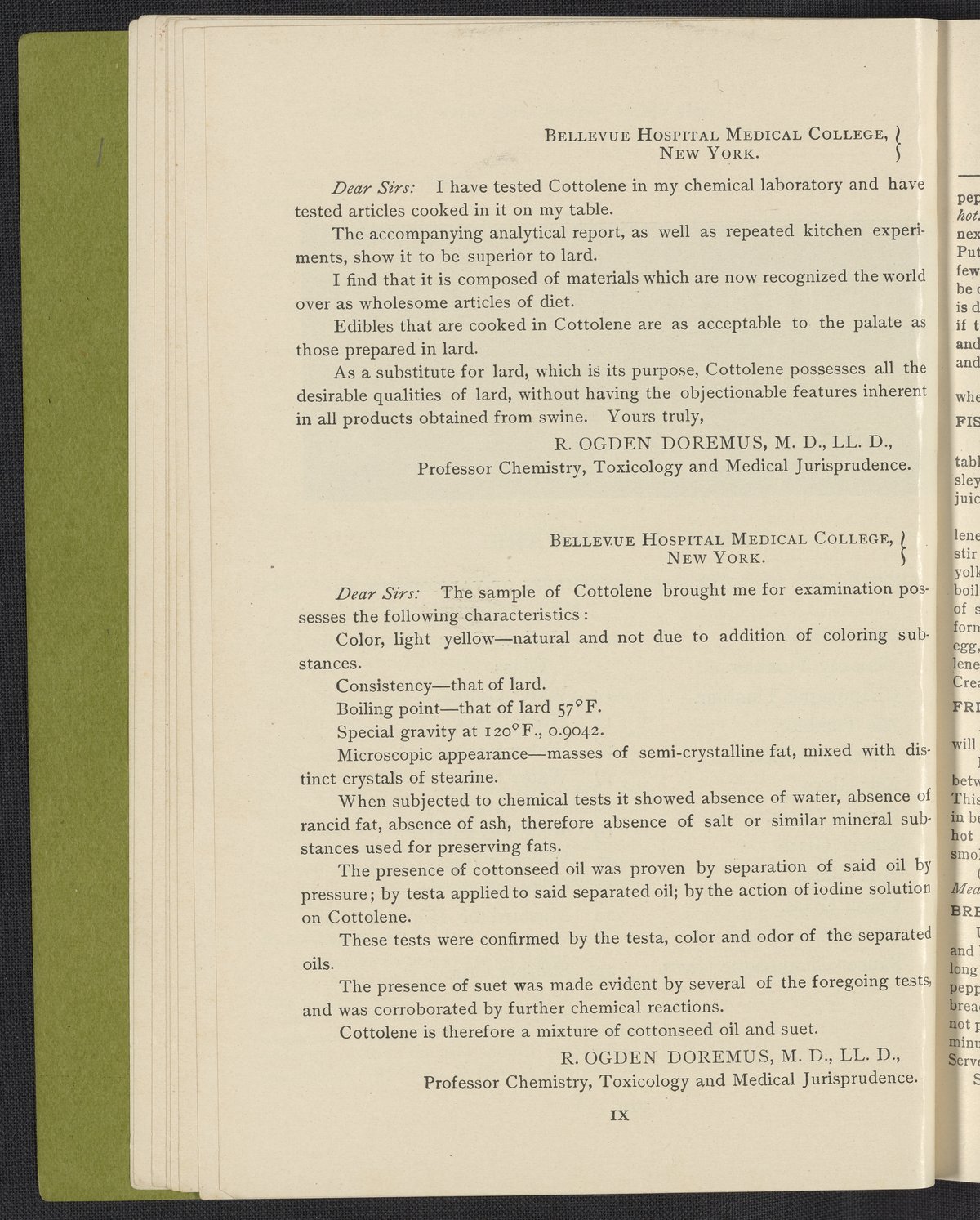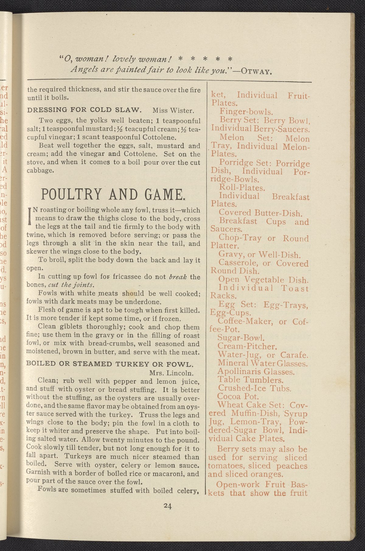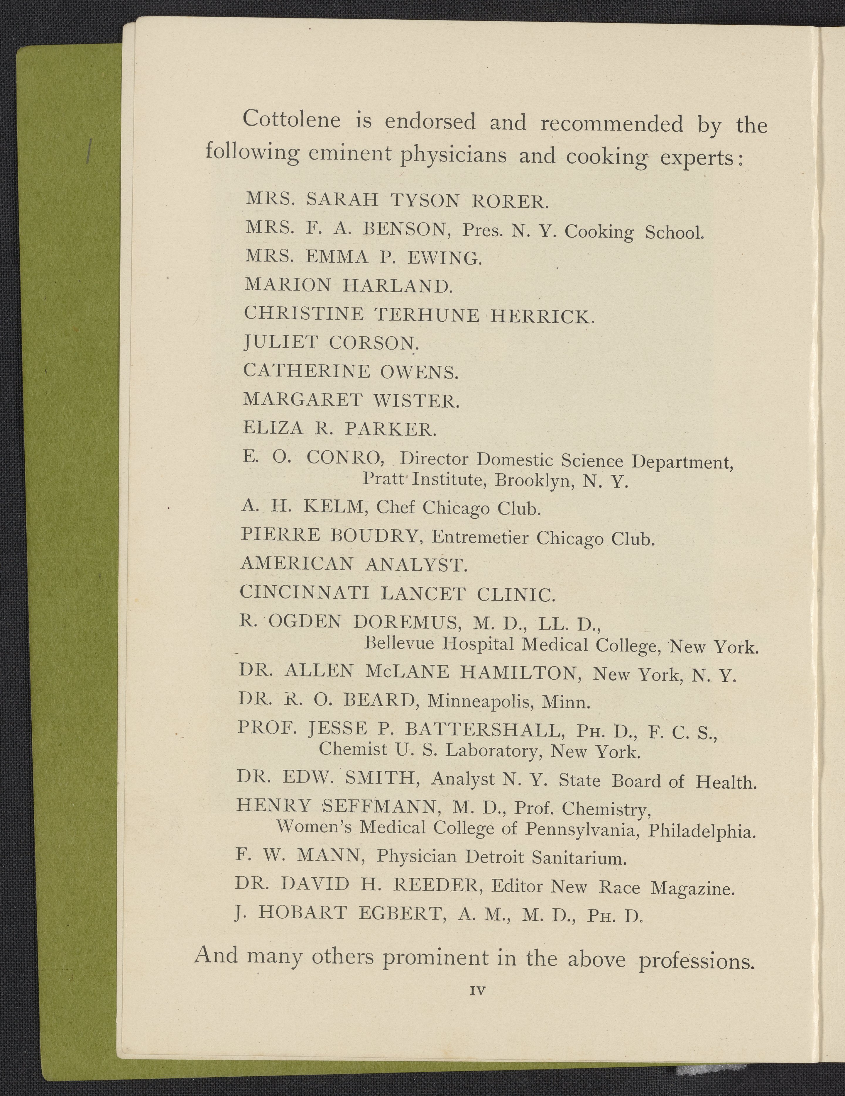 Small JPG1200 x 1648px — 361 KBLarge JPG2880 x 3956px — 2.1 MBFull-sized JPG3266 x 4486px — 2.7 MBOriginal fileTIFF — 3266 x 4486px — 42.0 MBA collection of recipes using Cottolene, a brand of shortening made from beef tallow and cottonseed oil, that was manufactured by the N. K. Fairbank Company. Cottolene was produced from 1868 until the mid-20th century. Many cookbooks, such as this one, were written to promote its use. Advertisements for other products are interspersed throughout.