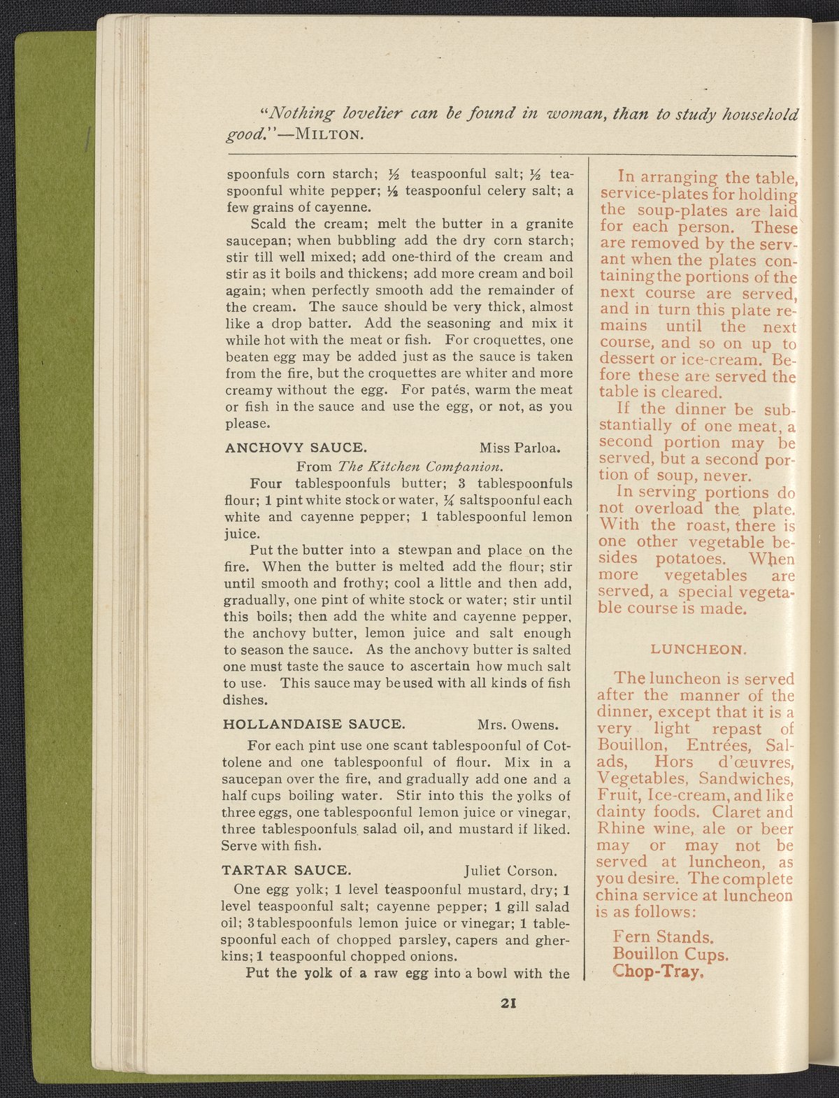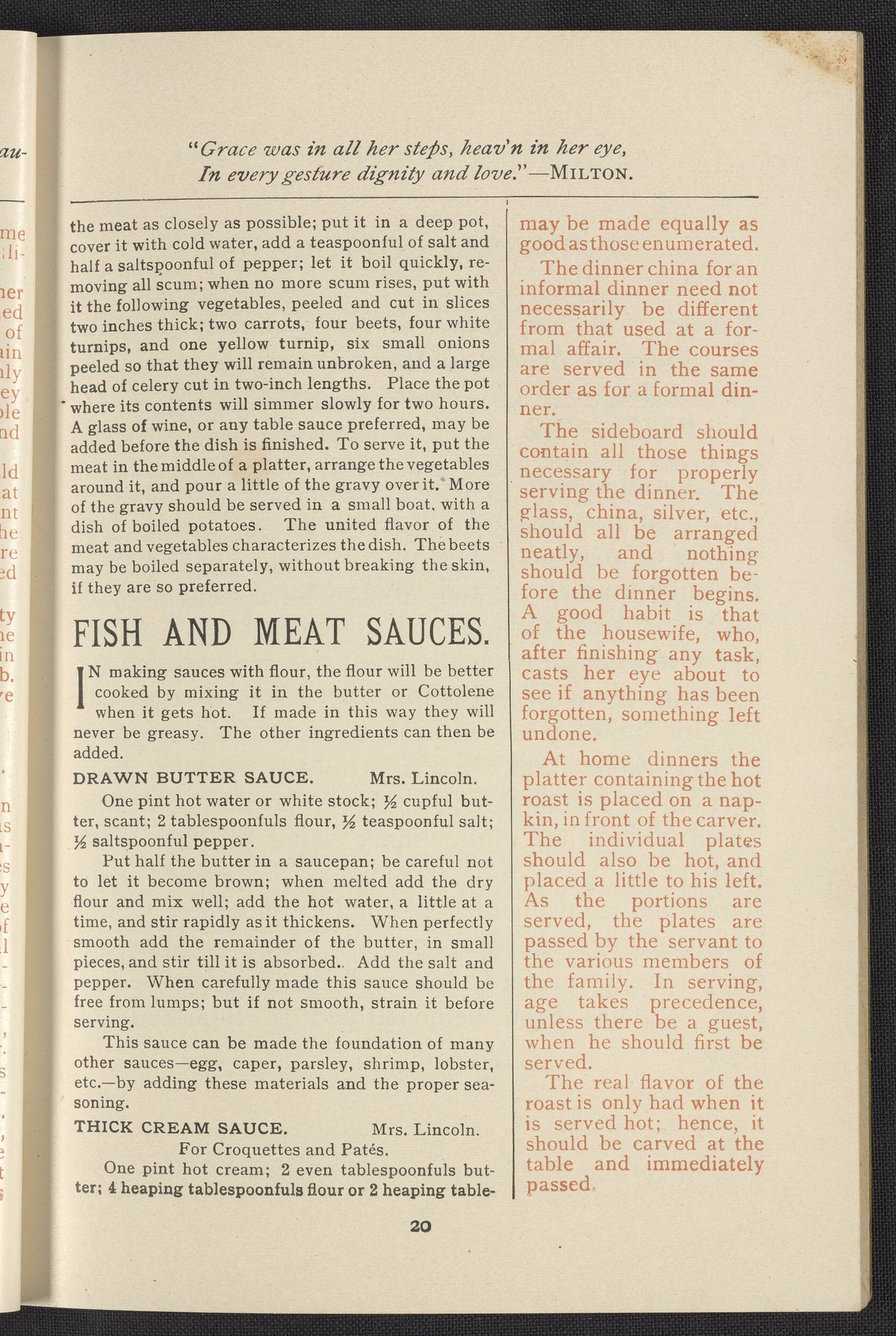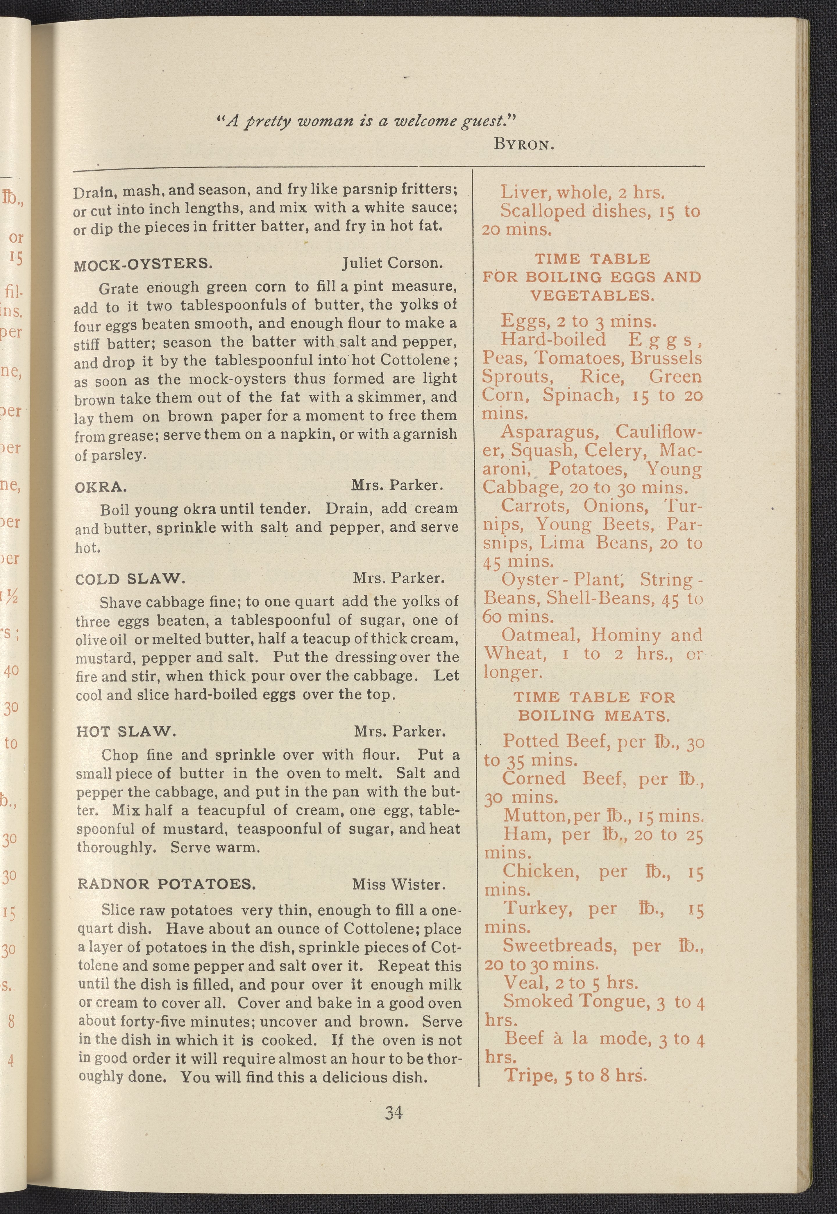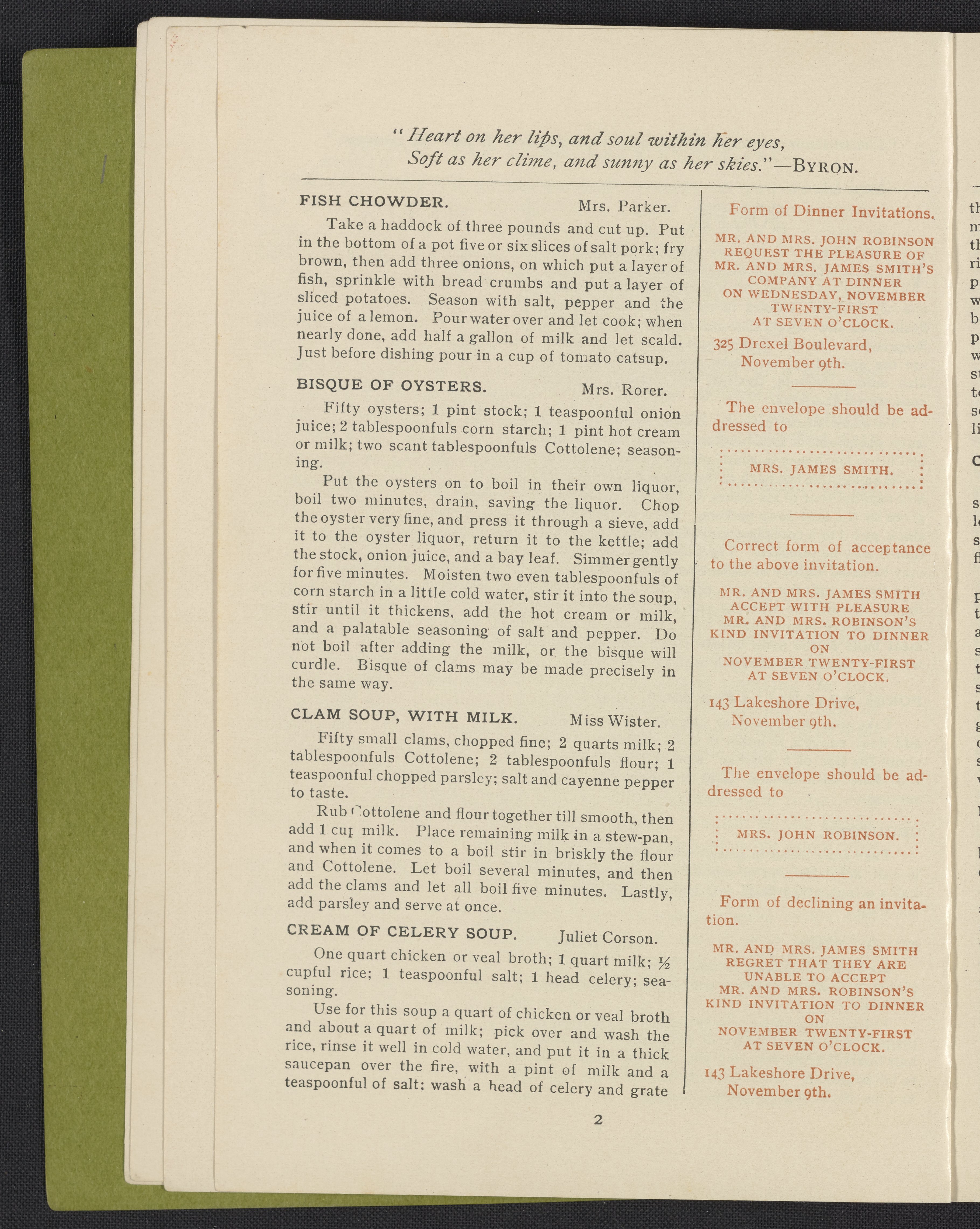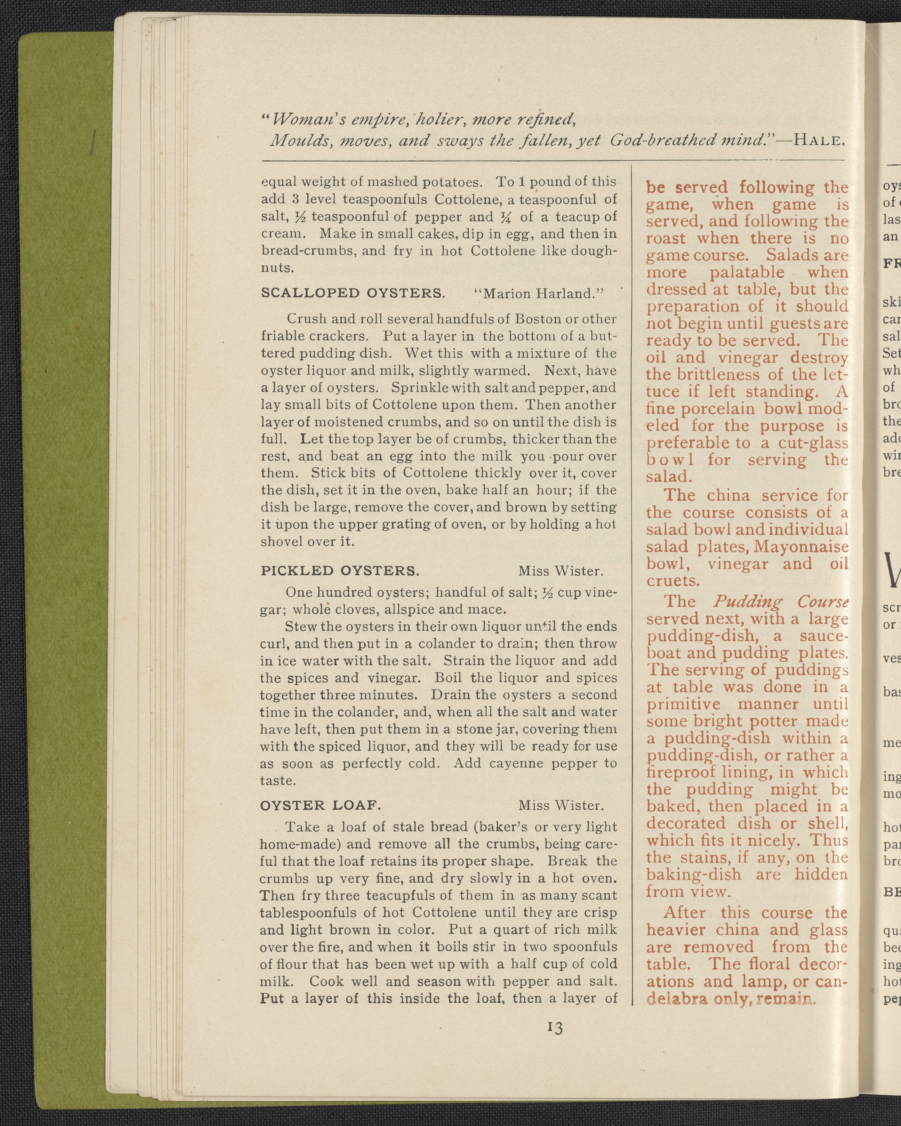 Small JPG1200 x 1648px — 361 KBLarge JPG2880 x 3956px — 2.1 MBFull-sized JPG3266 x 4486px — 2.7 MBOriginal fileTIFF — 3266 x 4486px — 42.0 MBA collection of recipes using Cottolene, a brand of shortening made from beef tallow and cottonseed oil, that was manufactured by the N. K. Fairbank Company. Cottolene was produced from 1868 until the mid-20th century. Many cookbooks, such as this one, were written to promote its use. Advertisements for other products are interspersed throughout.