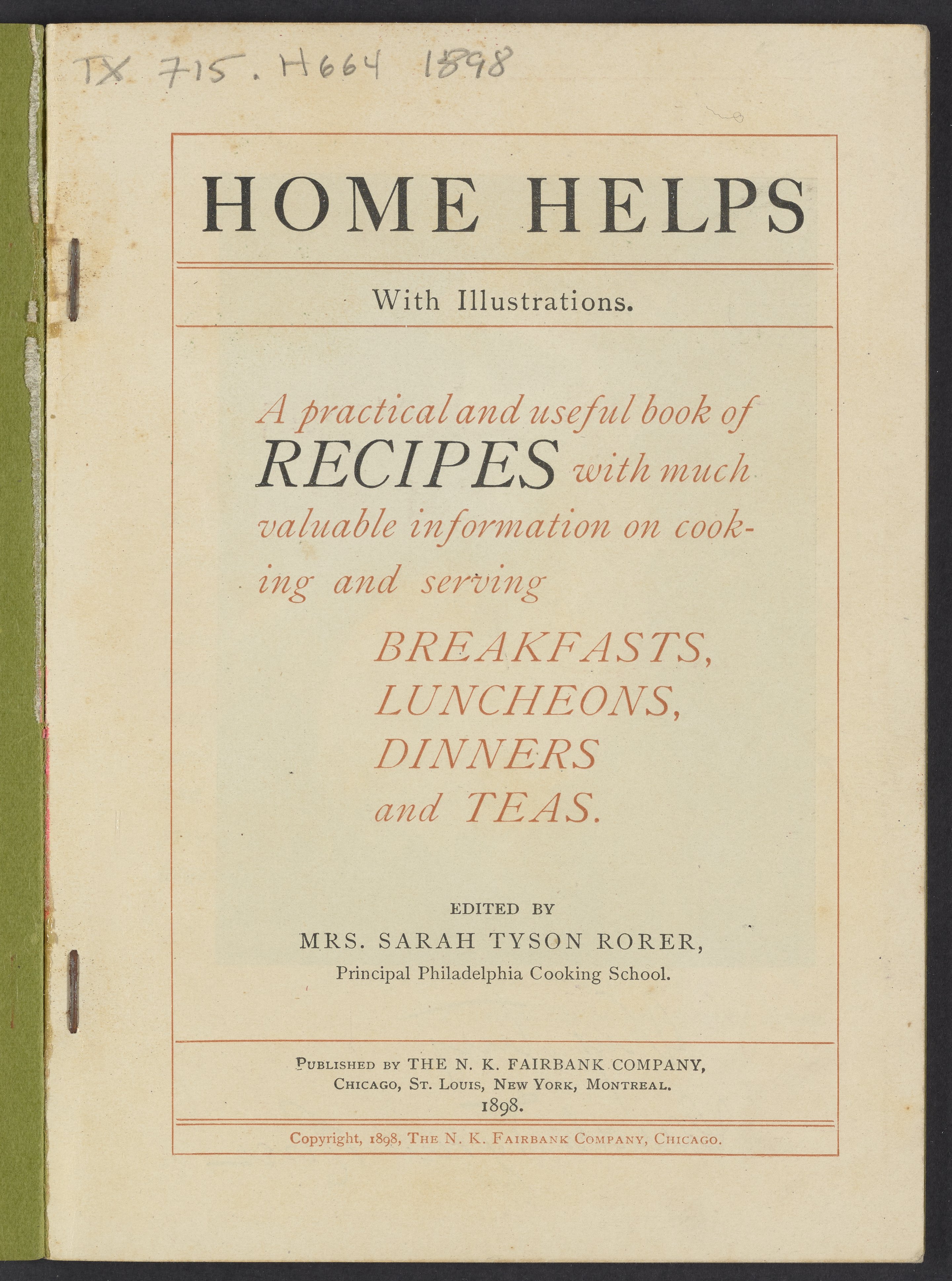 “Home Helps.” Chicago, Illinois: N.K. Fairbank Company, 1898. TX715 .H664 1898. Science History Institute. Philadelphia. https://digital.sciencehistory.org/works/k73un6f.