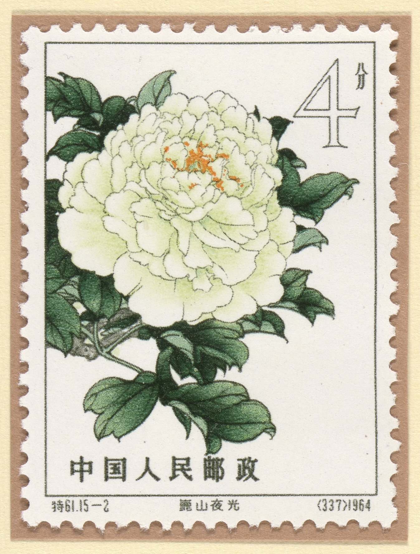 Postage stamp featuring an illustration of a variety of tree peonies called Shining Night at Kun Shan (崑山夜光). This stamp is part of a stamp series titled "Tree Peonies," which was issued in 1964 by the People's Republic of China.