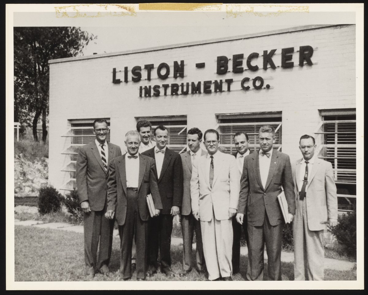 This photo was taken the same year that Beckman Instruments acquired Liston-Becker. This acquisition brought Liston-Becker's emissions testers and analyzers to Beckman, which continued to produce those instruments along with other pollution-reducing products. All of the men in this photo are unidentified.