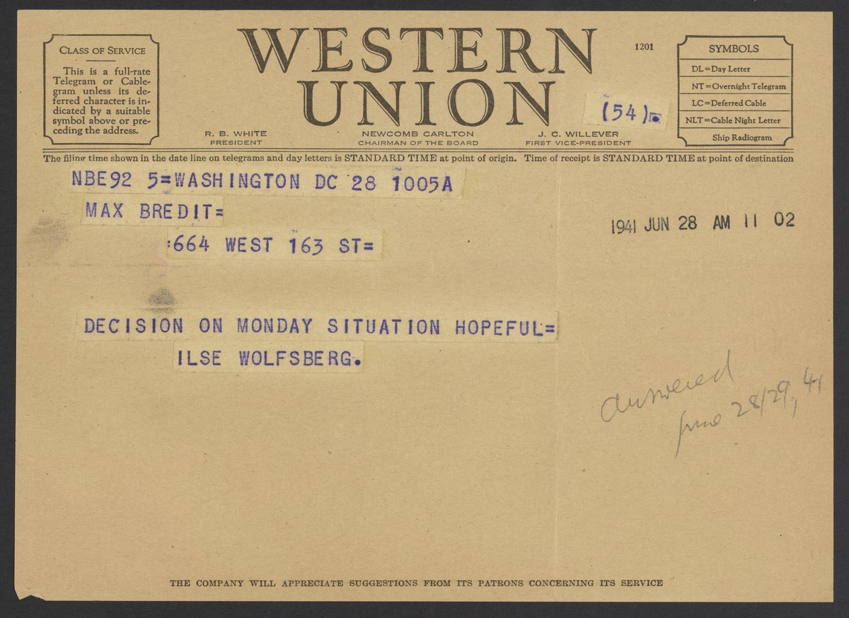 Telegram from Ilse Wolfsberg to Max Bredig, June 28, 1941