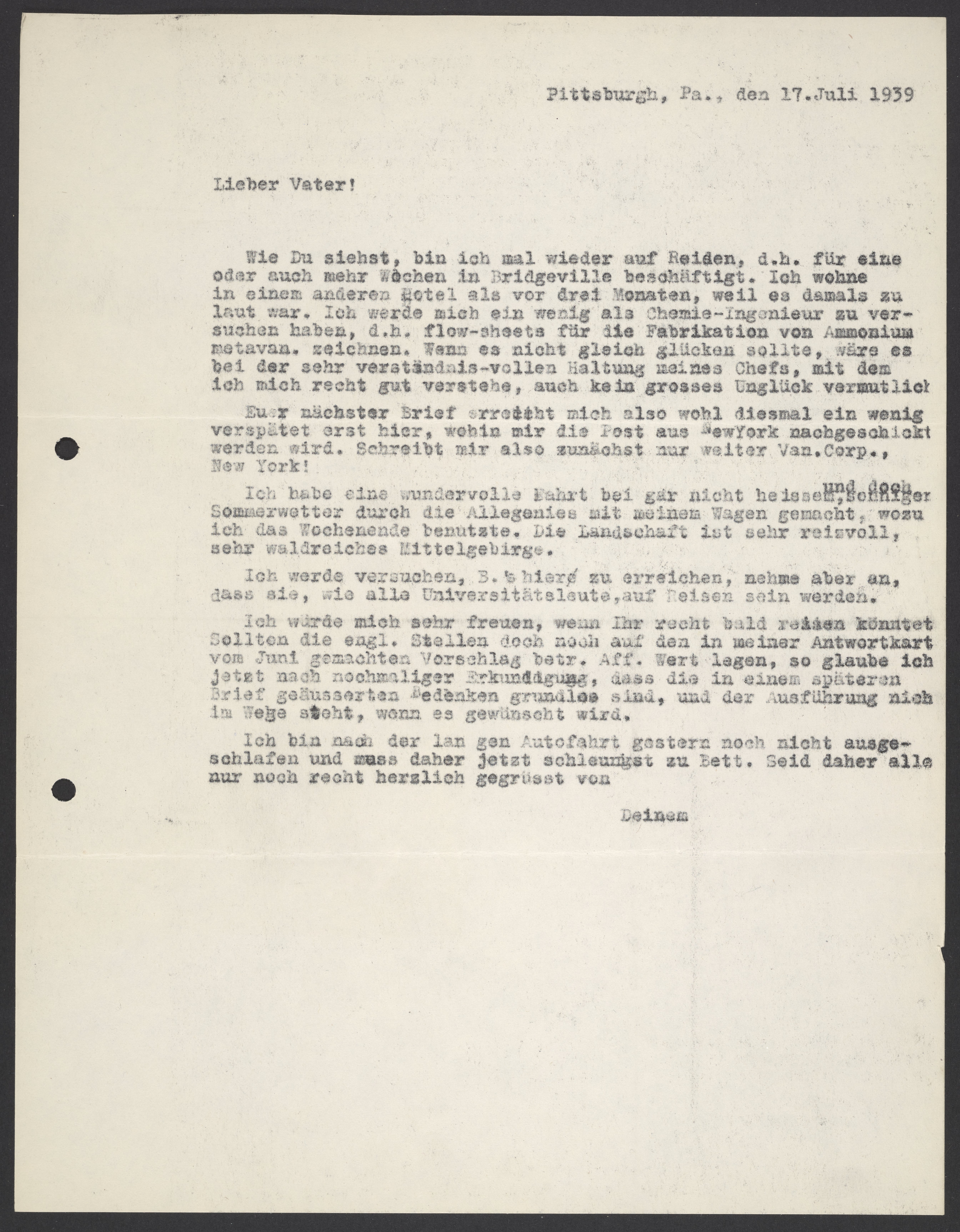 Wie Du siehst, bin ich mal wieder auf Reisen, d.h. für eine oder mehr Wochen in Bridgeville beschäftigt. Ich wohne in einem anderen Hotel als vor drei Monaten, weil es damals zu laut war. Ich werde mich ein wenig als Chemie-Ingenieur zu suchen haben, d.h. flow-sheets für die Fabrikation von Ammonium metavan. zeichnen. Wenn es nicht gleich glücken sollte, wäre es bei der sehr verständnis-volle Haltung meines Chefs, mit dem ich mich recht gut verstehe, auch kein grosses Unglück vermutlich.