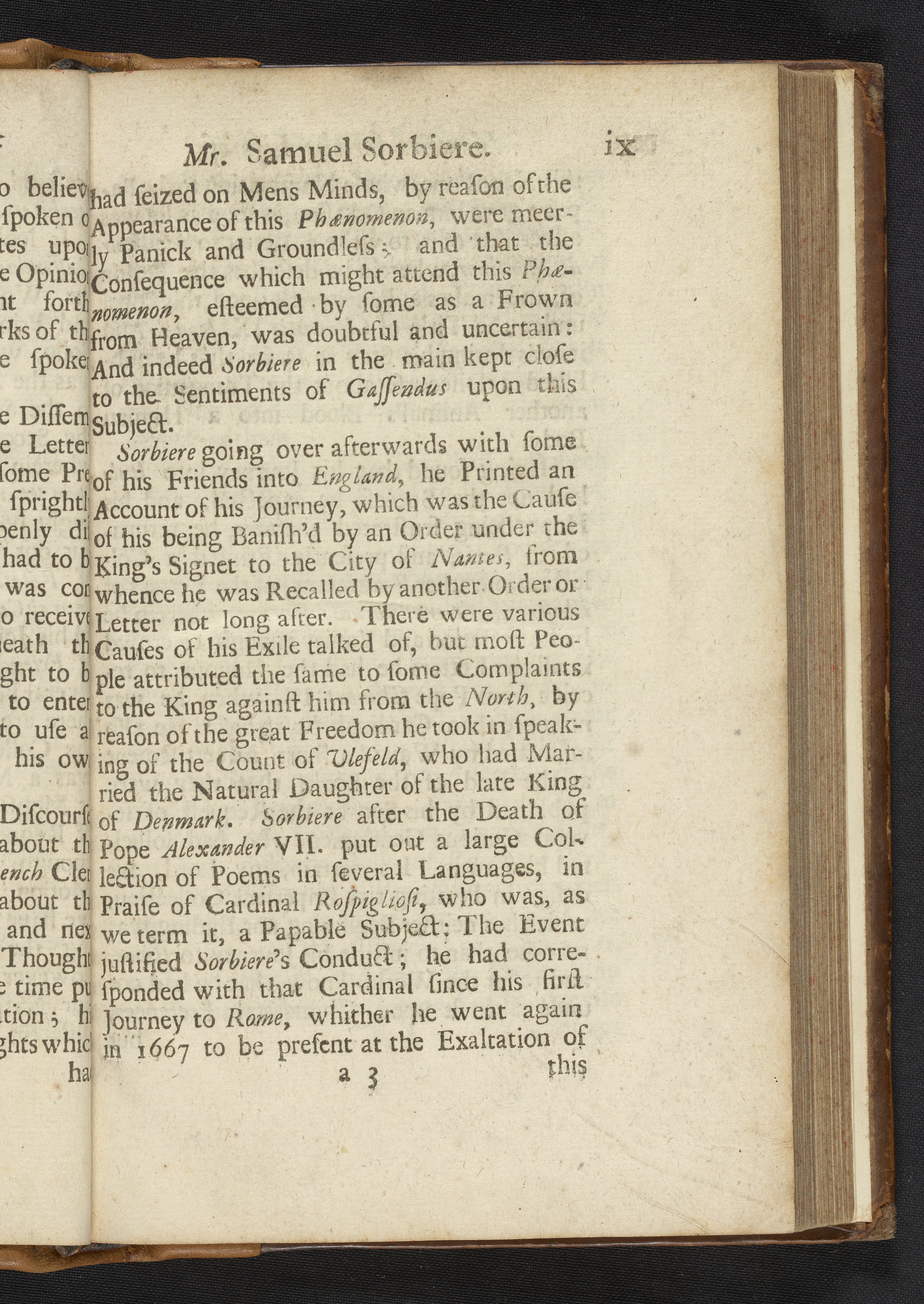 The original observations were adressed to King Louis XIV with an aim to influence him to support a French academy of science. It is an often critical account that gives a view into England's intellectual life at the time. Thomas Sprat's observations show his sensitivity to Sorbière's work and attacks the thoughts Sorbière presents. This edition notably contains a mistake in the printing: page 109 is printed as 190. The entire work has been digitized.