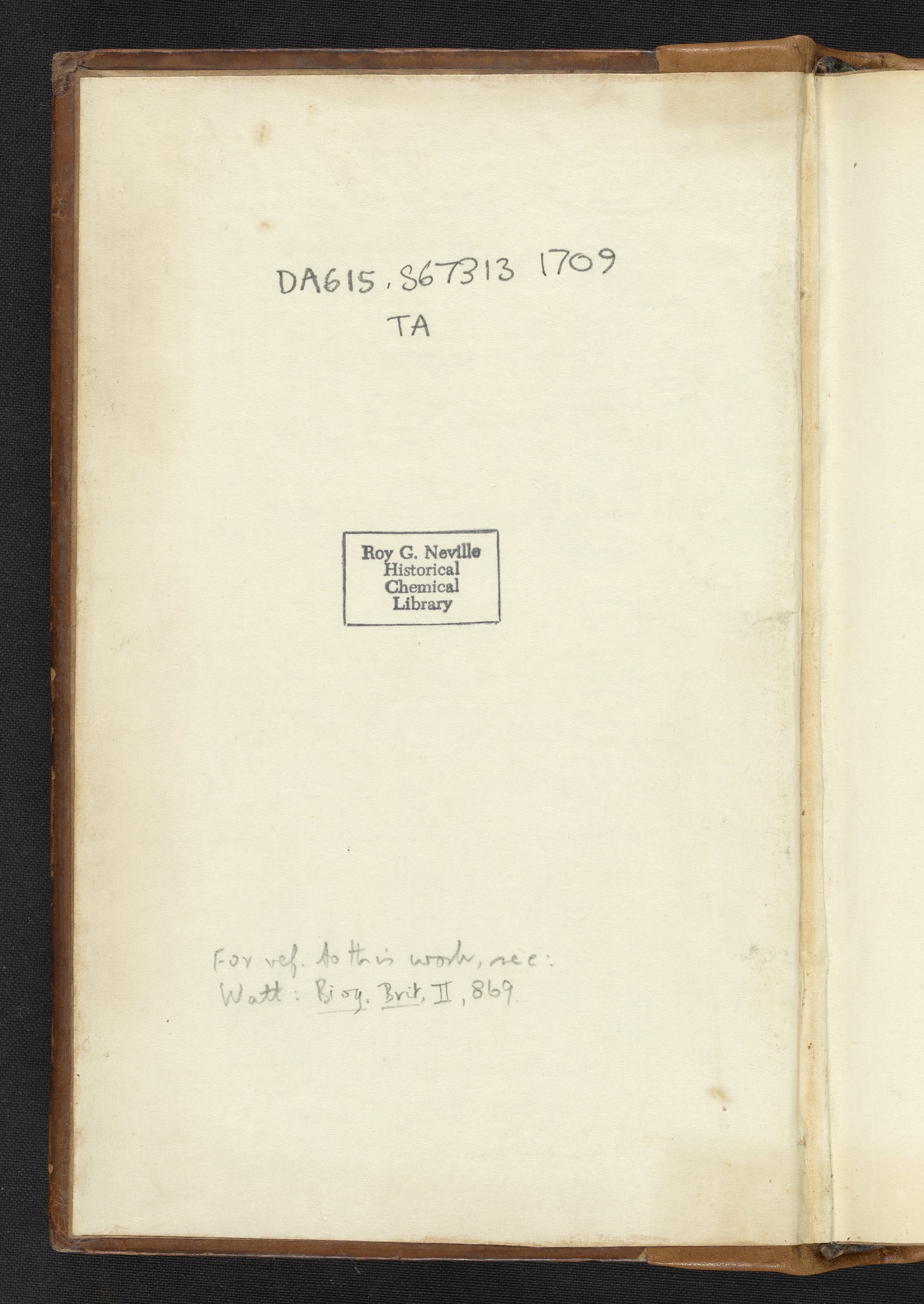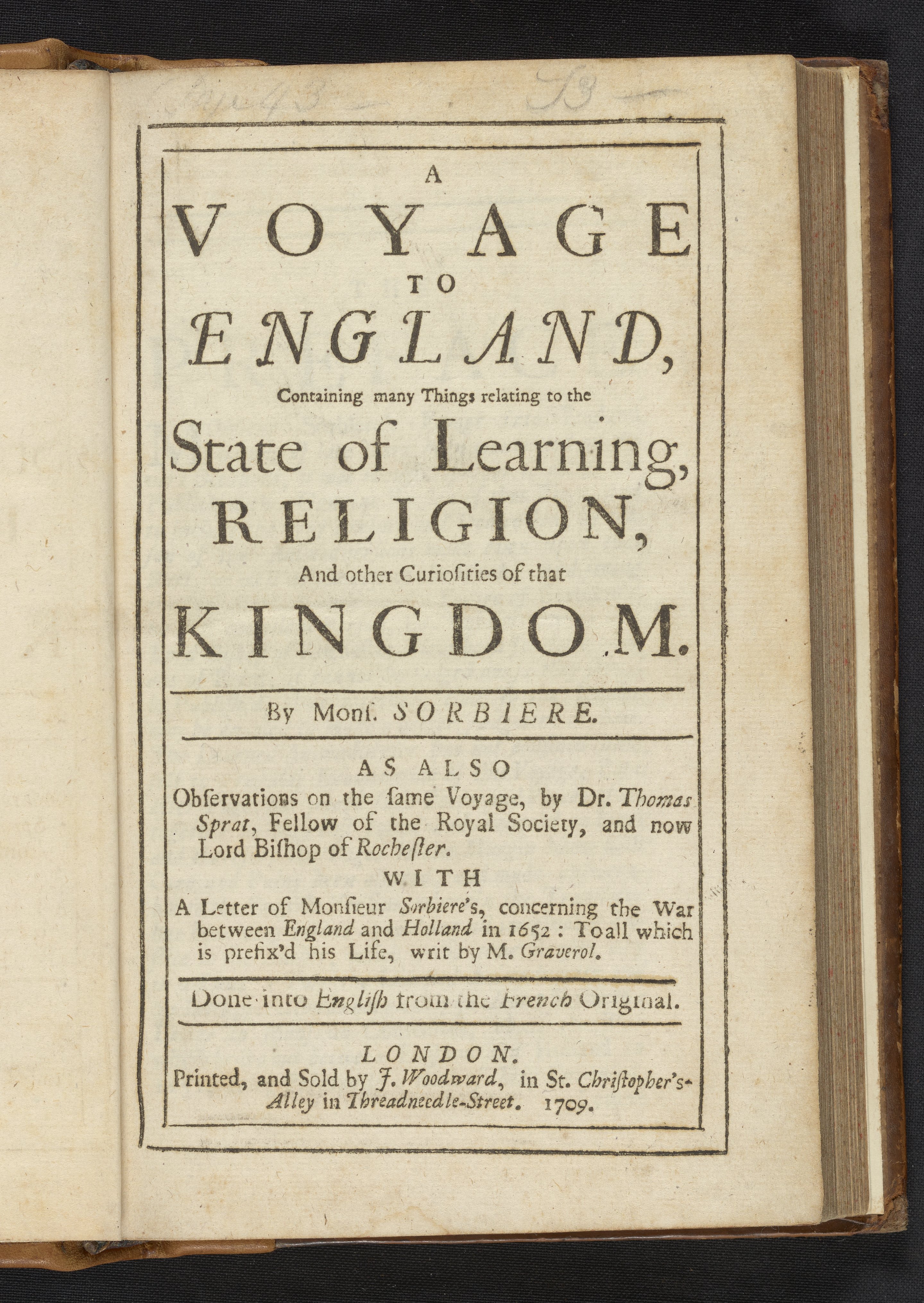 Sorbière, Samuel, M. Graverol, and Sprat, Thomas 1713. A Voyage to England: Containing Many Things Relating to the State of Learning, Religion, and Other Curiosities of That Kingdom. London, England: J. Woodard, 1709. https://digital.sciencehistory.org/works/kasznnp.
