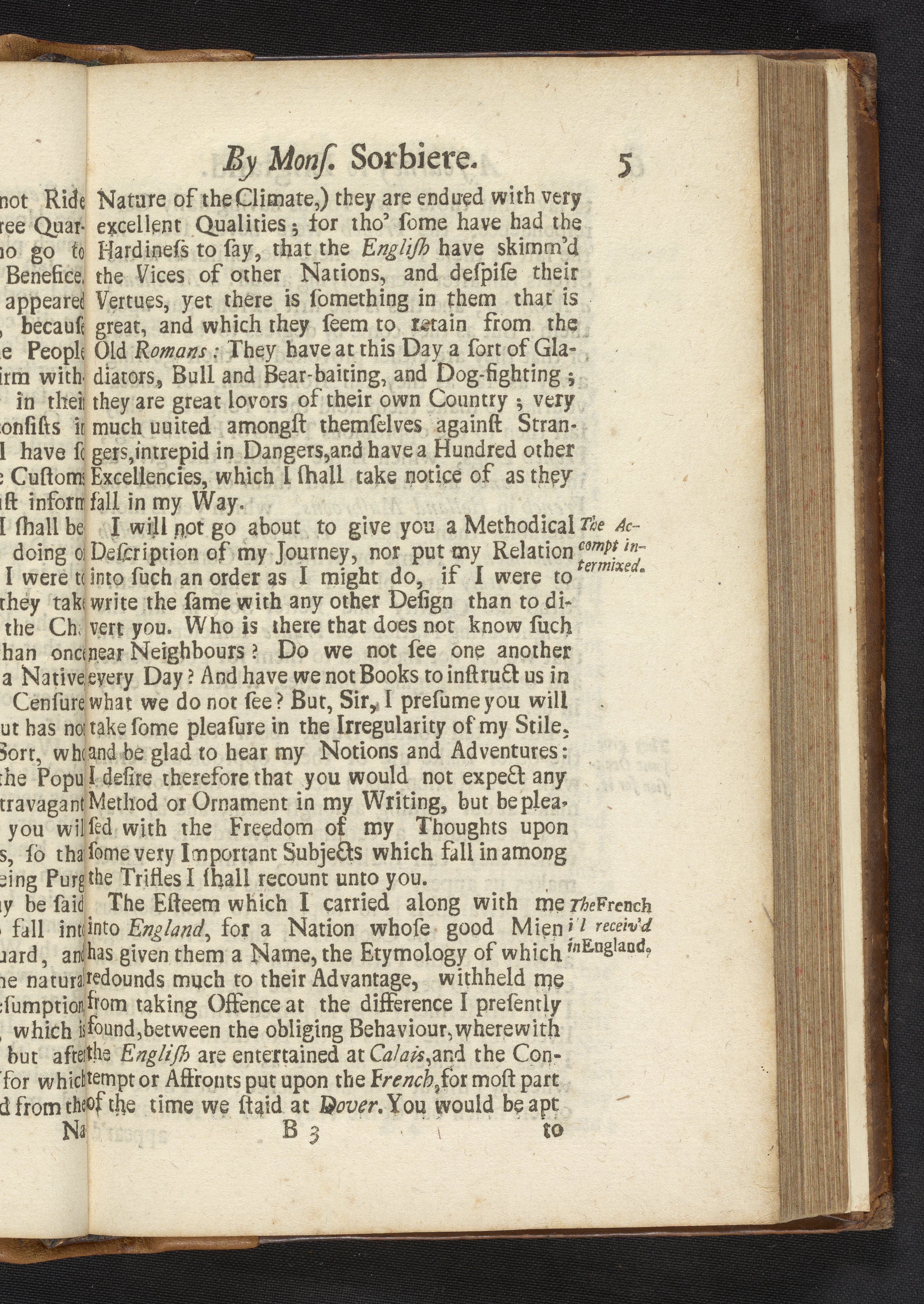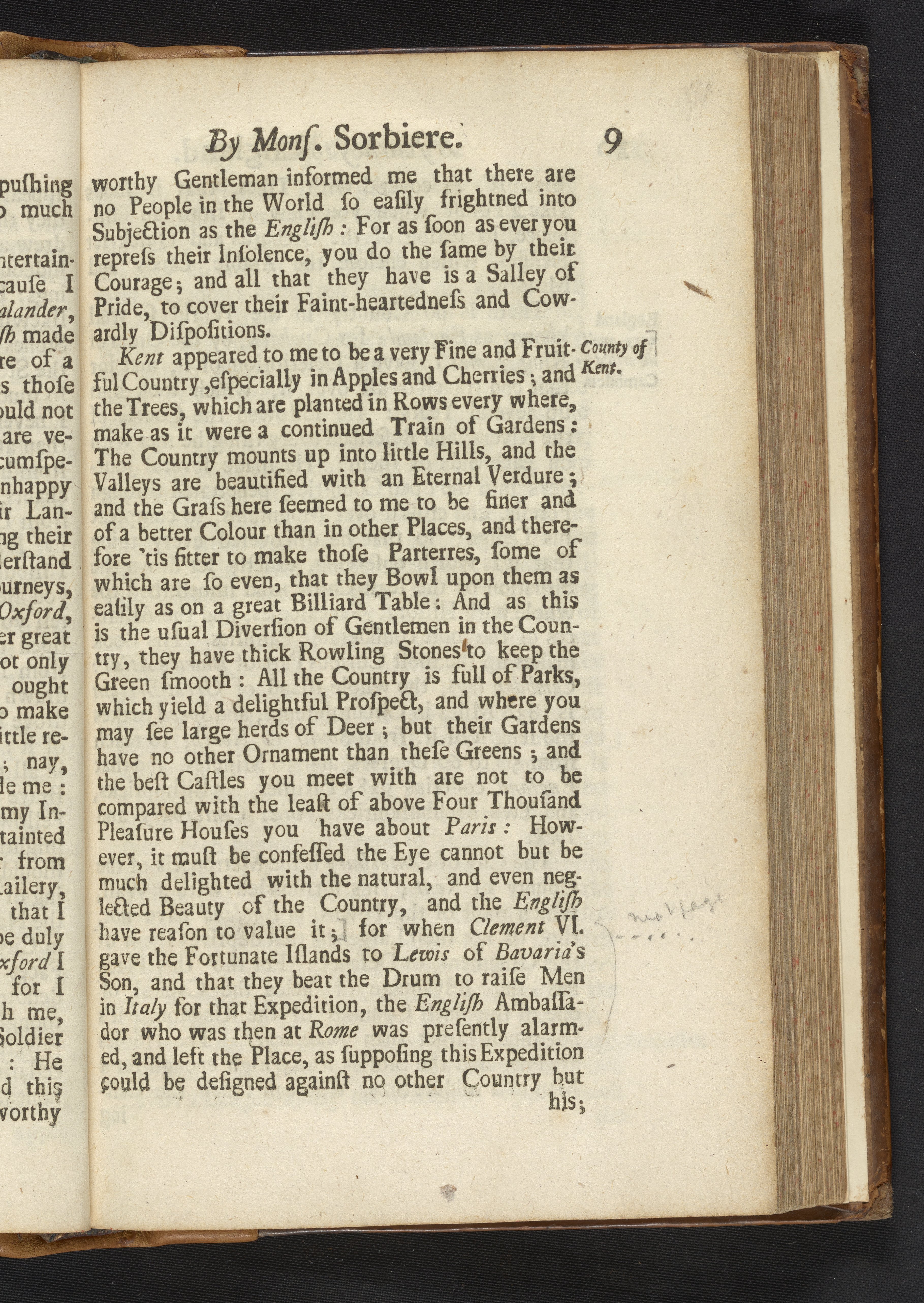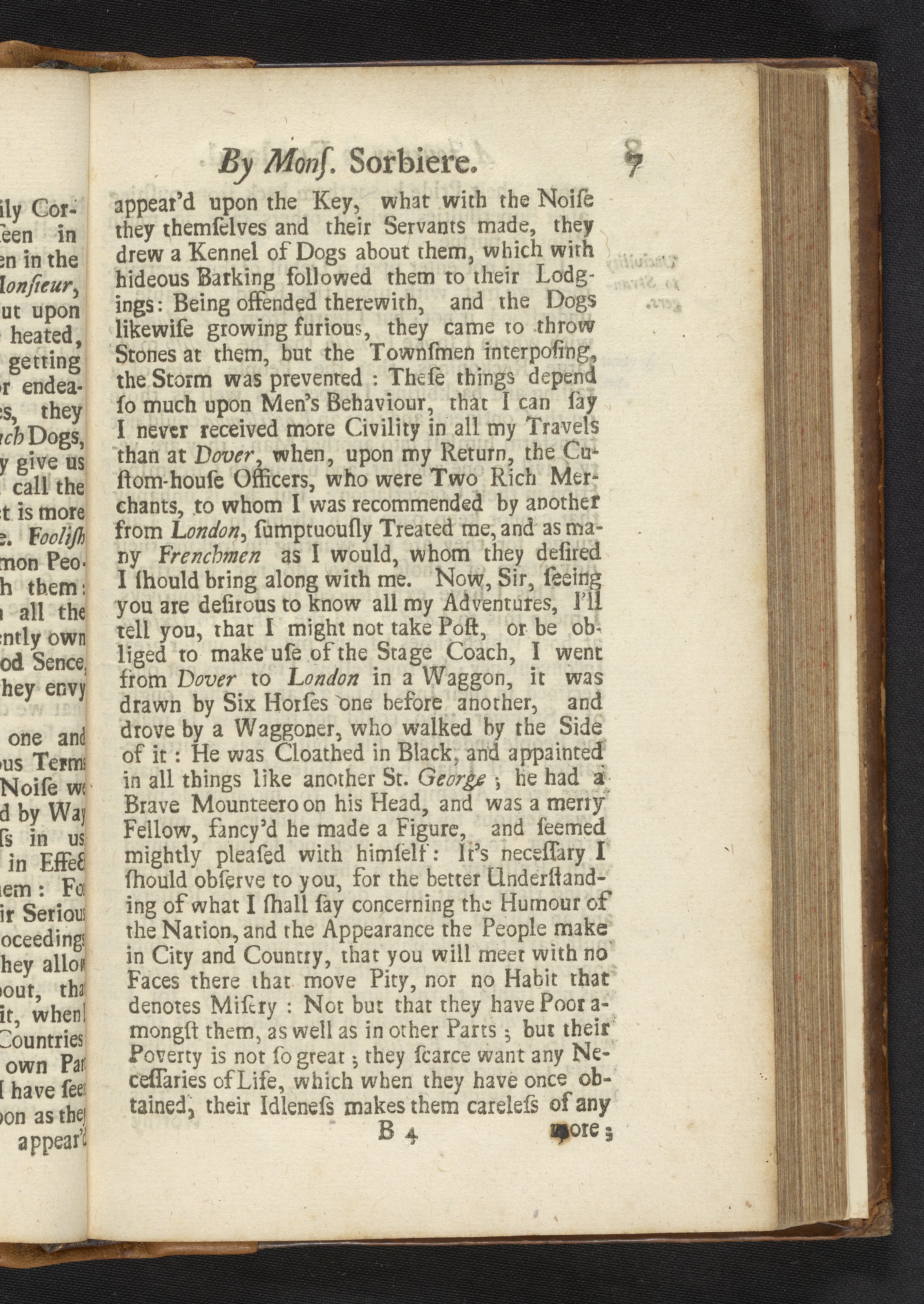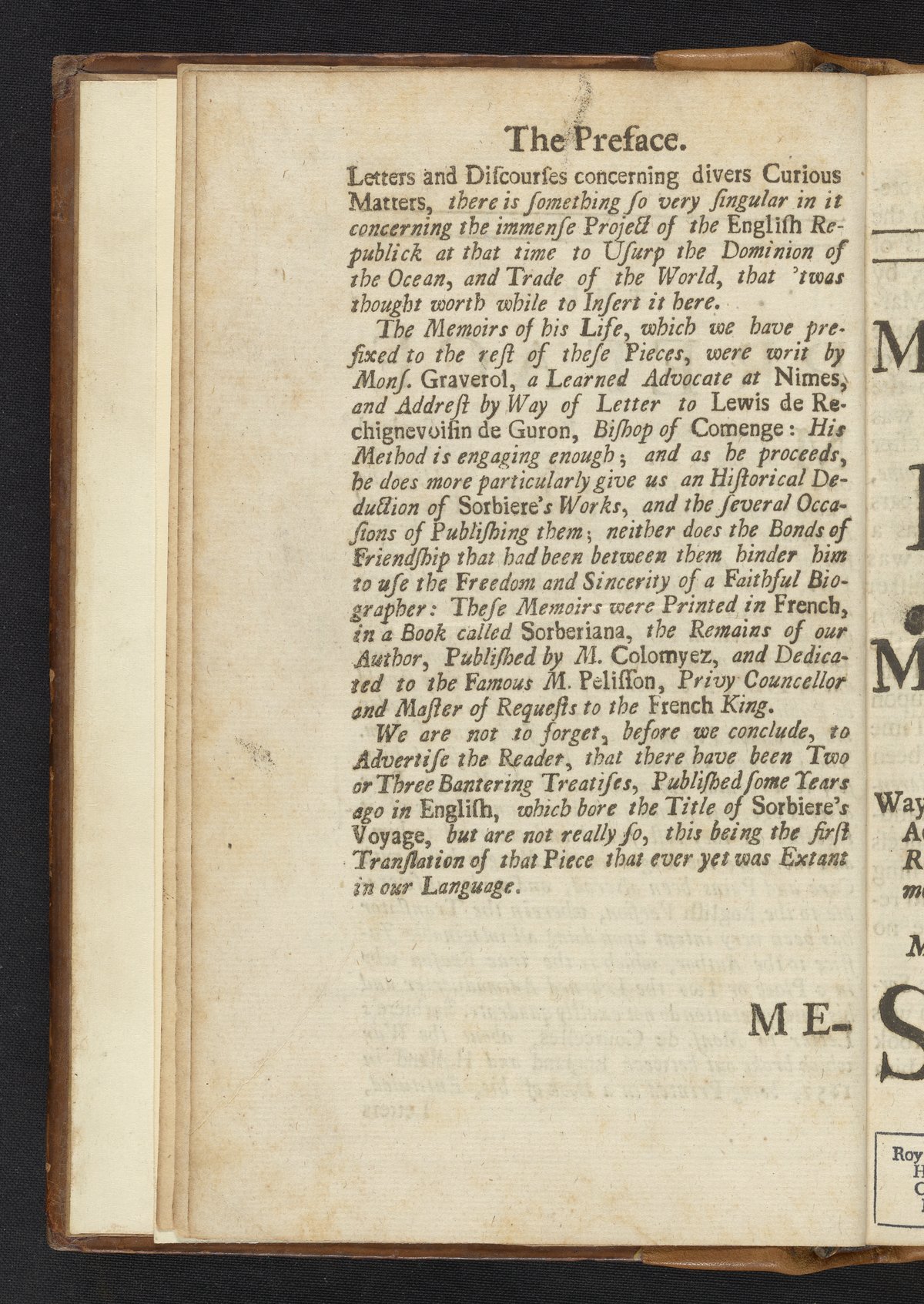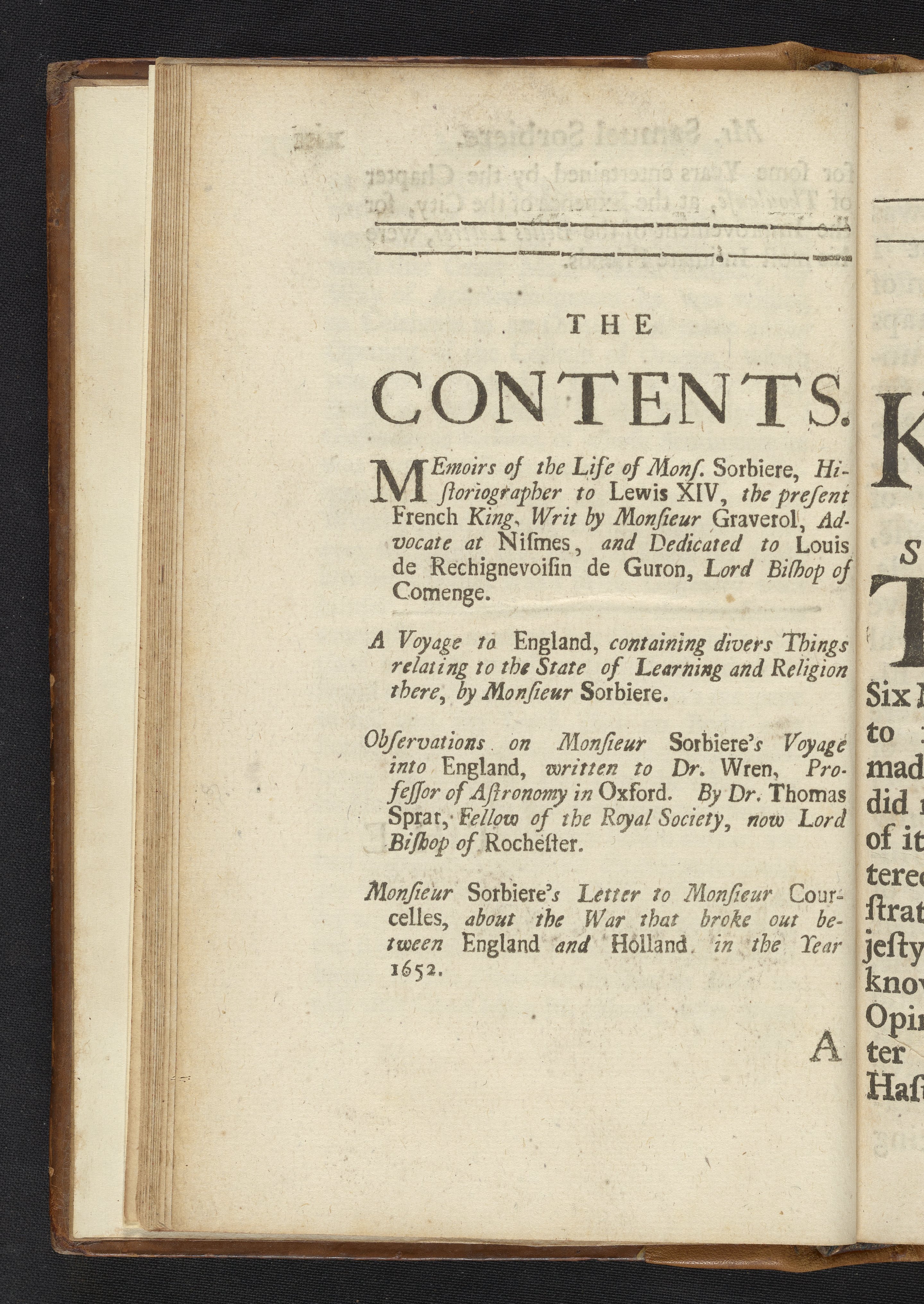 The original observations were adressed to King Louis XIV with an aim to influence him to support a French academy of science. It is an often critical account that gives a view into England's intellectual life at the time. Thomas Sprat's observations show his sensitivity to Sorbière's work and attacks the thoughts Sorbière presents. This edition notably contains a mistake in the printing: page 109 is printed as 190. The entire work has been digitized.