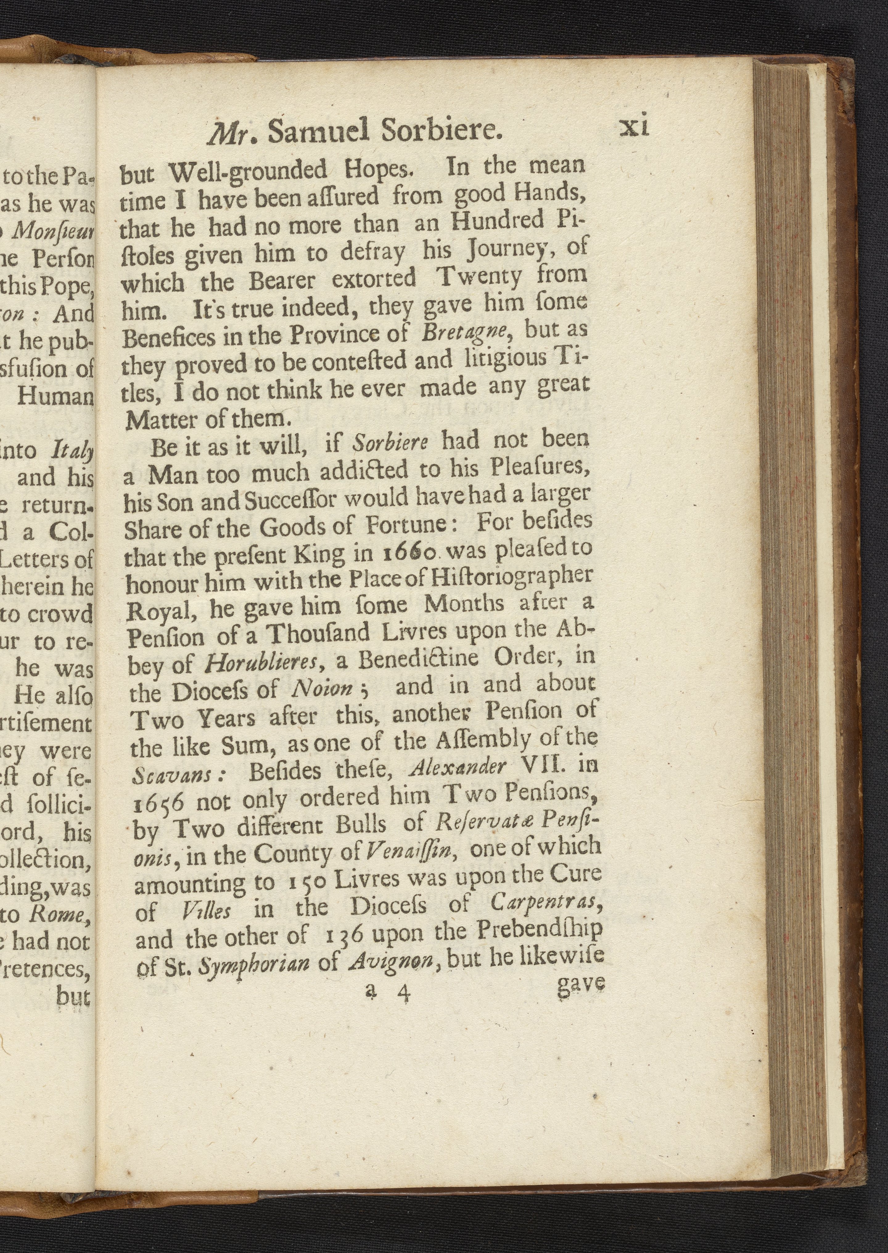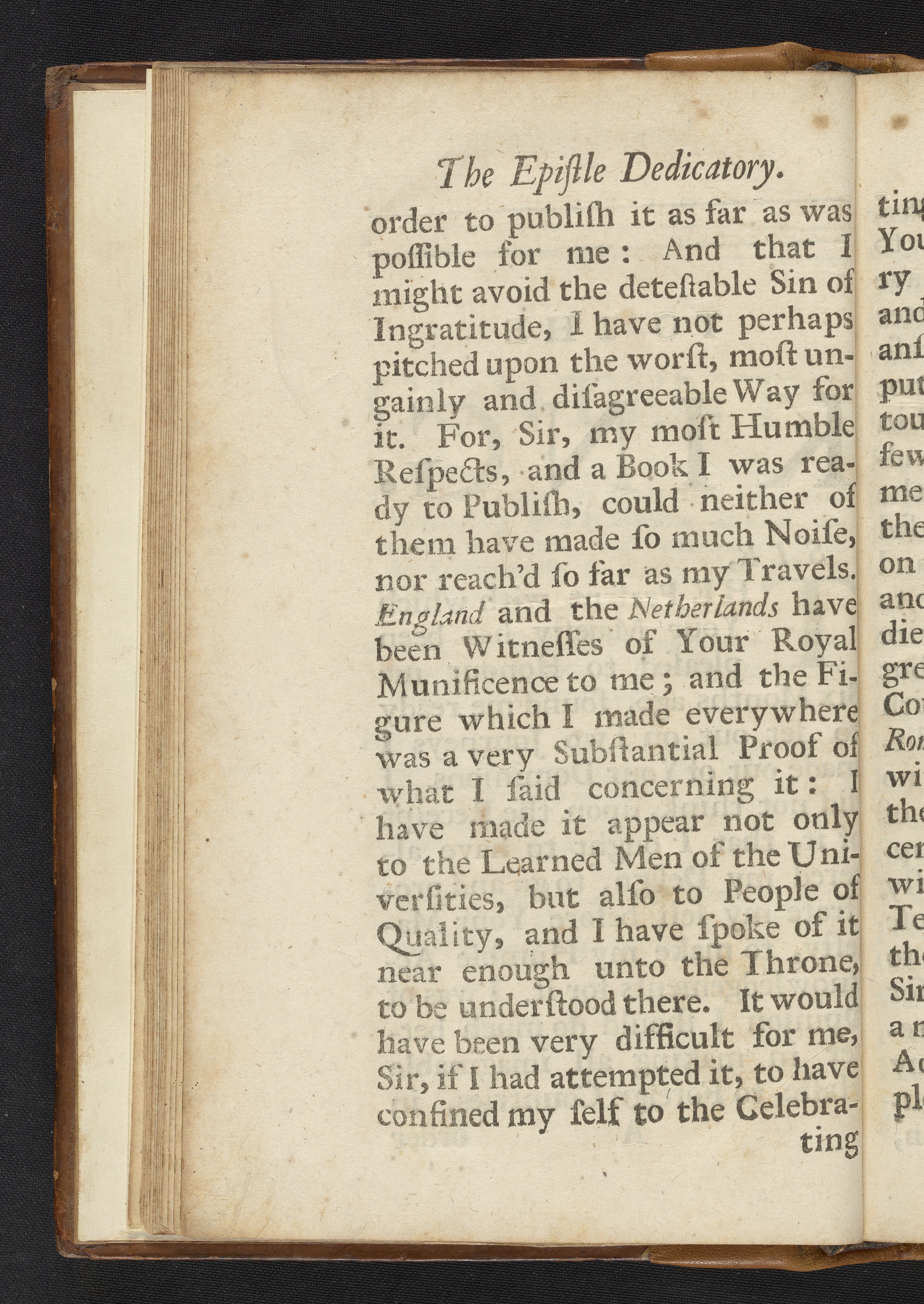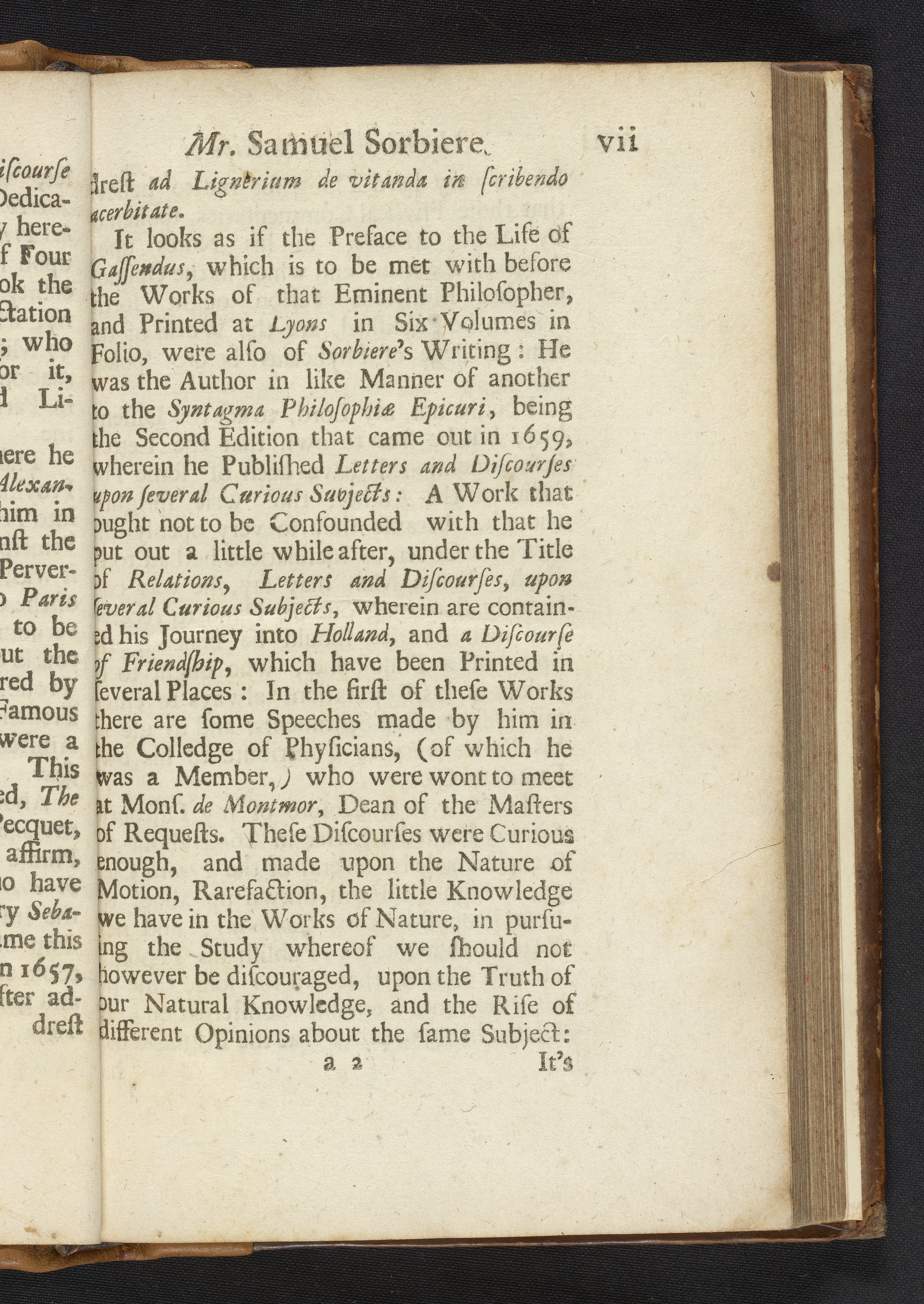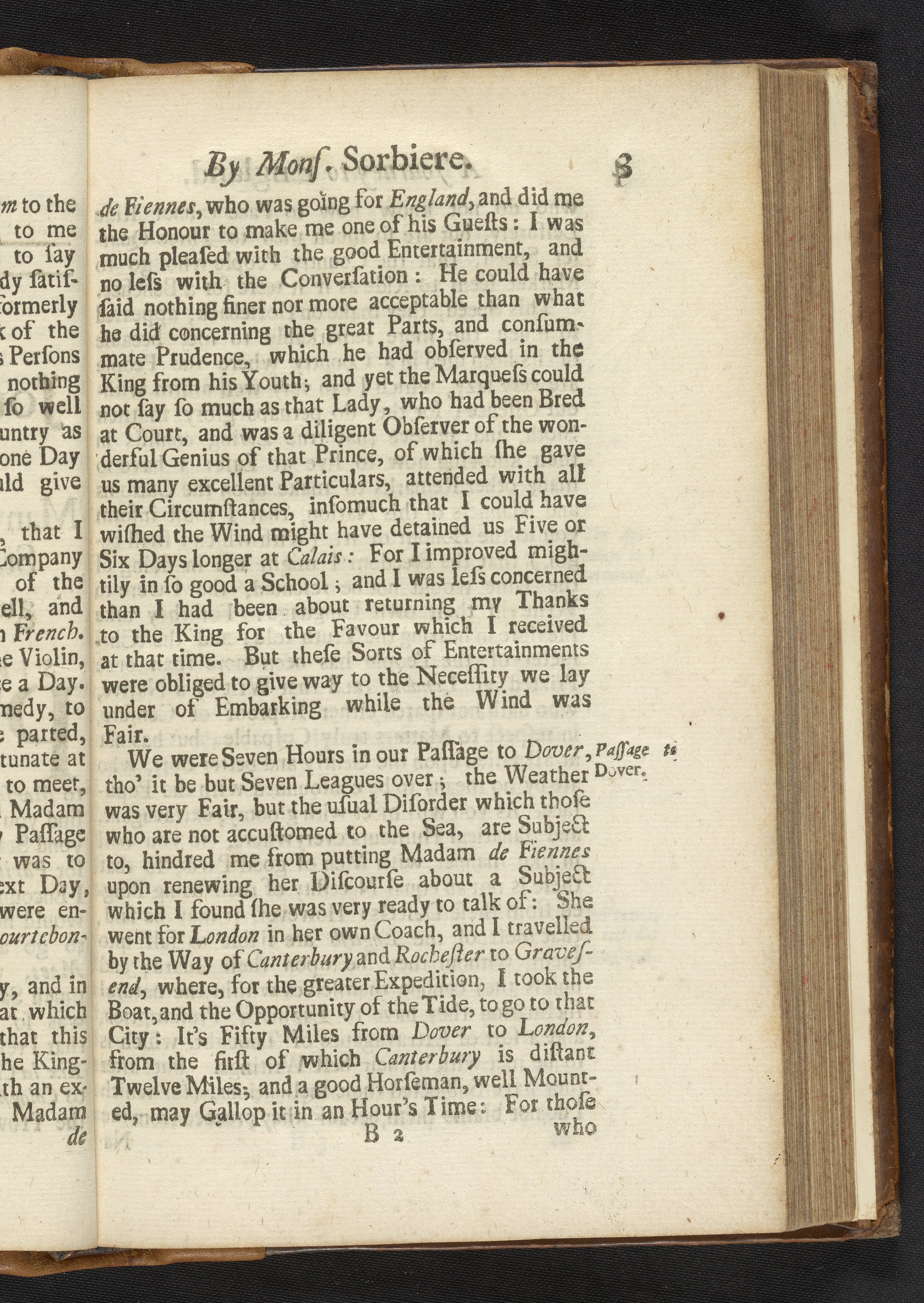 The original observations were adressed to King Louis XIV with an aim to influence him to support a French academy of science. It is an often critical account that gives a view into England's intellectual life at the time. Thomas Sprat's observations show his sensitivity to Sorbière's work and attacks the thoughts Sorbière presents. This edition notably contains a mistake in the printing: page 109 is printed as 190. The entire work has been digitized.