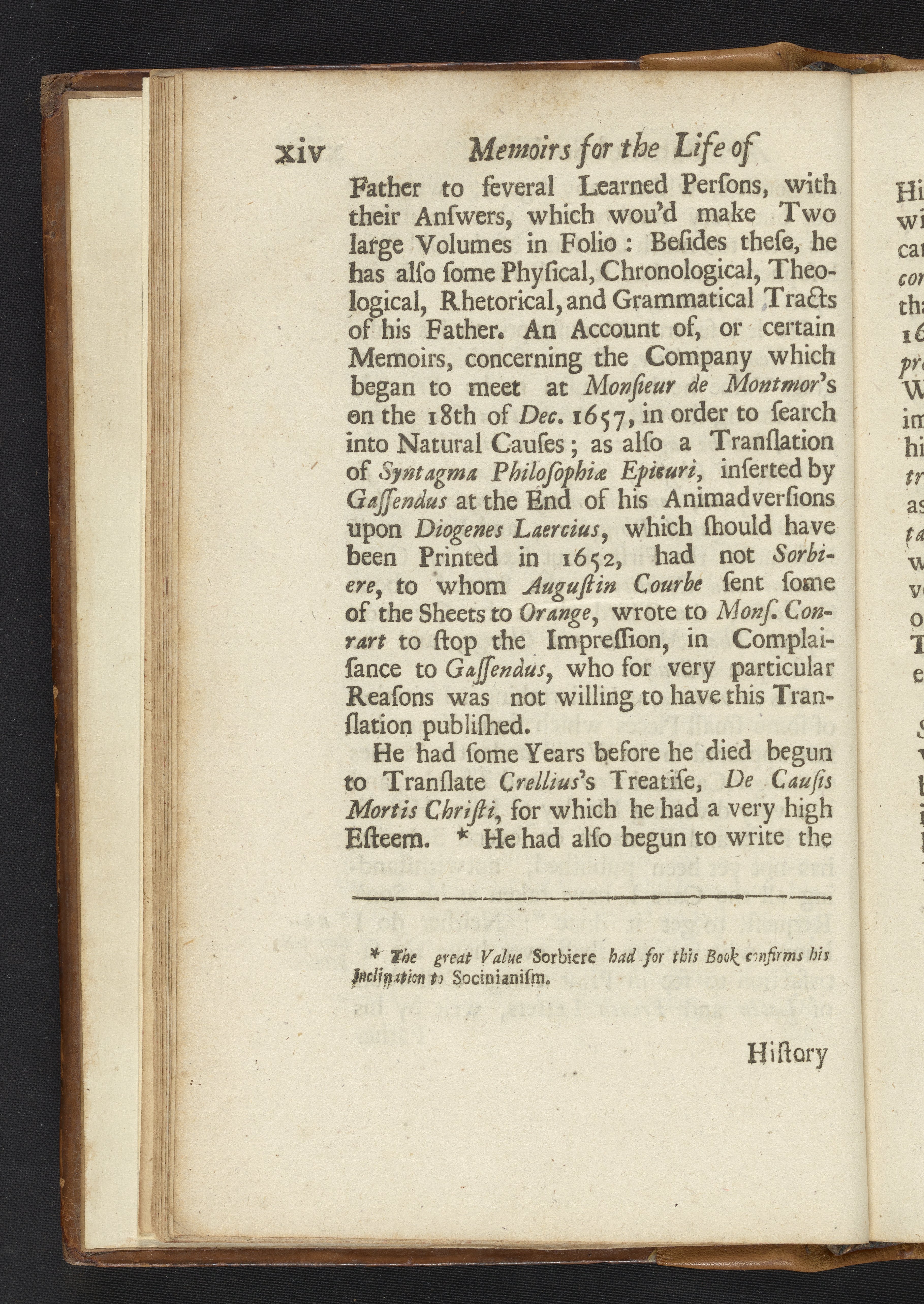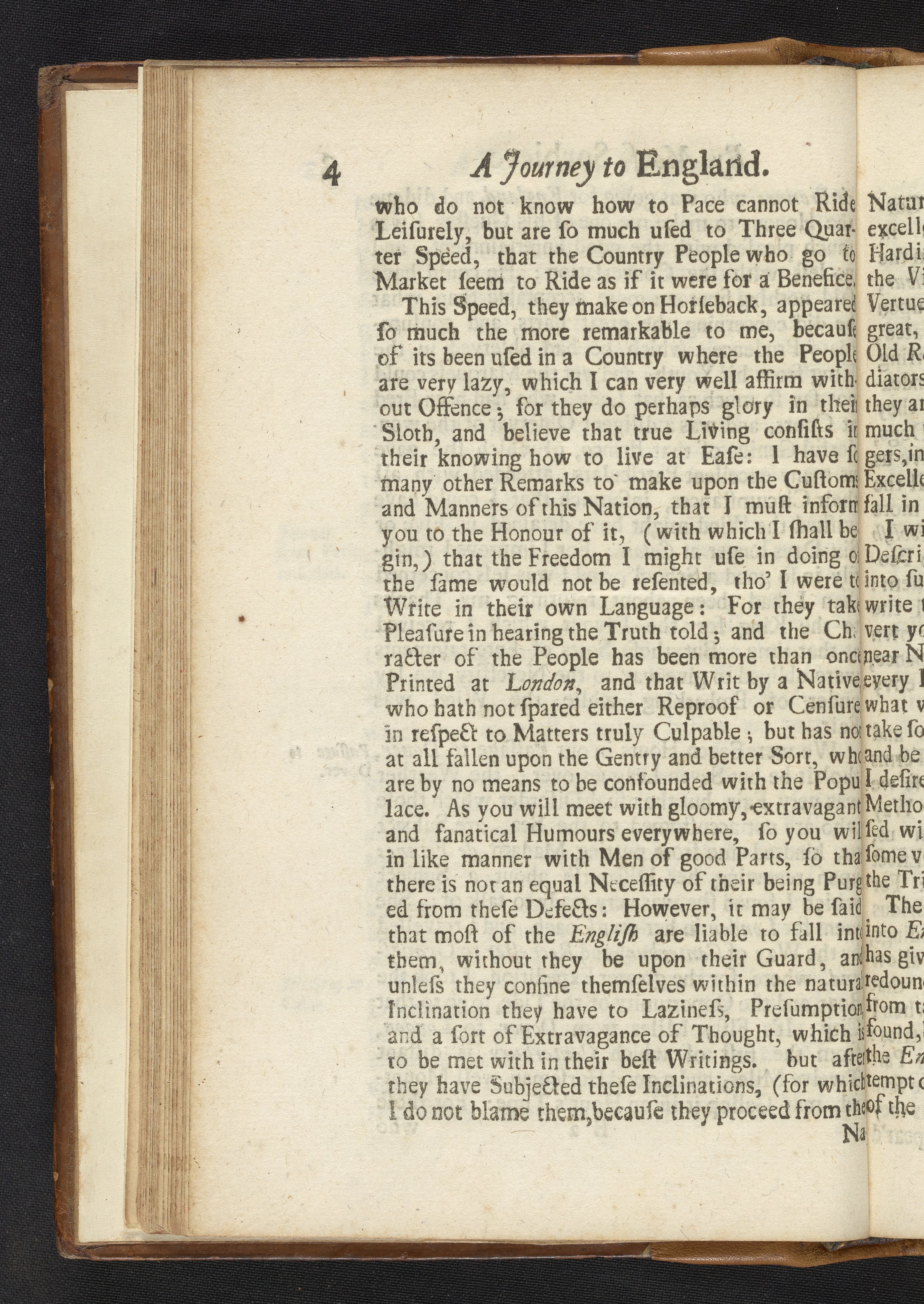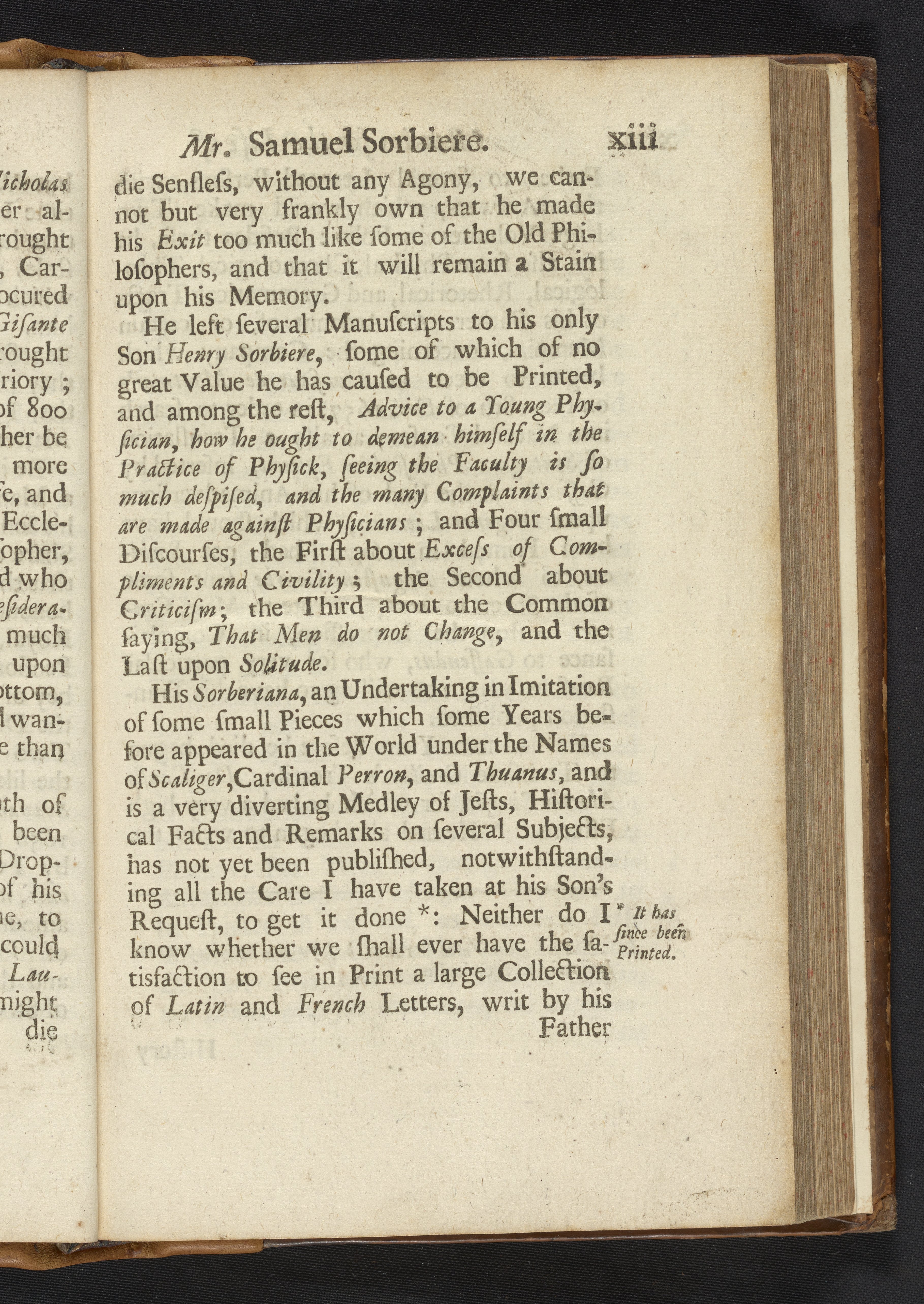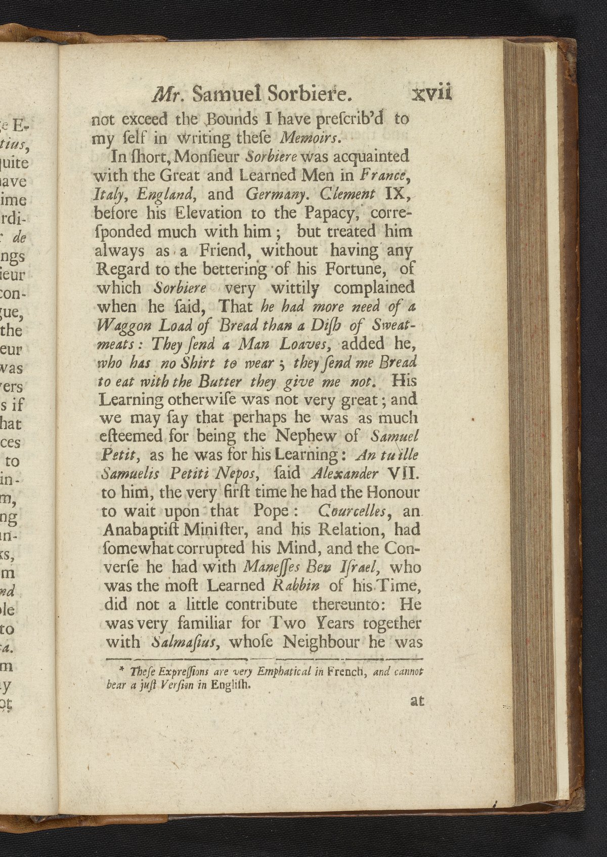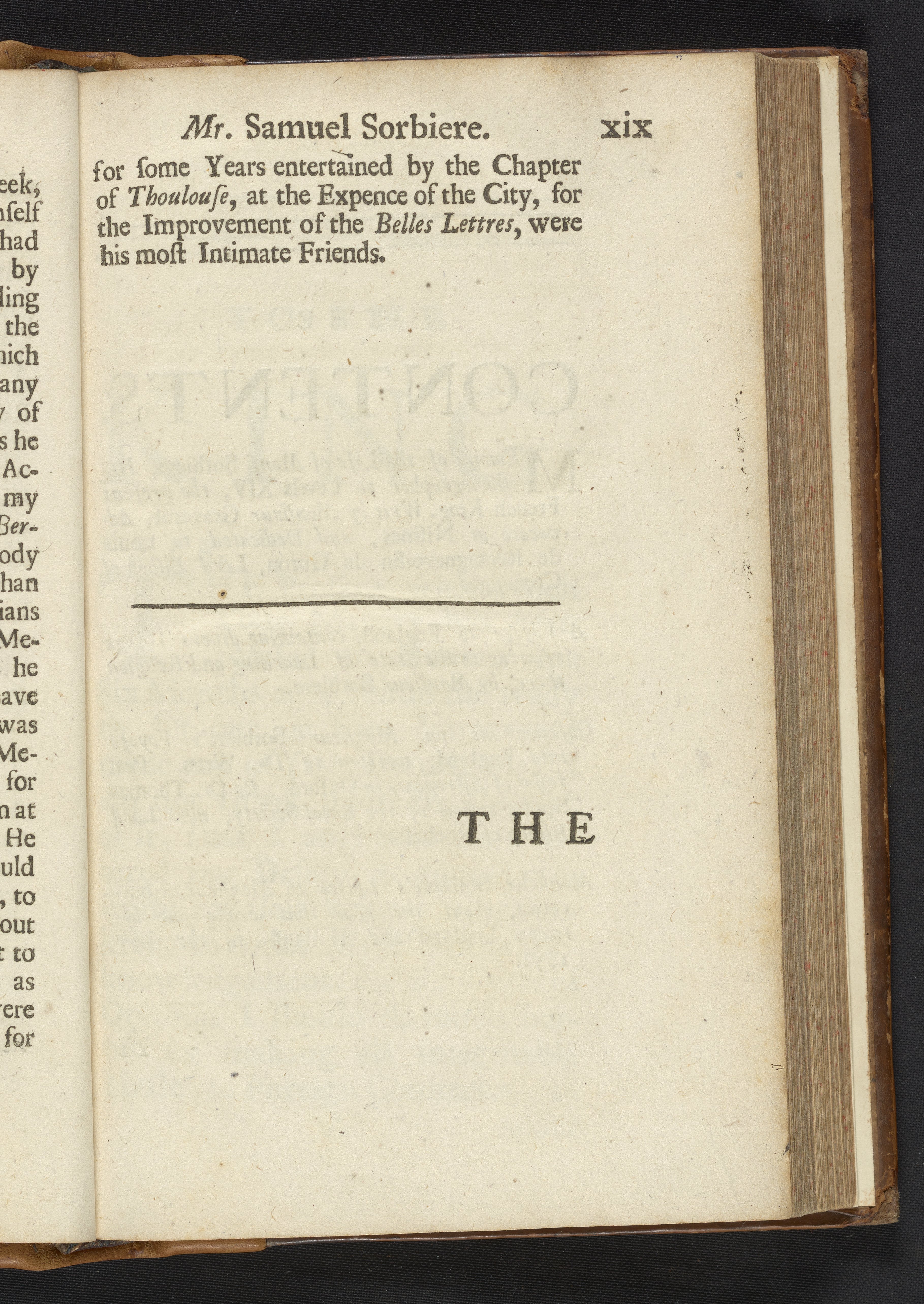 The original observations were adressed to King Louis XIV with an aim to influence him to support a French academy of science. It is an often critical account that gives a view into England's intellectual life at the time. Thomas Sprat's observations show his sensitivity to Sorbière's work and attacks the thoughts Sorbière presents. This edition notably contains a mistake in the printing: page 109 is printed as 190. The entire work has been digitized.