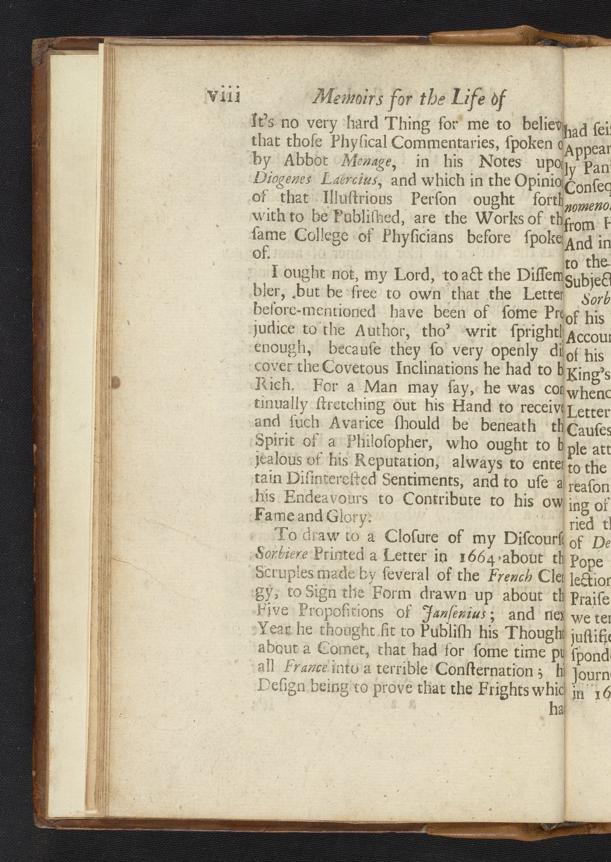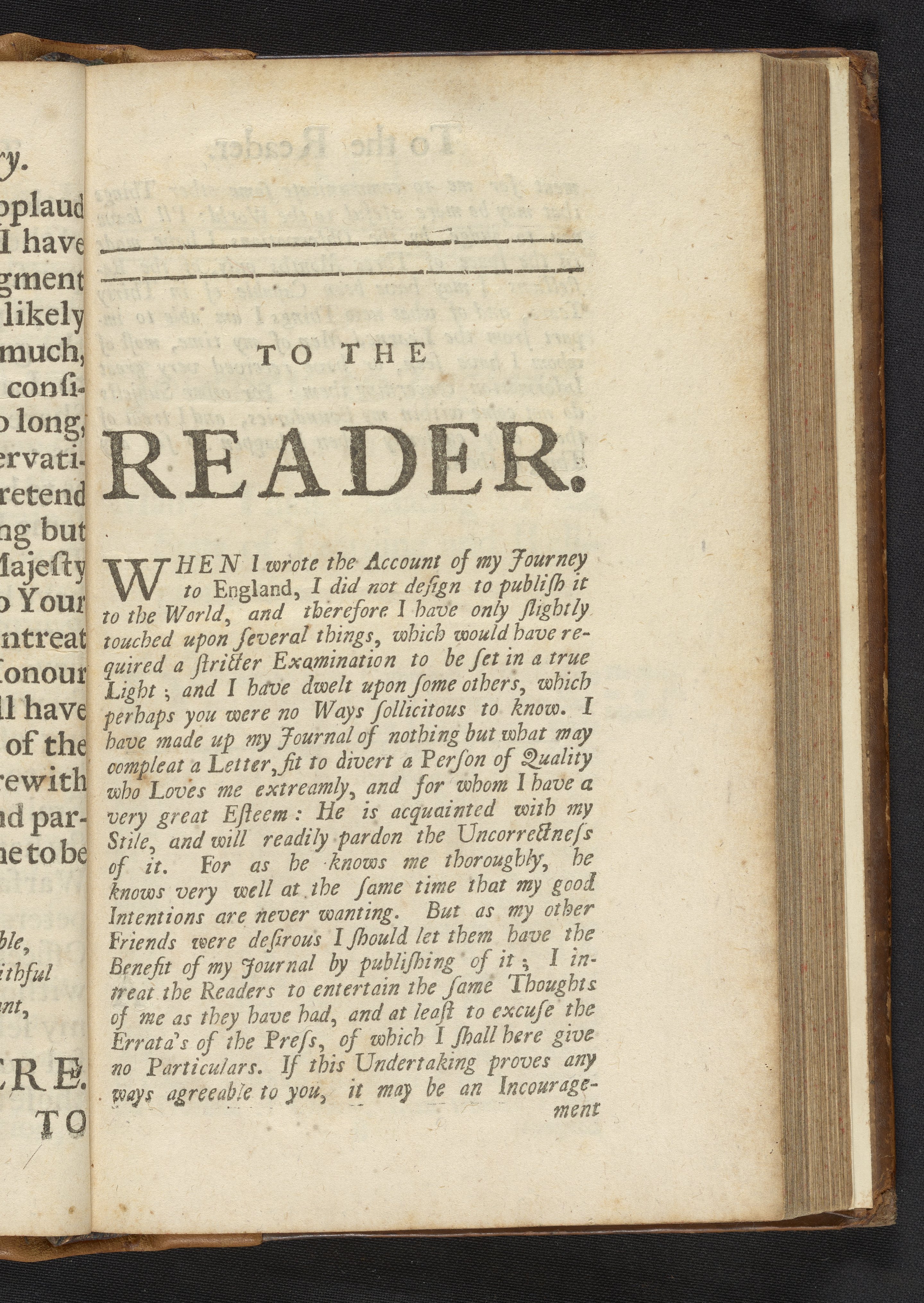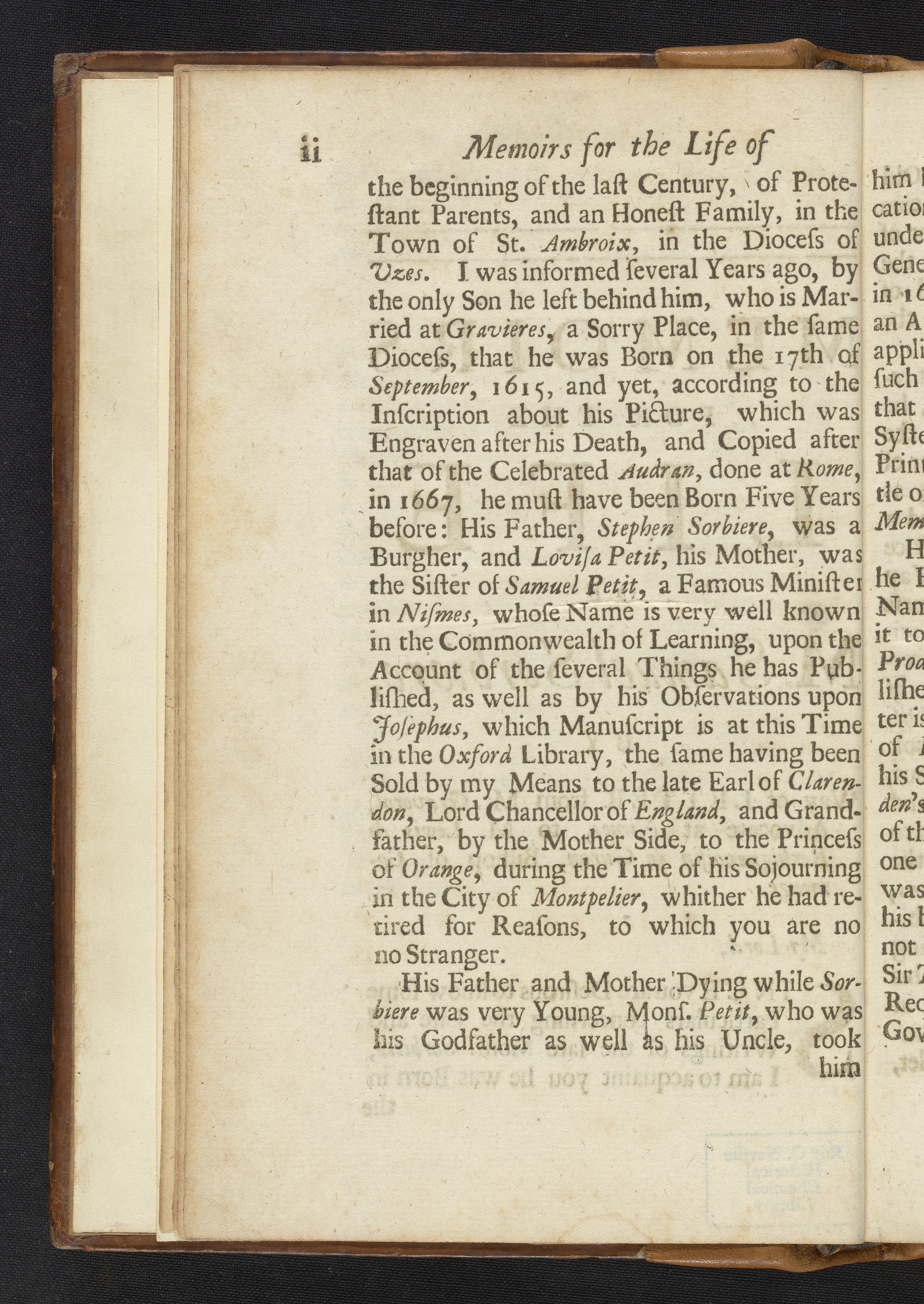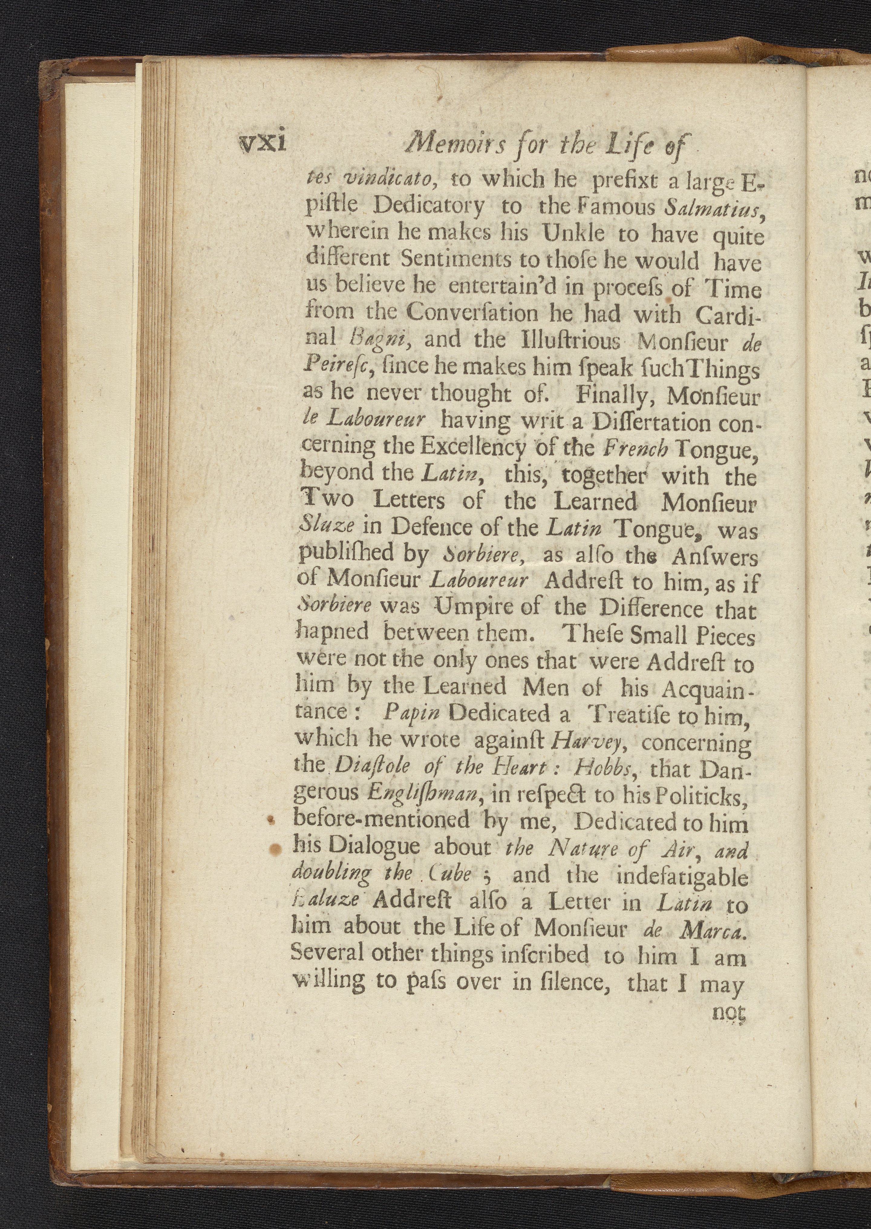 The original observations were adressed to King Louis XIV with an aim to influence him to support a French academy of science. It is an often critical account that gives a view into England's intellectual life at the time. Thomas Sprat's observations show his sensitivity to Sorbière's work and attacks the thoughts Sorbière presents. This edition notably contains a mistake in the printing: page 109 is printed as 190. The entire work has been digitized.