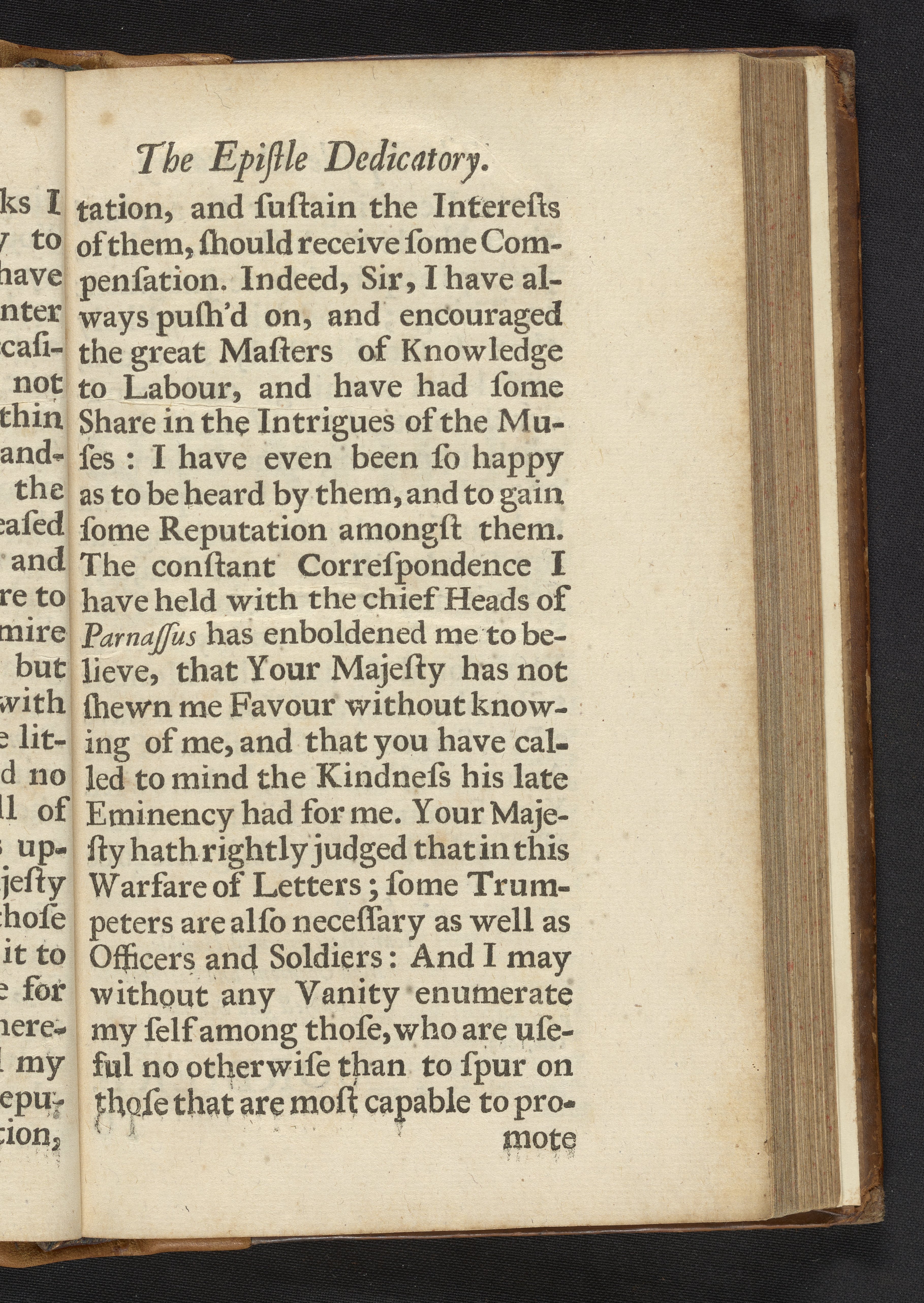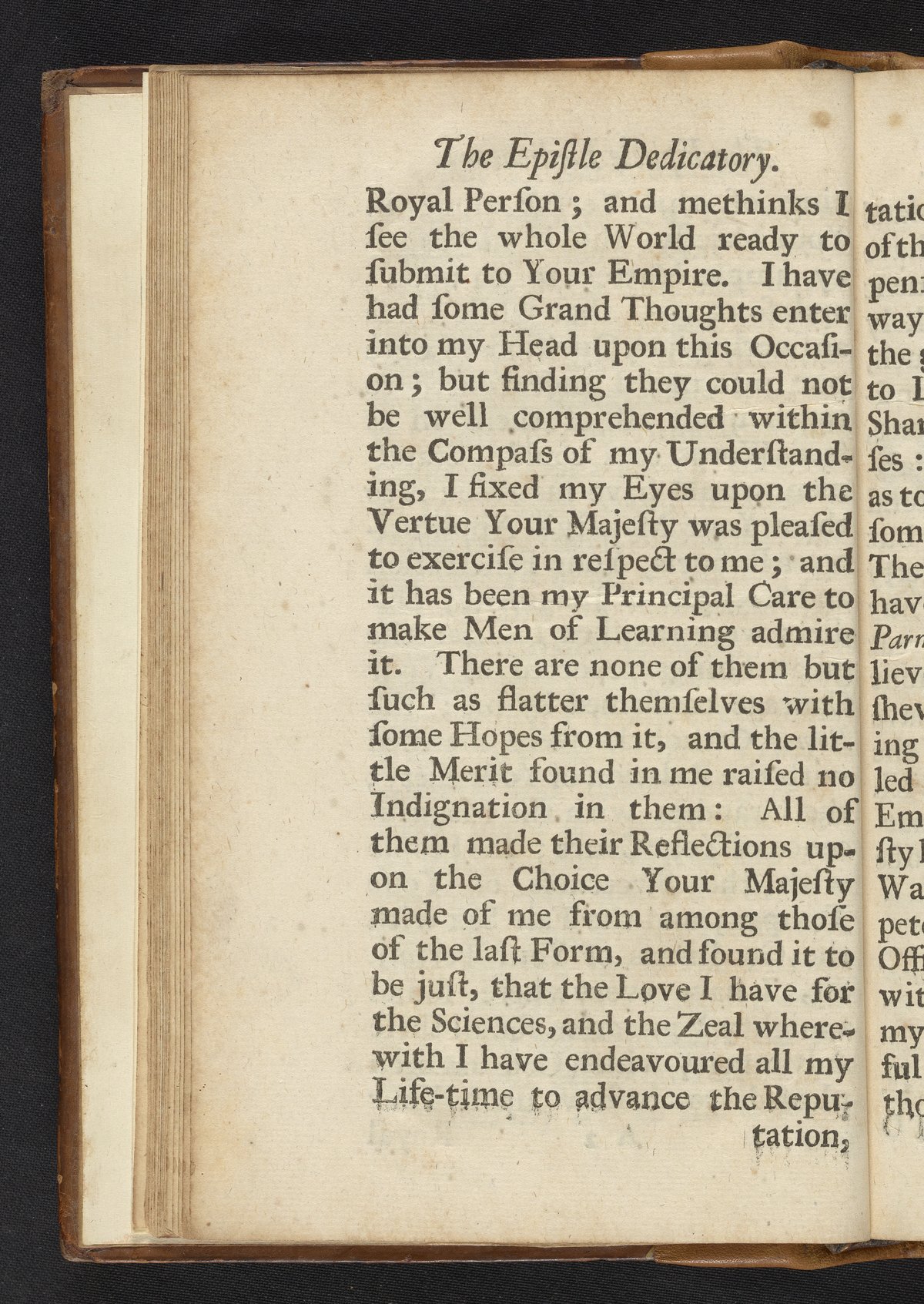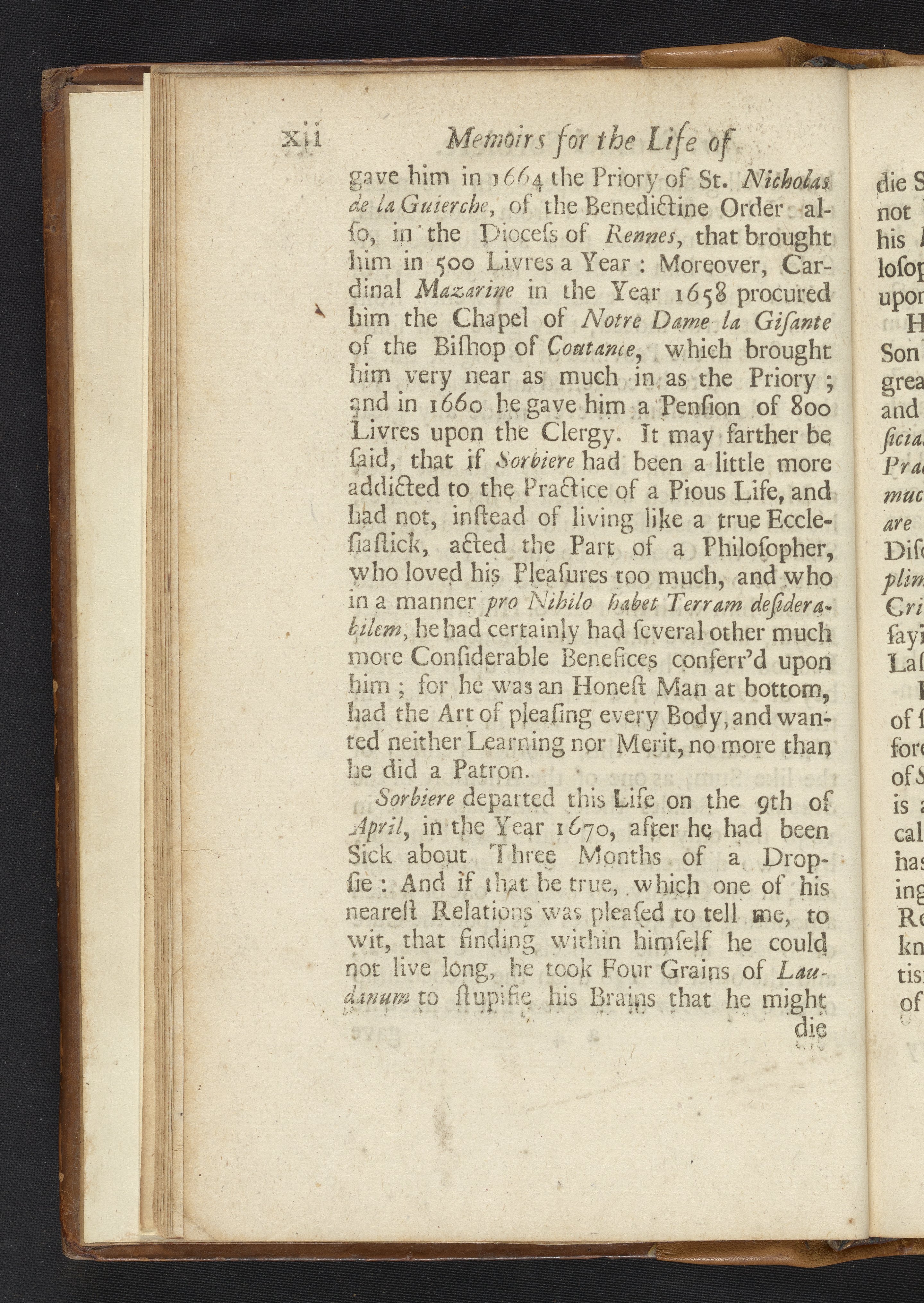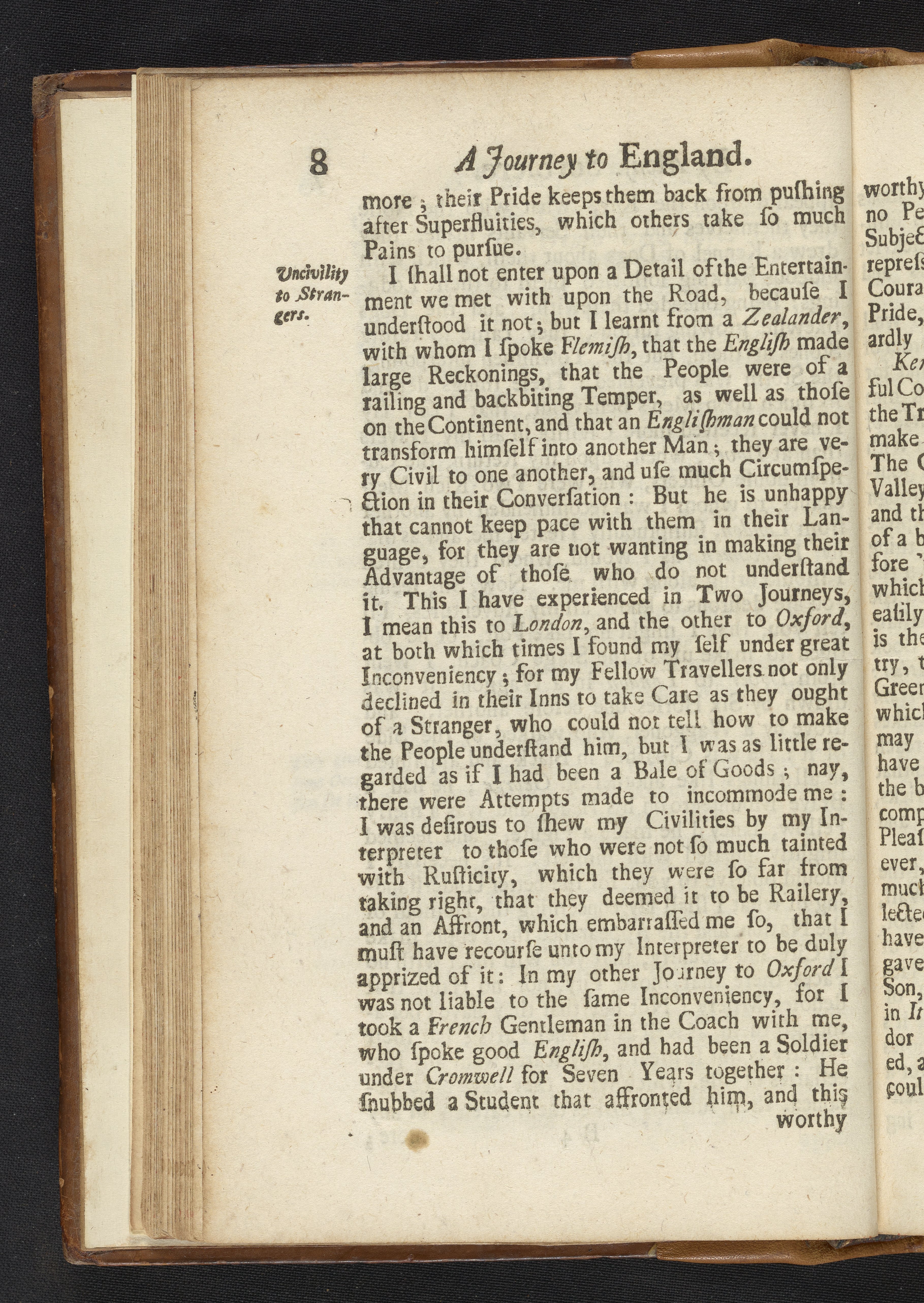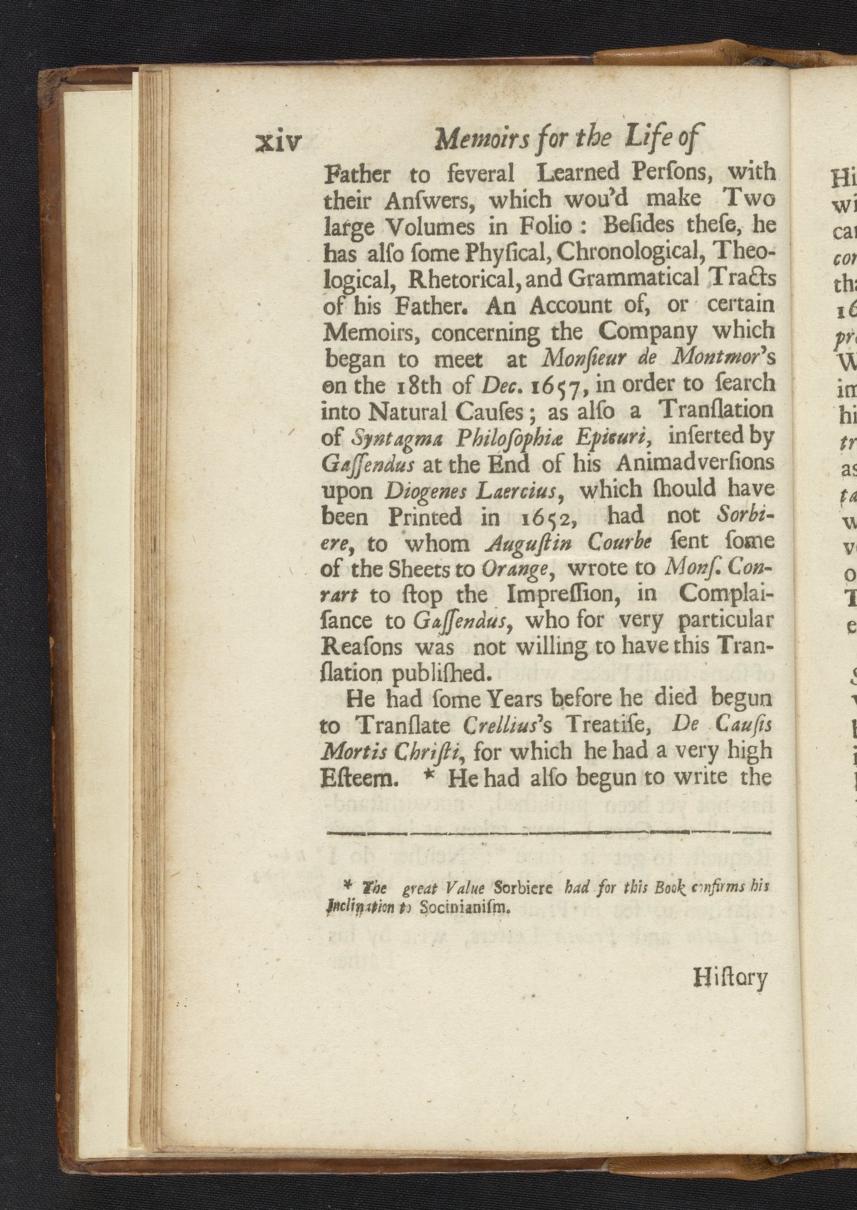 The original observations were adressed to King Louis XIV with an aim to influence him to support a French academy of science. It is an often critical account that gives a view into England's intellectual life at the time. Thomas Sprat's observations show his sensitivity to Sorbière's work and attacks the thoughts Sorbière presents. This edition notably contains a mistake in the printing: page 109 is printed as 190. The entire work has been digitized.
