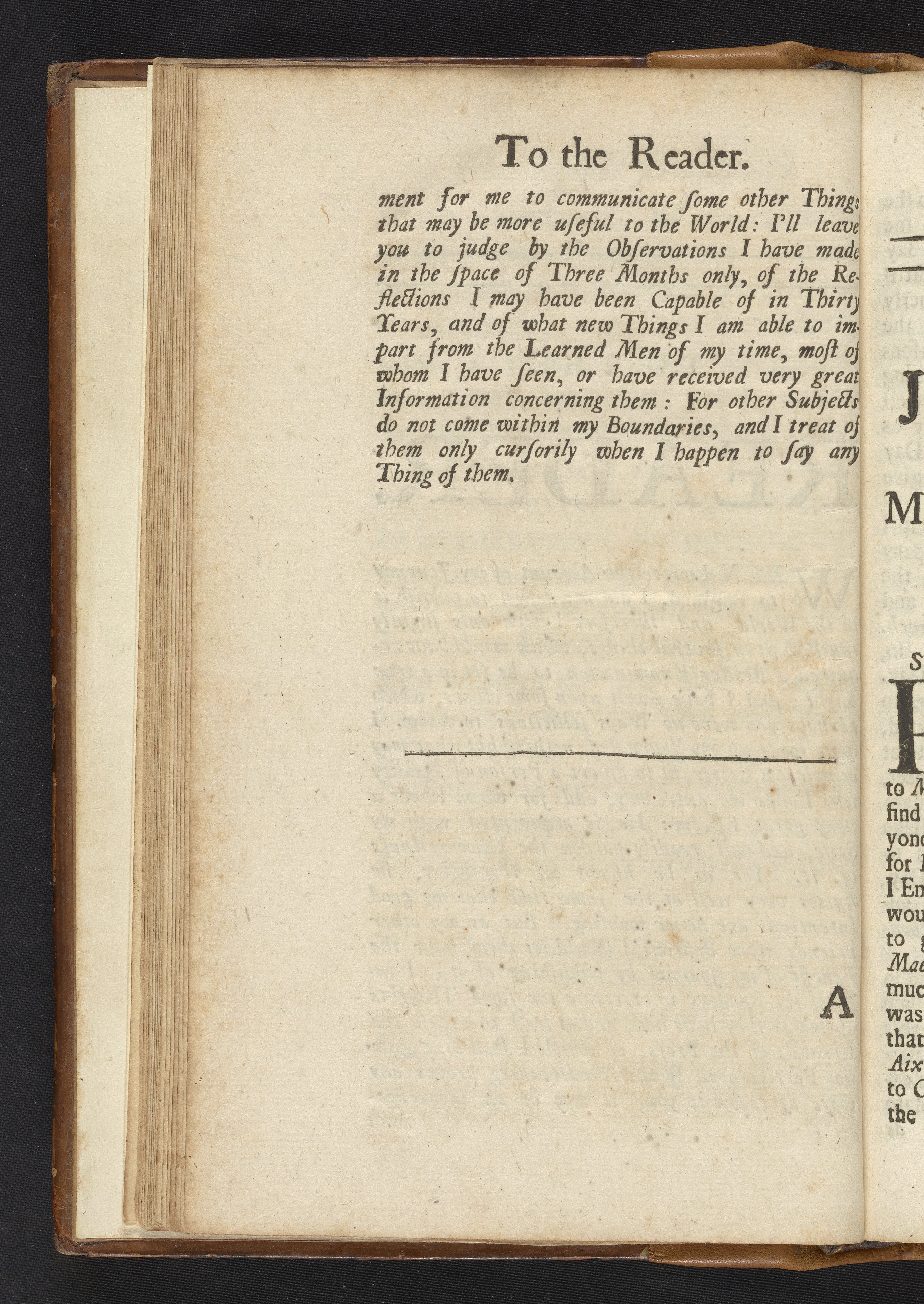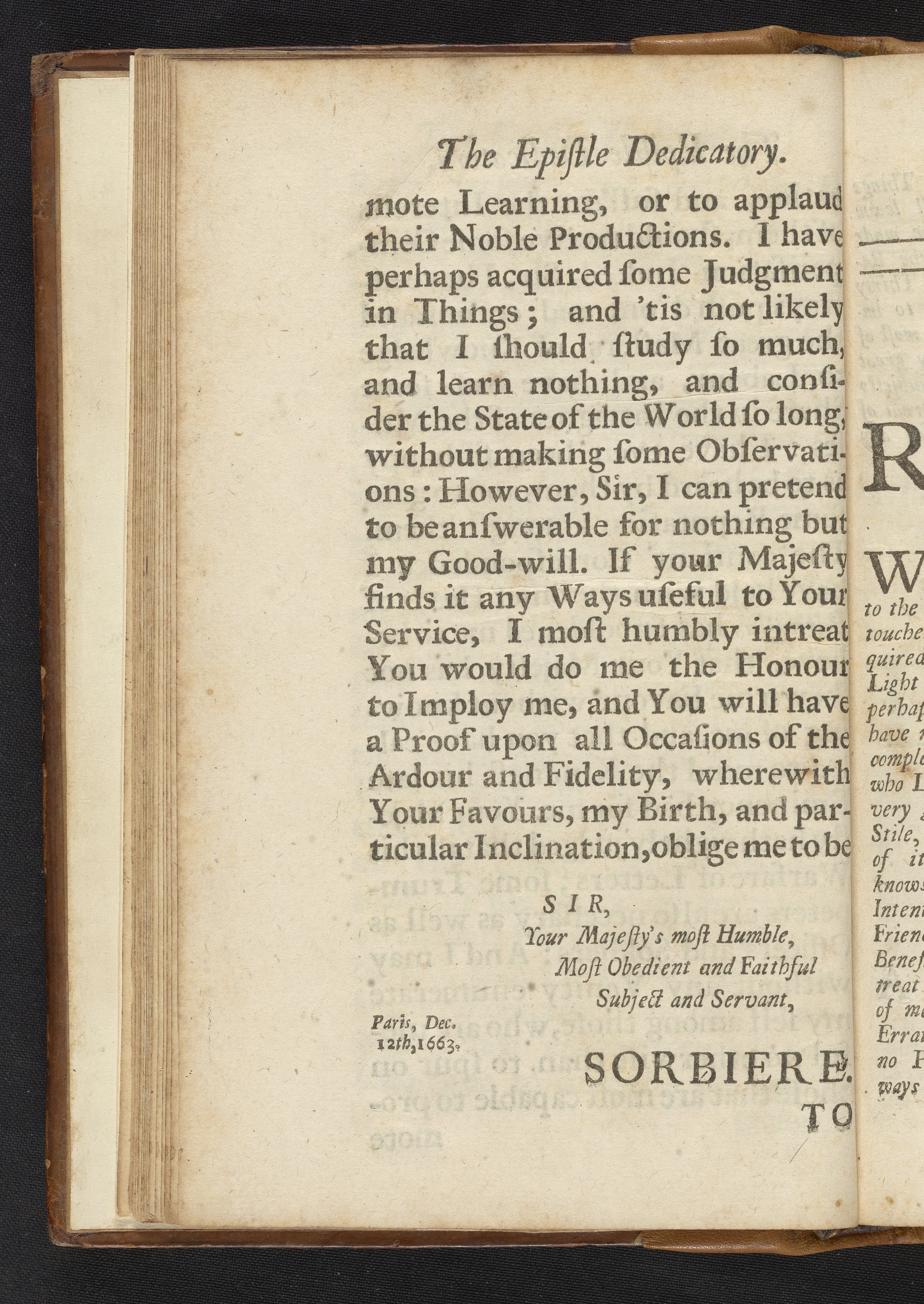 Small JPG1200 x 1693px — 414 KBLarge JPG2880 x 4062px — 2.3 MBFull-sized JPG3637 x 5130px — 3.4 MBOriginal fileTIFF — 3637 x 5130px — 53.4 MBThis book is an English translation of the French original, written in 1664. Written after Monsieur Sorbière (1615-1670) spent three months in 1663 in England, this book details his thoughts on several different topics. During his travels he had the opportunity to meet with many well-known scientists and physicians. The first section includes a memoir of his life, written by Mr. M. Graverol. The second section is that of Sorbière's observations on his travels through England. This section contains a plate of a mathematical representation of a "Model of a Floor." The third section is Thomas Sprat, the Royal Society's historian's, thoughts on Sorbière's observations, written to Dr. Wren, Professor of Astronomy at Oxford University. The final section is a letter from Monsieur Sorbière to Monsieur de Courcelles at Amsterdam regarding the Anglo-Dutch War of 1652-1654. The book also contains several one to two page sections of letters to the reader.