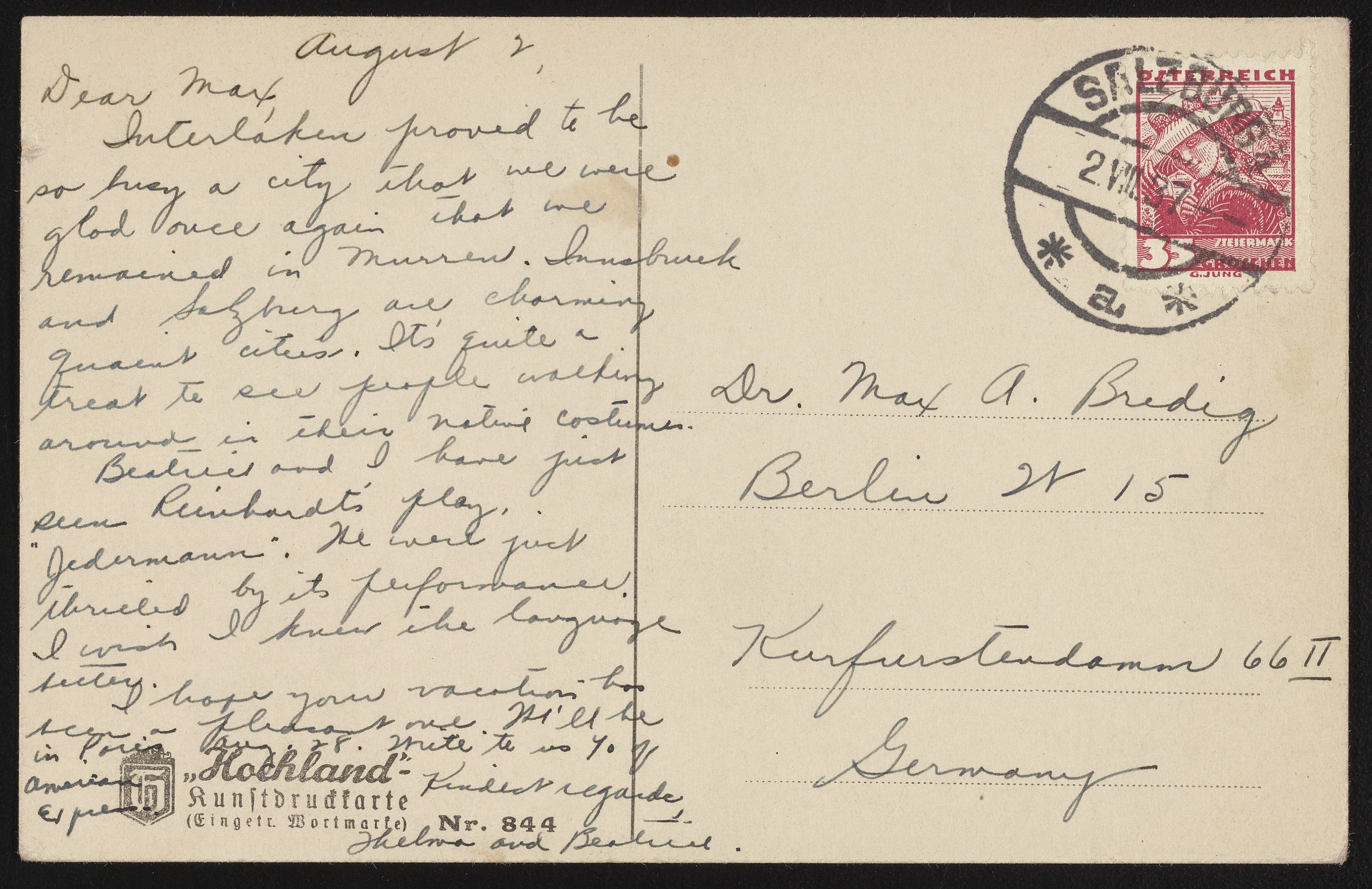 August, 1937 postcard of Salzburg, Germany to Max Bredig