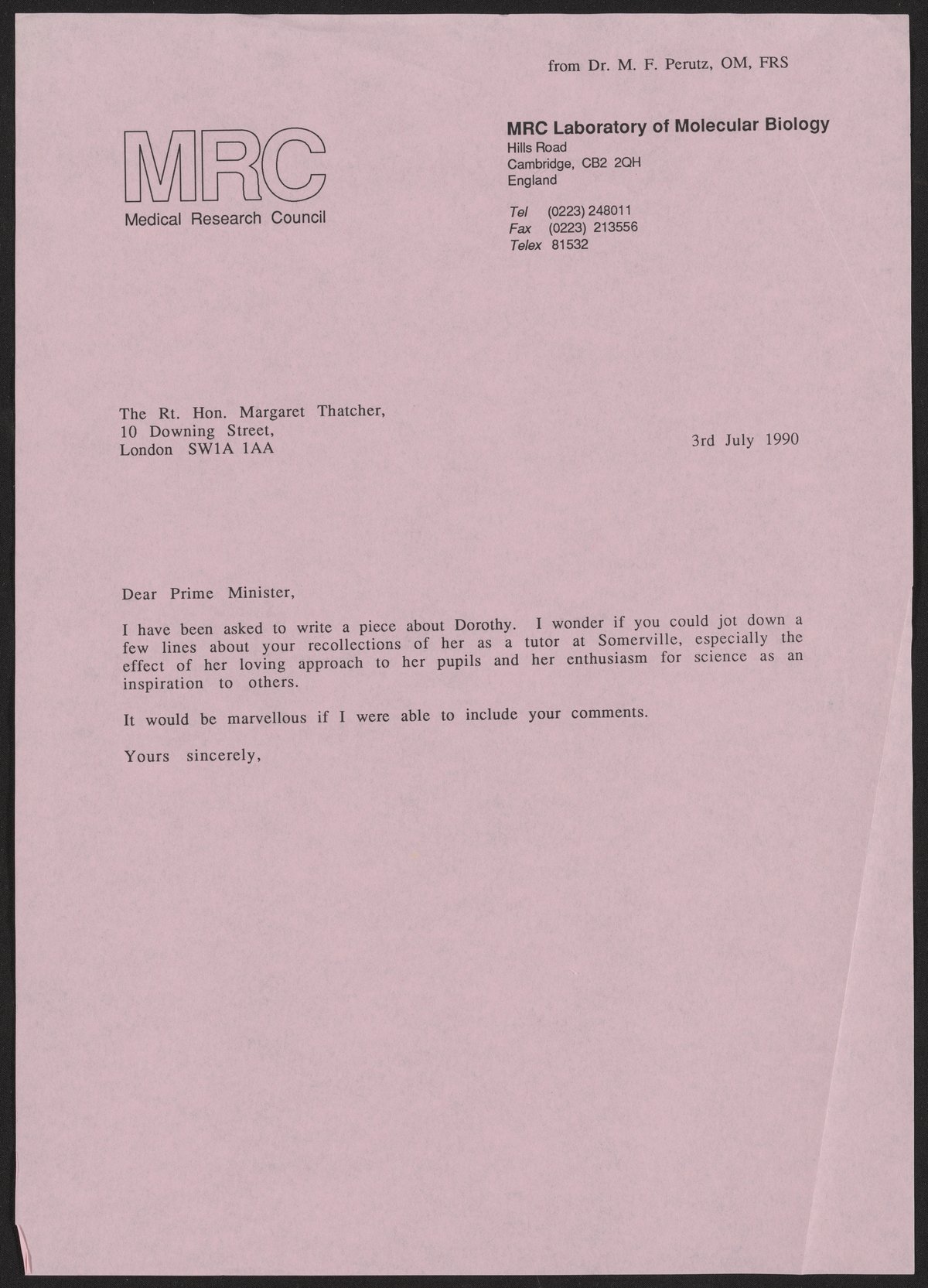 Letter from Max Perutz to Margaret Thatcher, July 3, 1990
