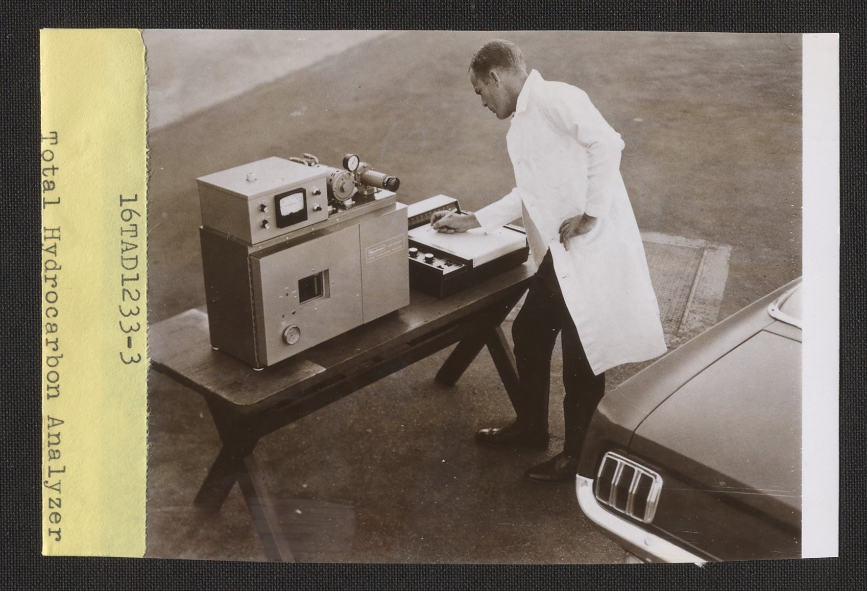 Dietrich, T. A. “Man Using a Total Hydrocarbon Analyzer beside a Car,” n.d. Beckman Historical Collection, Box 84. Science History Institute. Philadelphia. https://digital.sciencehistory.org/works/kd17ct15z.
