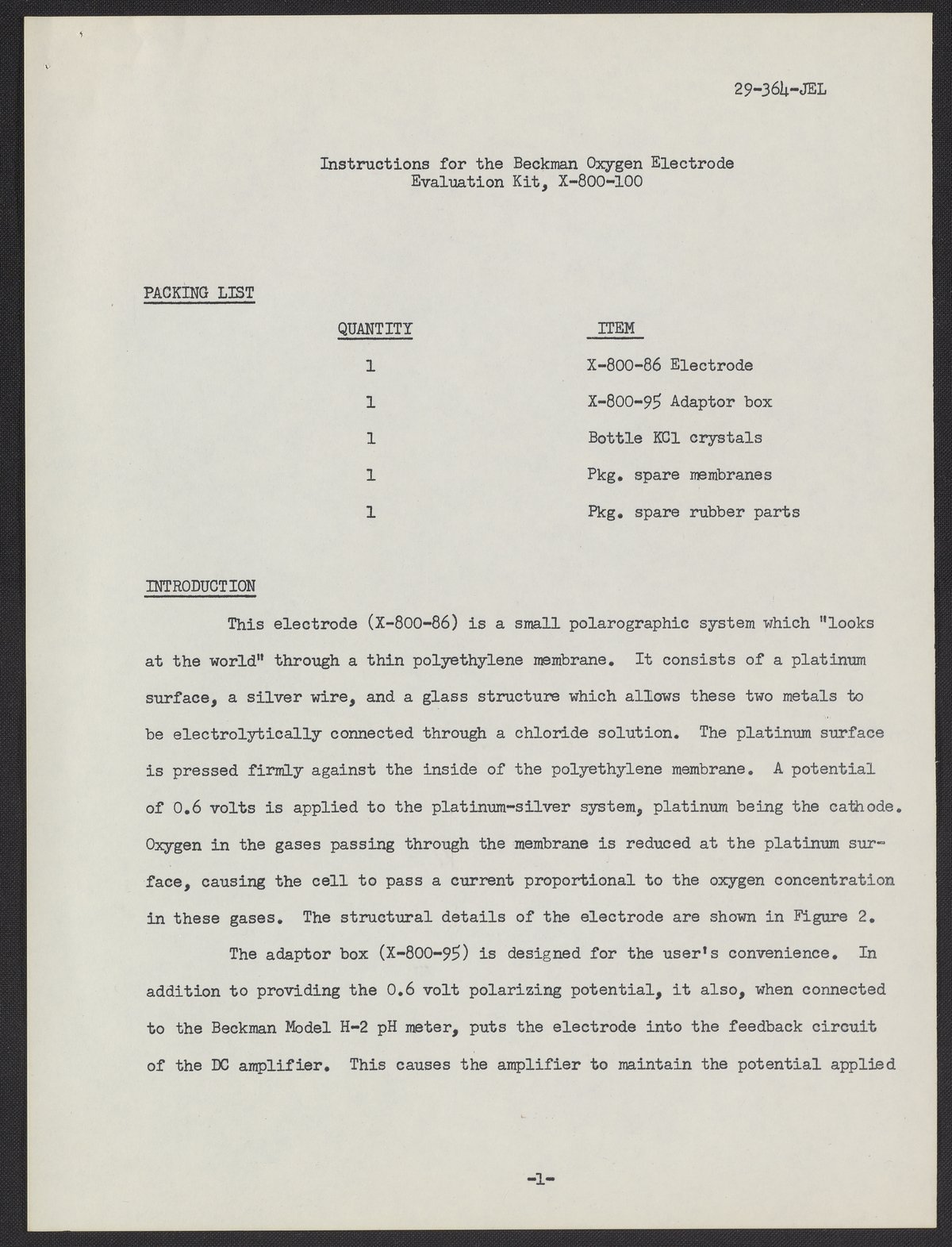 Instructions for the Beckman Oxygen Electrode Evaluation Kit, X-300-100 (final)