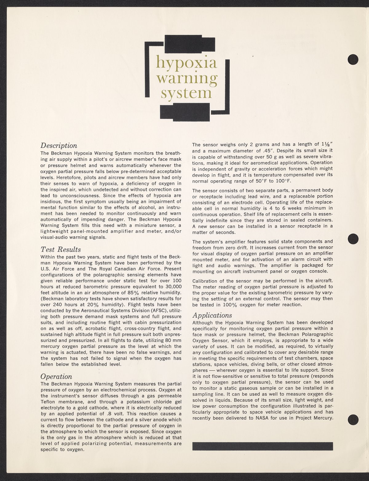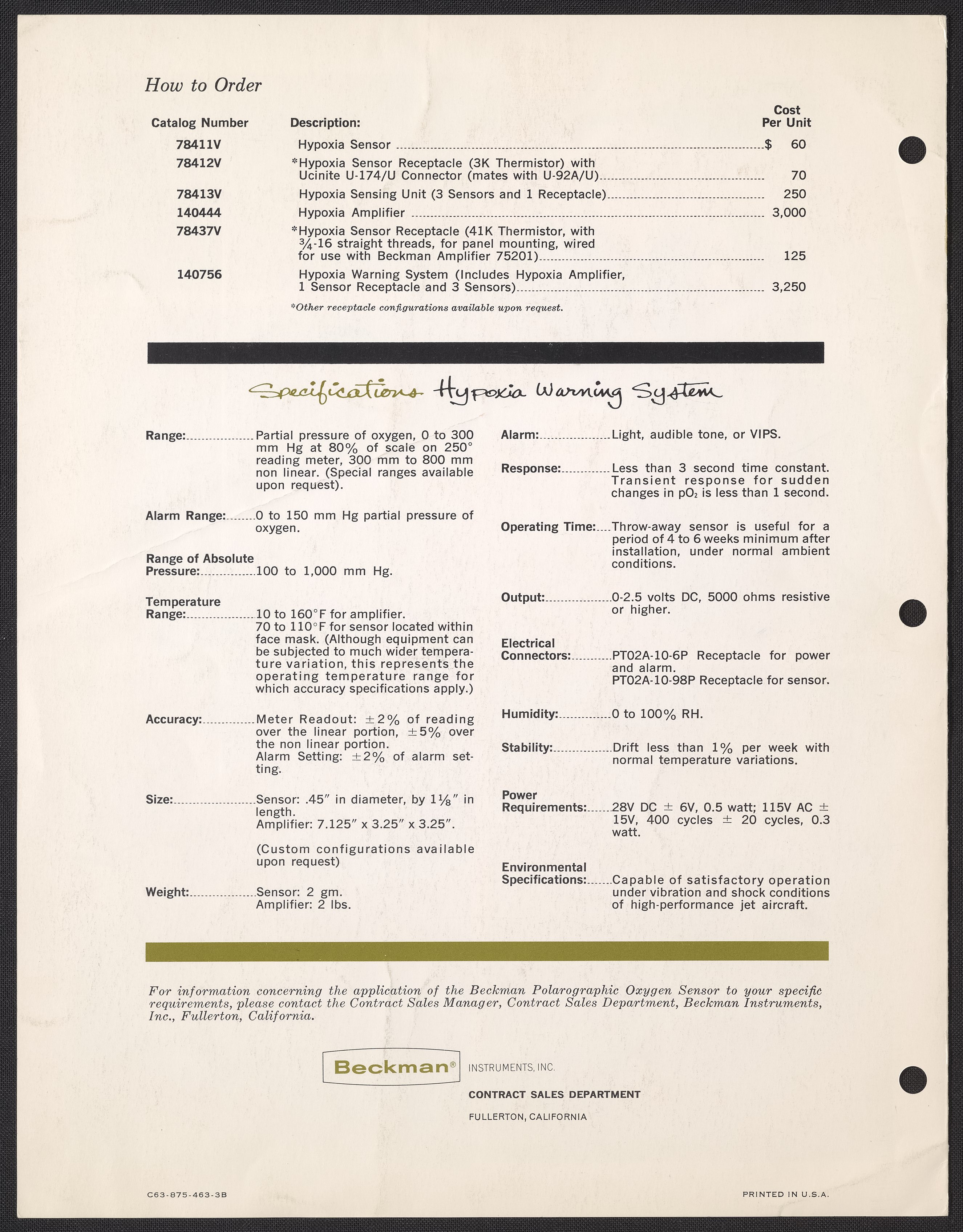 Beckman Instruments, Inc. “Hypoxia Warning System for Monitoring Partial Pressure of Oxygen in Artificial Atmospheric Environments,” circa 1963. Beckman Historical Collection, Box 16, Folder 12. Science History Institute. Philadelphia. https://digital.sciencehistory.org/works/kd17ct42v.