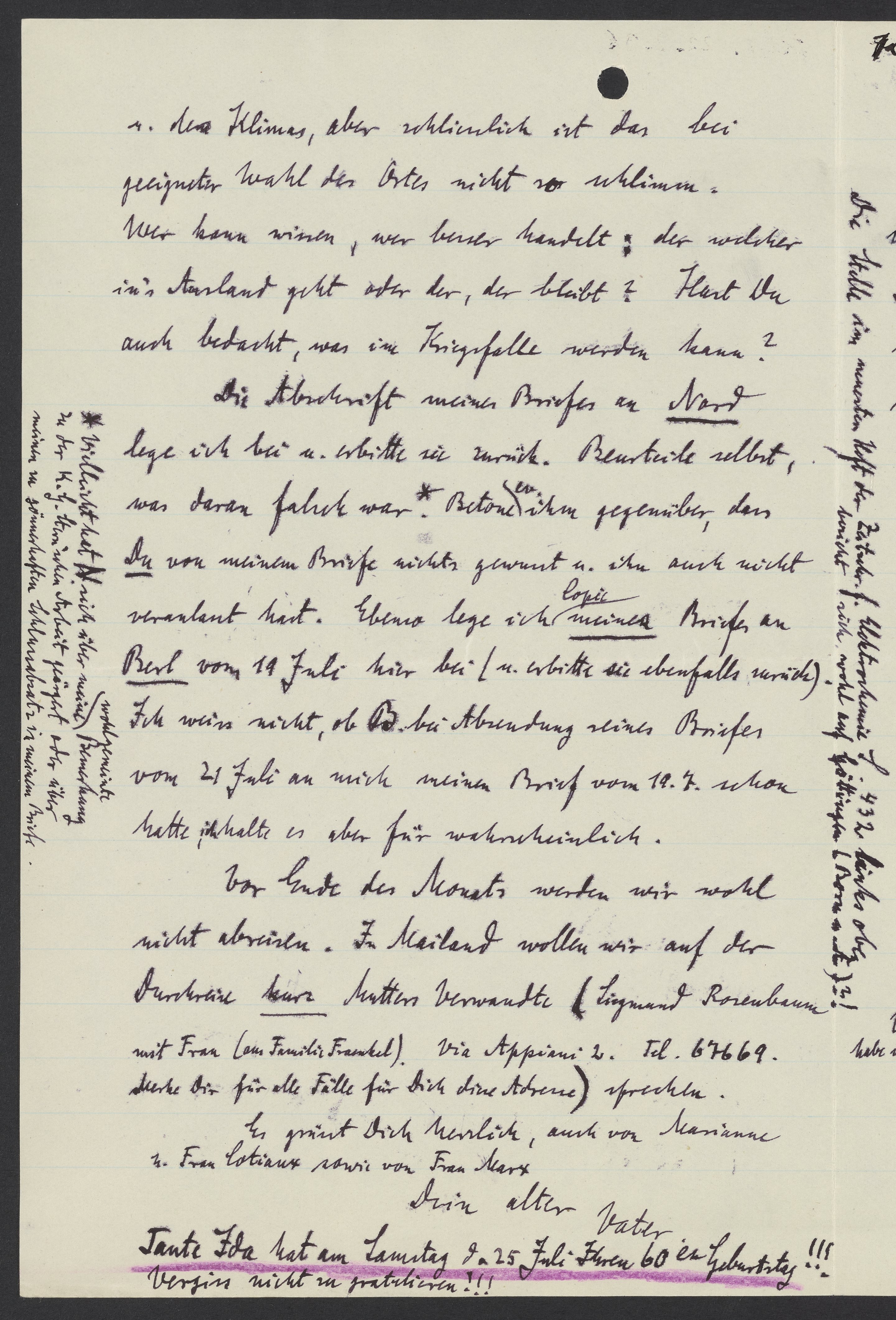 Die Abschrift meines Briefes an Nord lege ich bei u. erbitte sie zurück. Beurteile selbst was daran falsch war.* Betone ev. ihm gegenüber, dass Du von meinem Briefe nichts gewusst u. ihn auch nicht veranlasst hast. Ebenso lege ich Copie meines Briefes an Berl vom 19. Juli hier bei (u. erbitte sie ebenfalls zurück). Ich weiss nicht, ob B. bei Absendung seines Briefes vom 21 Juli an mich meinen Brief vom 19.7. schon hatte, ich halte es aber für wahrscheinlich.