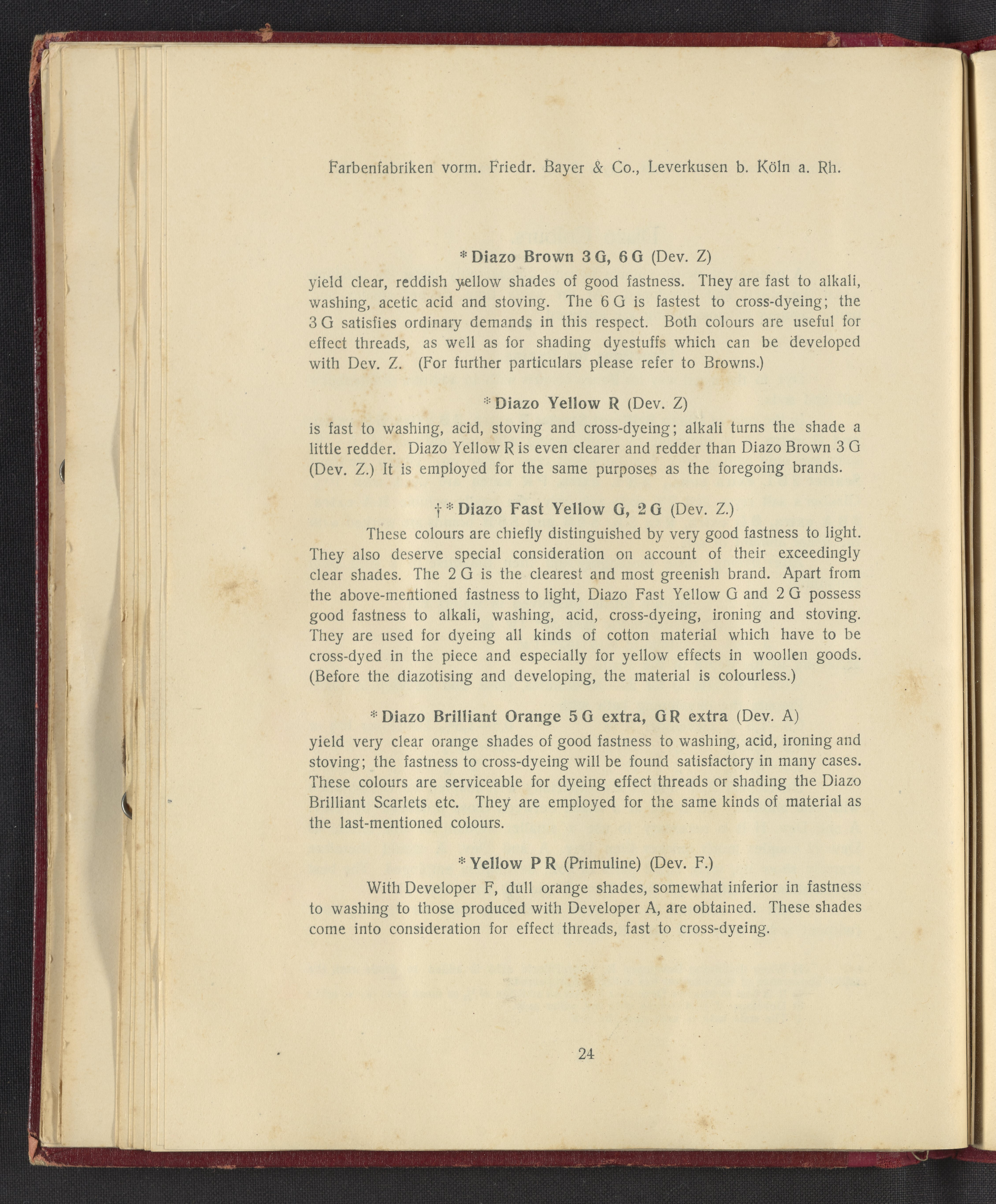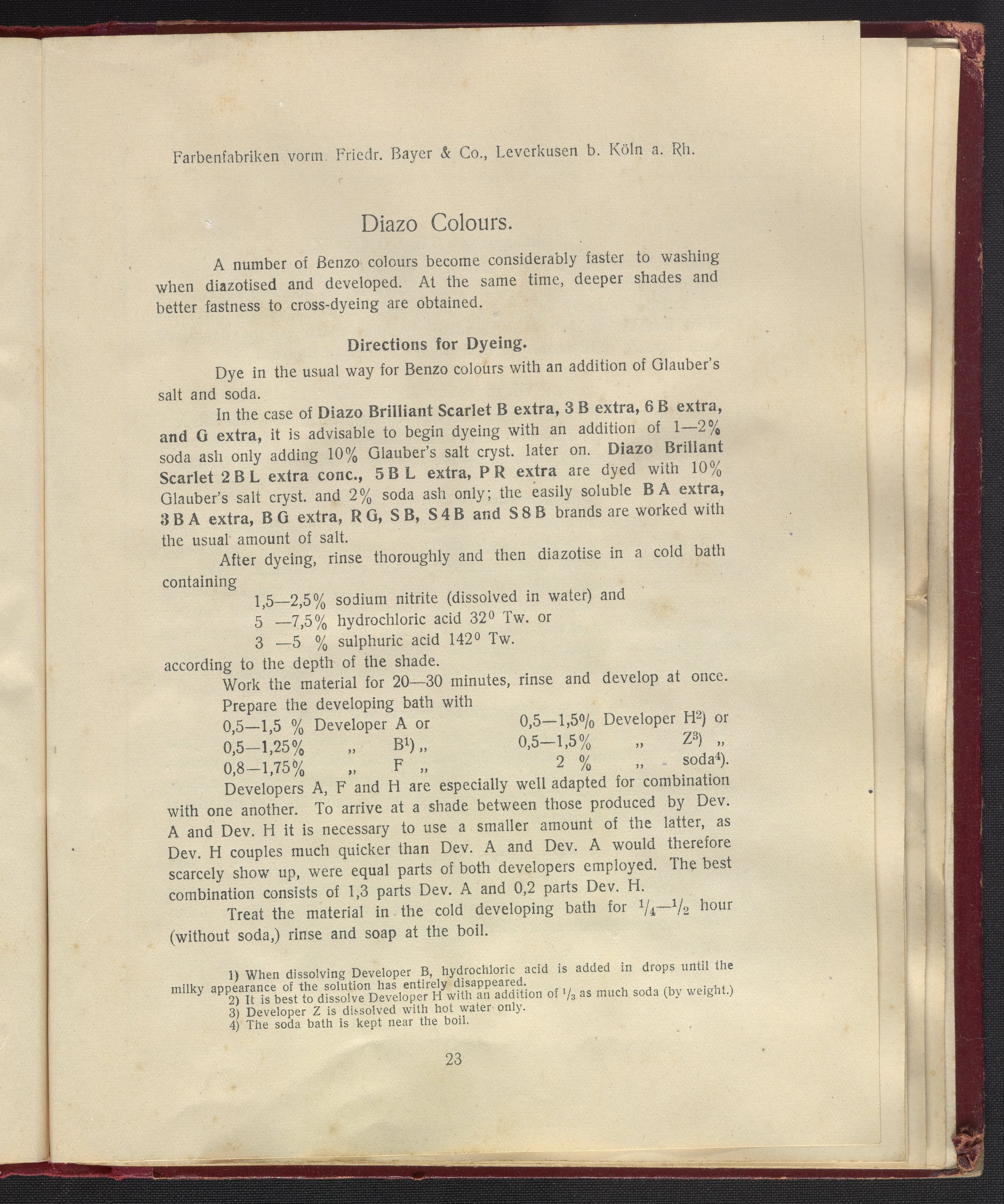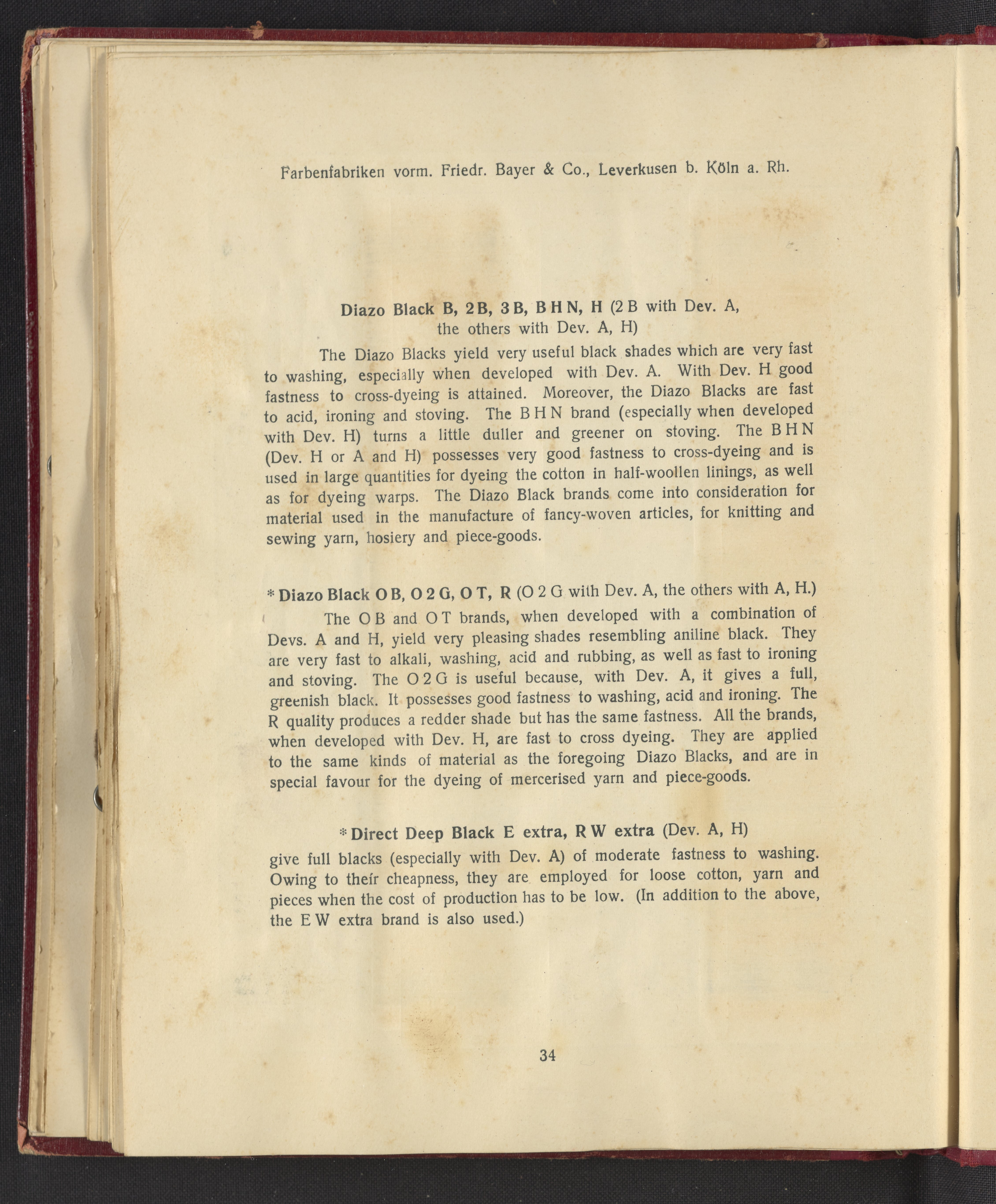 Farbenfabriken vorm. Friedrich Bayer & Co. Benzo Colours on Cotton Yarn, Part II. Leverkusen, Germany, 1921. https://digital.sciencehistory.org/works/kh04dp745.