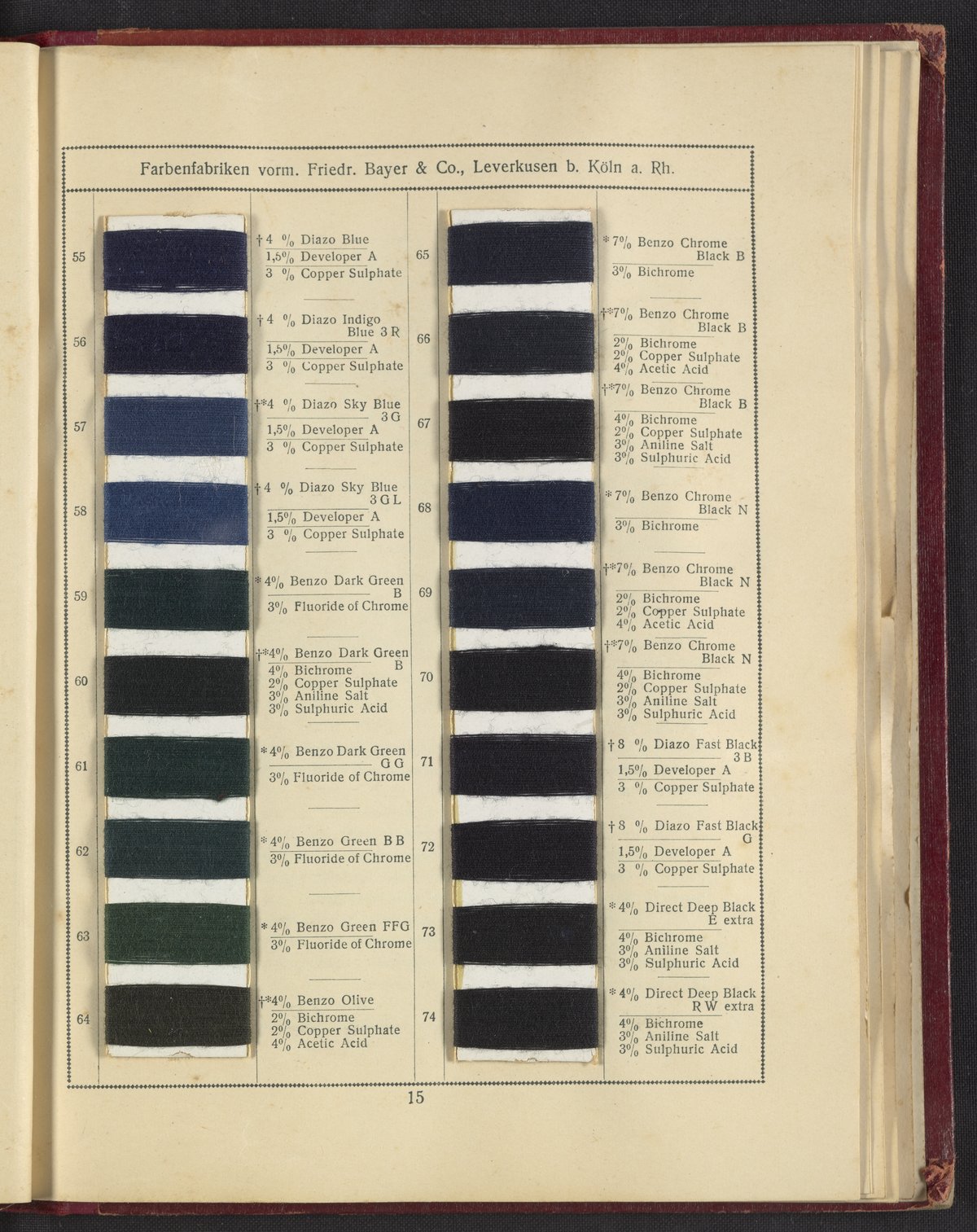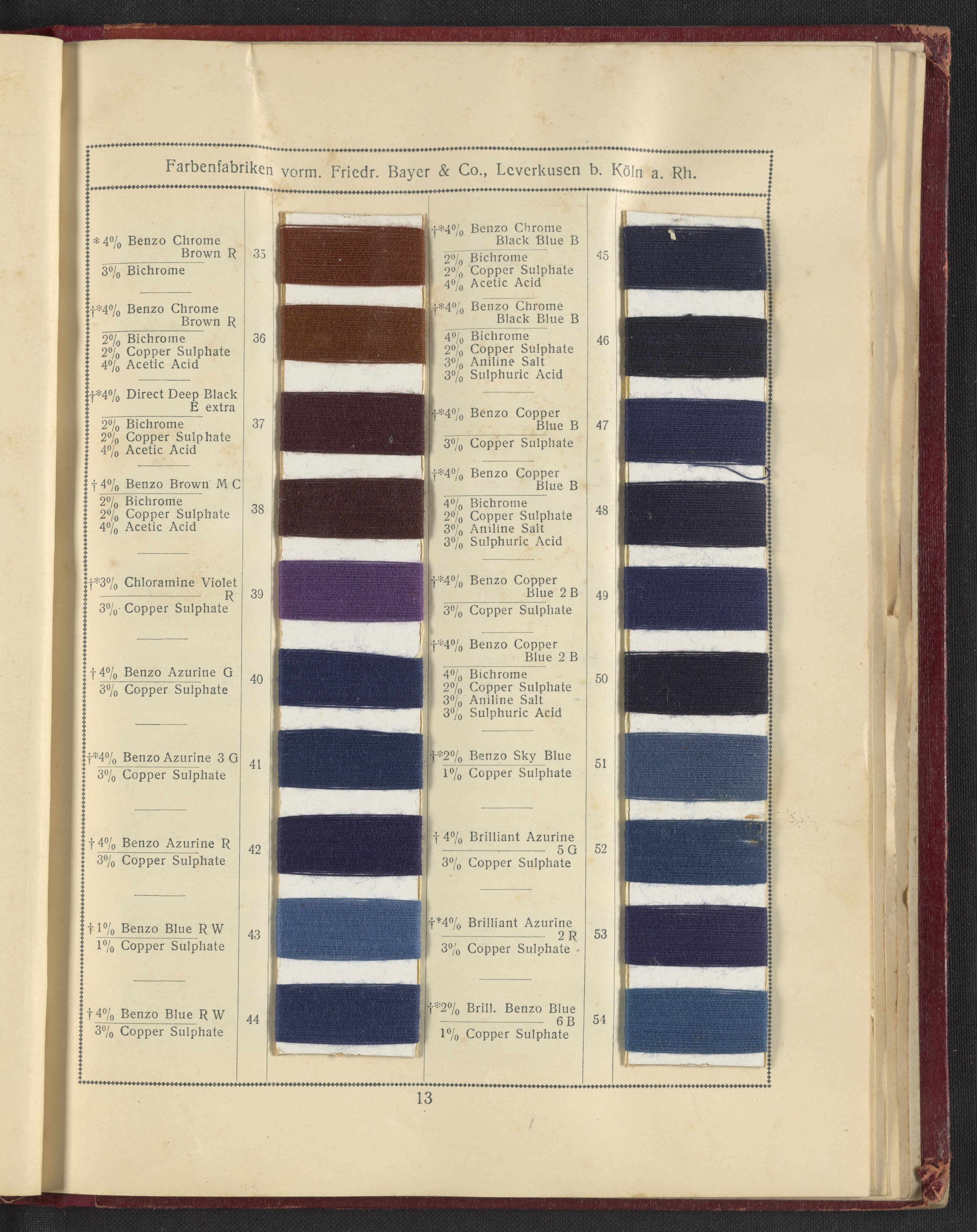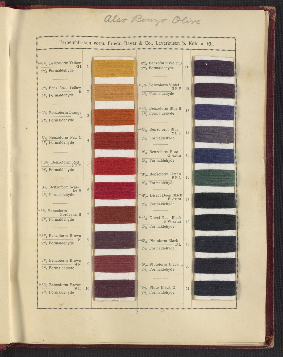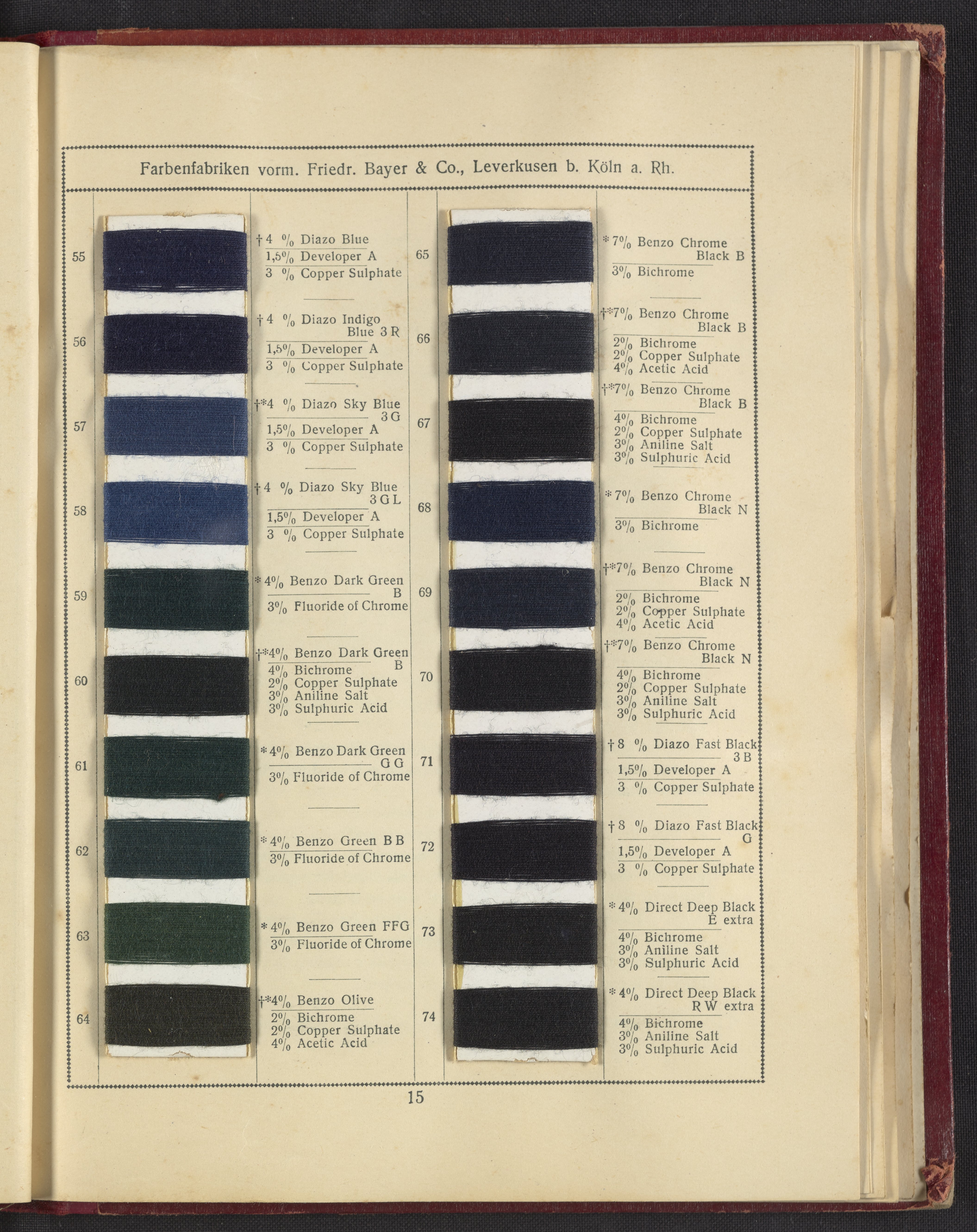 Small JPG1200 x 1459px — 446 KBLarge JPG2880 x 3502px — 2.5 MBFull-sized JPG4372 x 5316px — 5.0 MBOriginal fileTIFF — 4372 x 5316px — 66.6 MBPart II of a sample book from Farbenfabriken vorm. Friedrich Bayer & Co.—the first incarnation of the modern pharmaceutical company Bayer AG established to manufacture and sell synthetic dyestuffs—containing mounted dyed yarn and cotton thread samples. Benzo refers to benzene, indicating the chemistry of direct cotton color from coal-tar derivatives. The samples illustrate benzo colors after treatment with formaldehyde and metallic salts, coupled with parazole FB, and diazotized and developed. The text includes directions, dye concentrations and formulas, and information on color fastness.