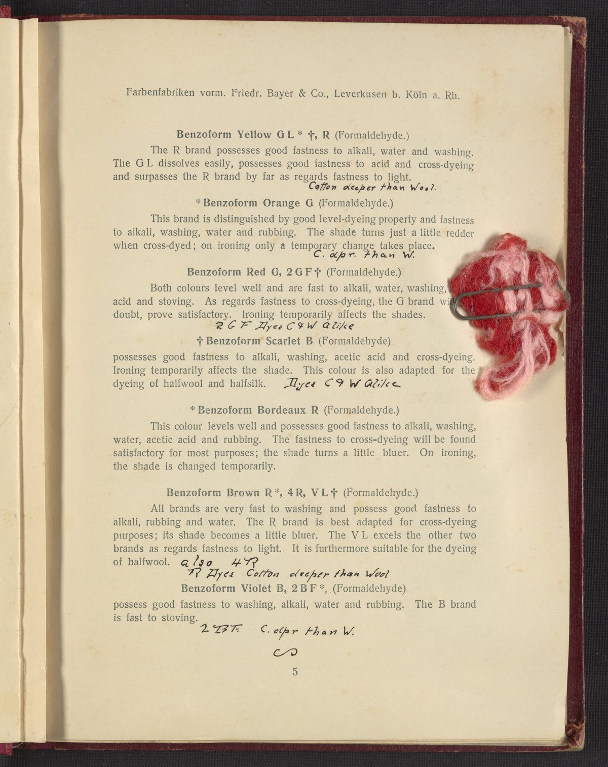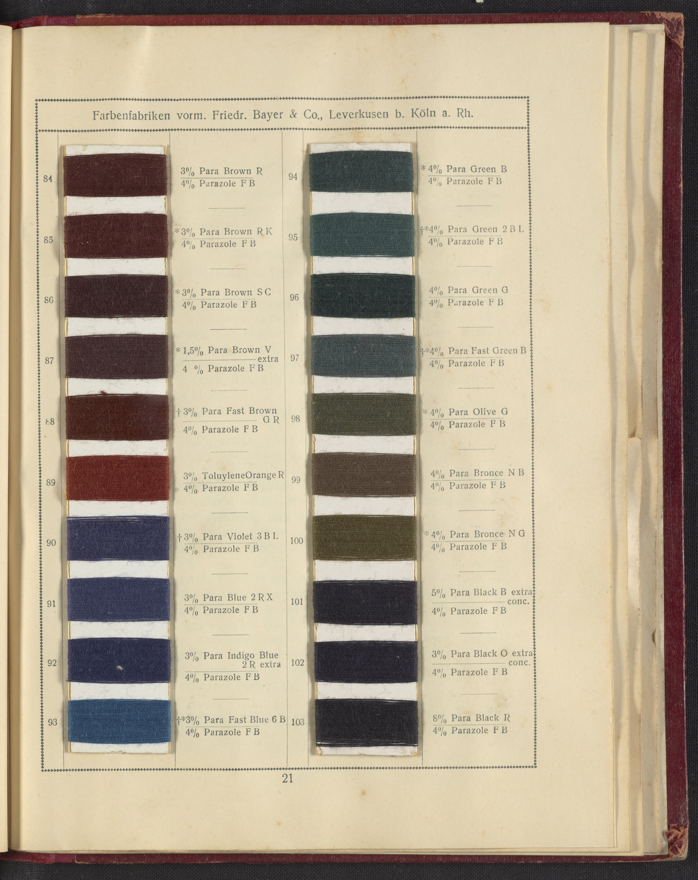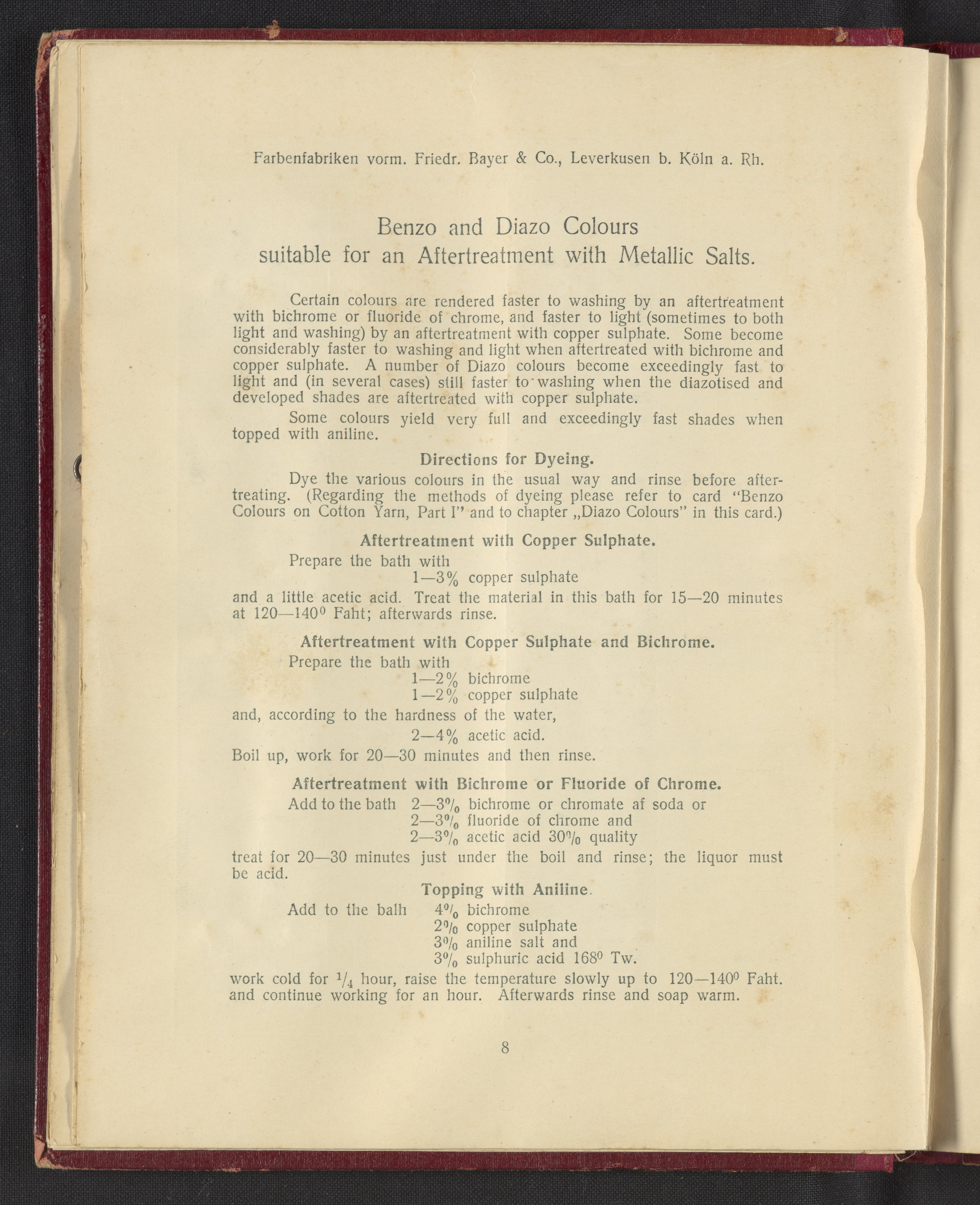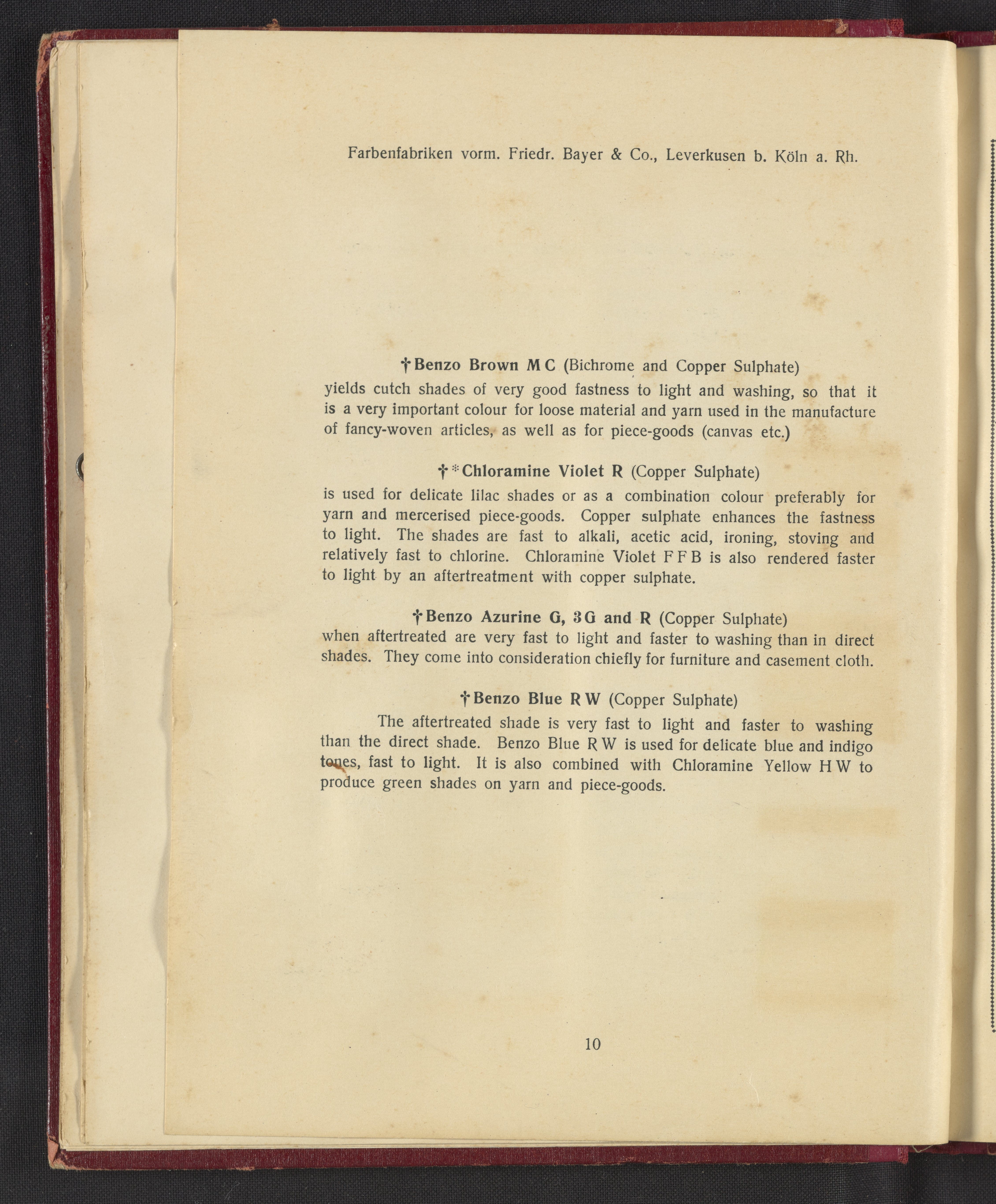 Small JPG1200 x 1459px — 446 KBLarge JPG2880 x 3502px — 2.5 MBFull-sized JPG4372 x 5316px — 5.0 MBOriginal fileTIFF — 4372 x 5316px — 66.6 MBPart II of a sample book from Farbenfabriken vorm. Friedrich Bayer & Co.—the first incarnation of the modern pharmaceutical company Bayer AG established to manufacture and sell synthetic dyestuffs—containing mounted dyed yarn and cotton thread samples. Benzo refers to benzene, indicating the chemistry of direct cotton color from coal-tar derivatives. The samples illustrate benzo colors after treatment with formaldehyde and metallic salts, coupled with parazole FB, and diazotized and developed. The text includes directions, dye concentrations and formulas, and information on color fastness.