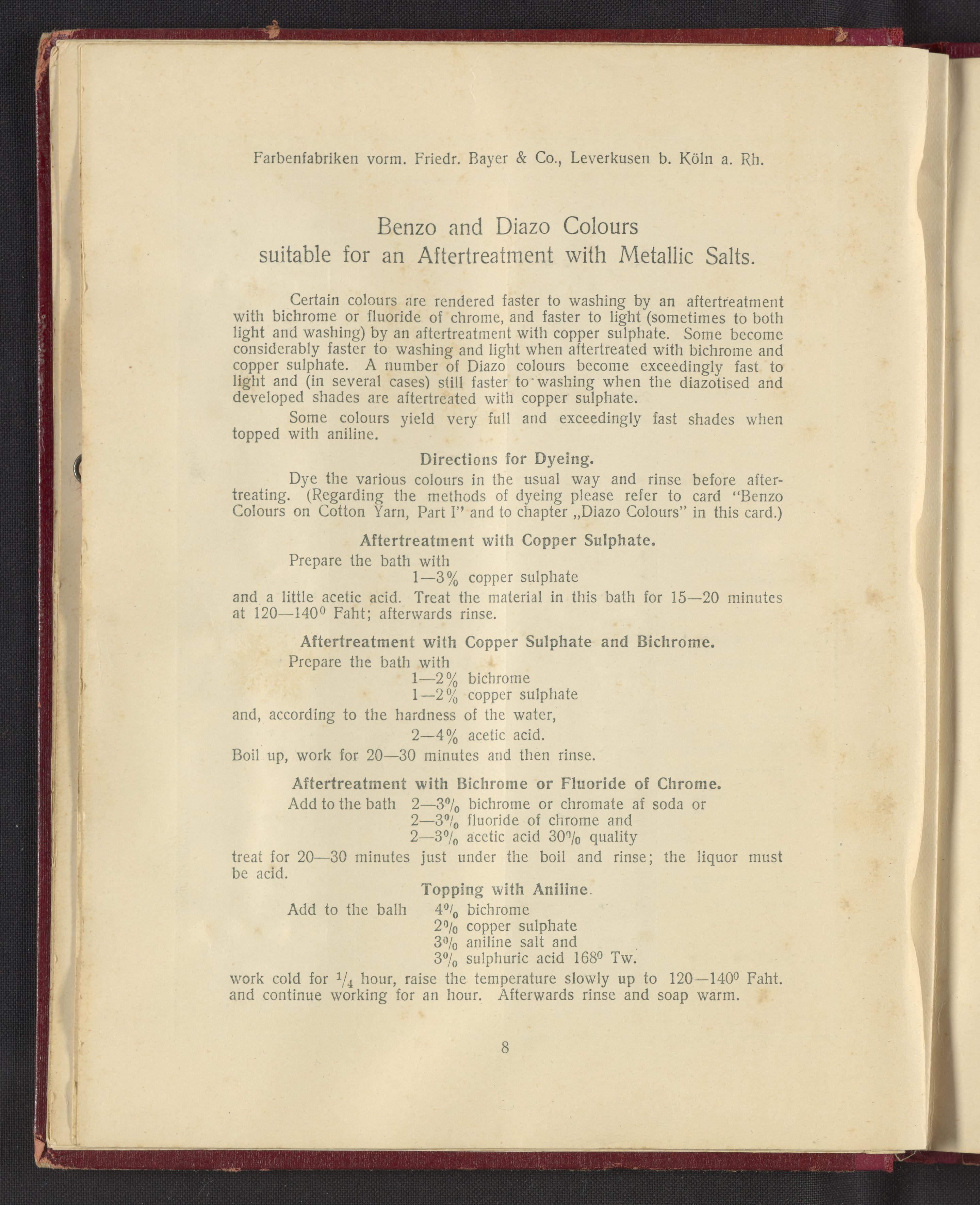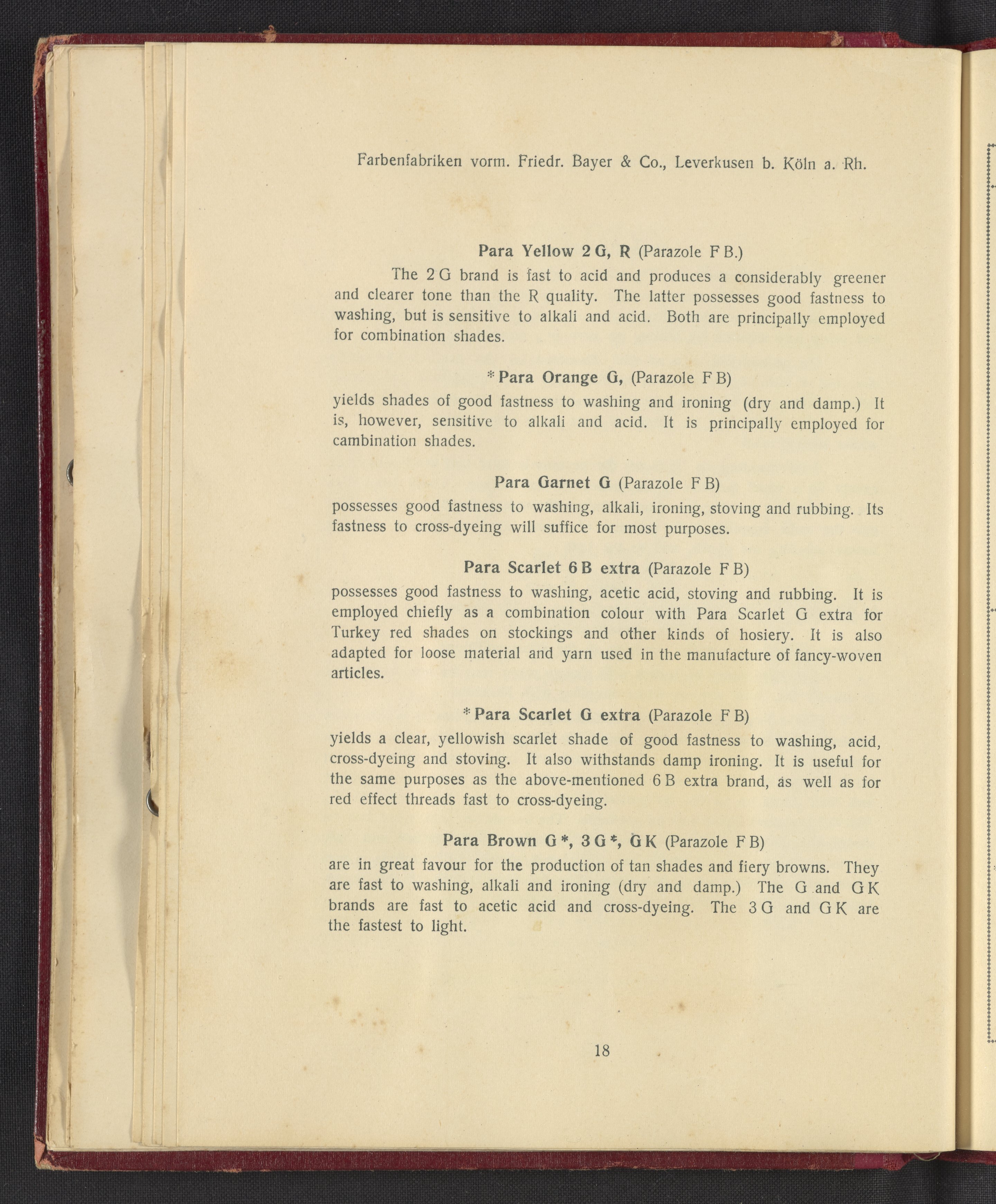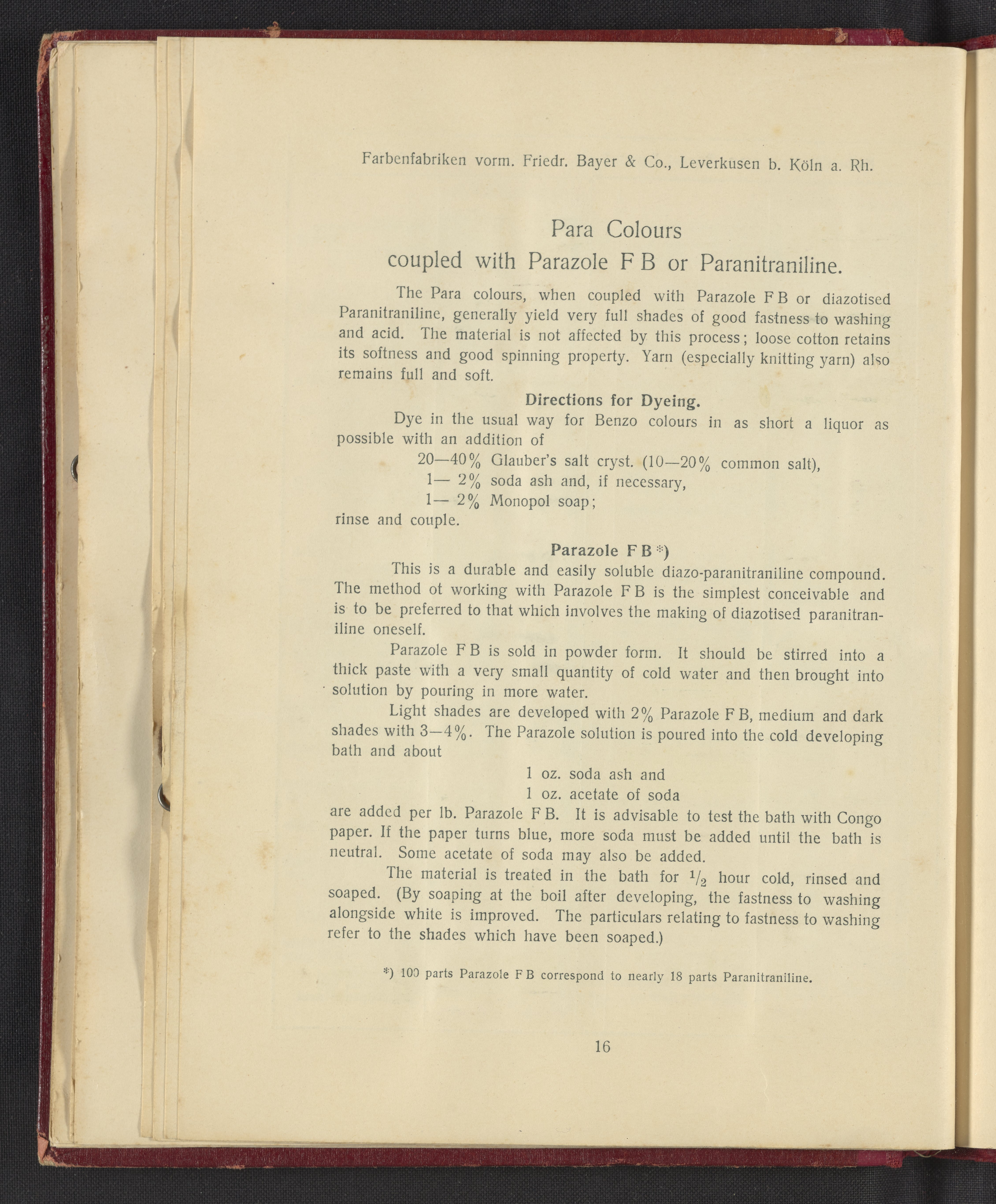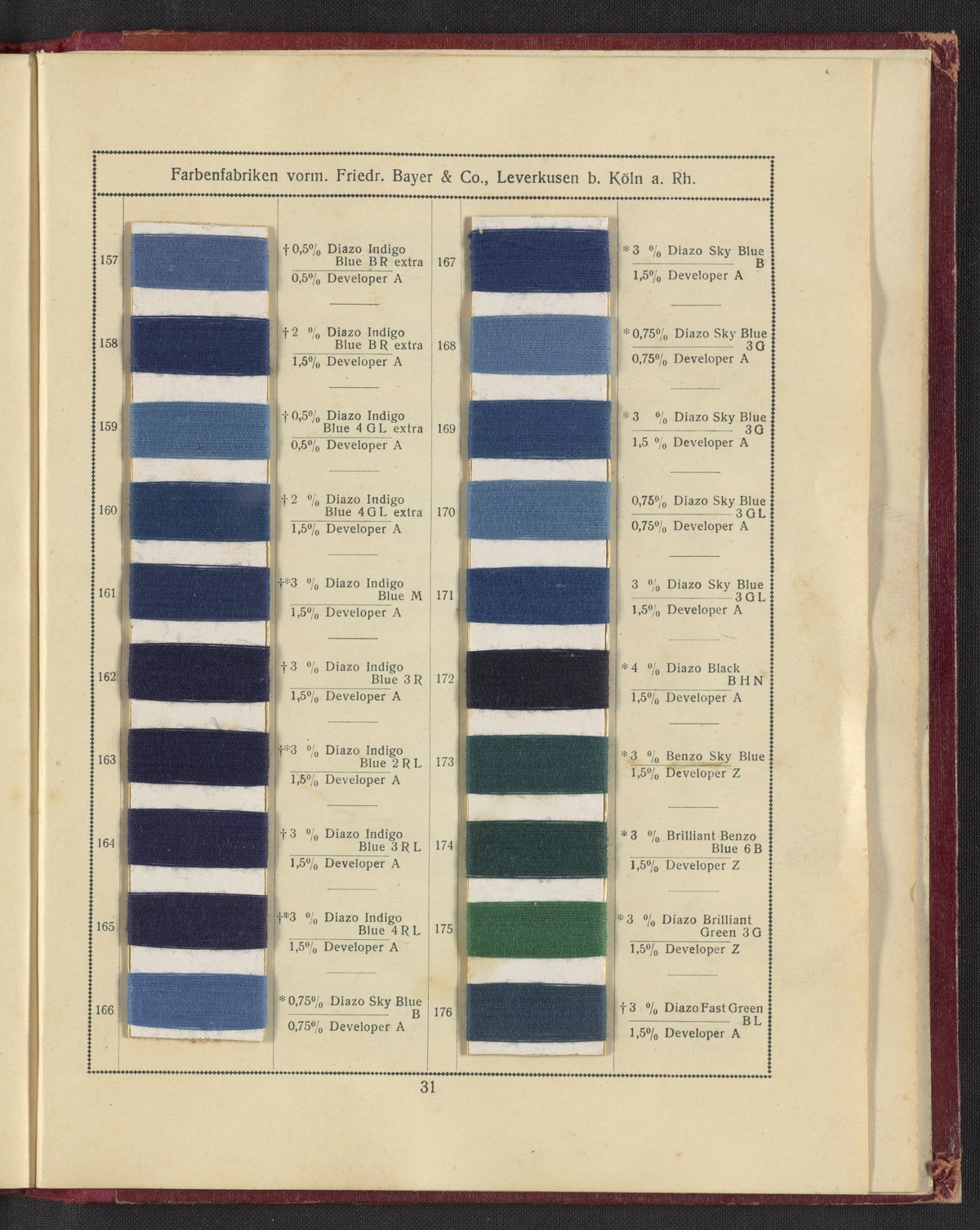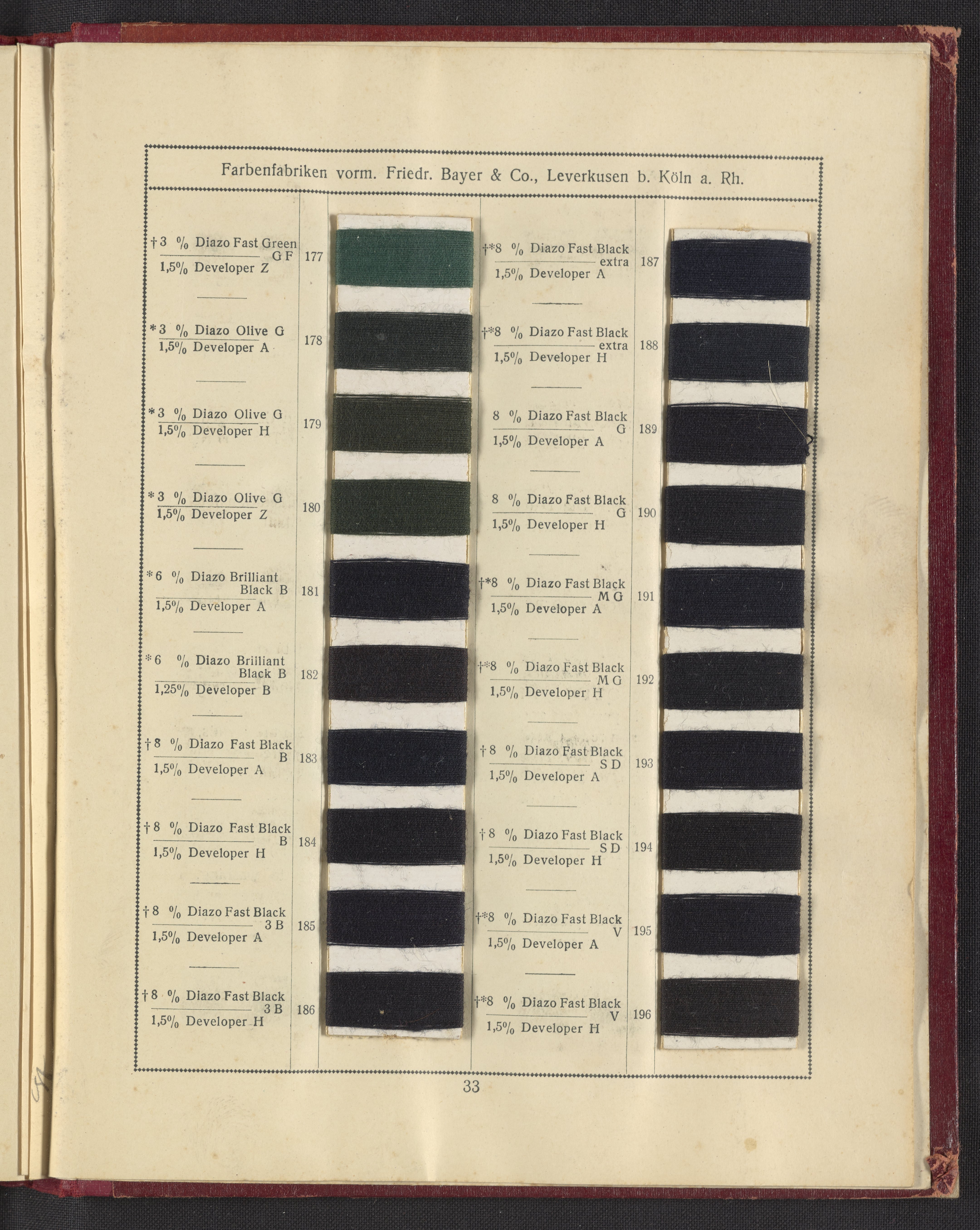 Small JPG1200 x 1459px — 446 KBLarge JPG2880 x 3502px — 2.5 MBFull-sized JPG4372 x 5316px — 5.0 MBOriginal fileTIFF — 4372 x 5316px — 66.6 MBPart II of a sample book from Farbenfabriken vorm. Friedrich Bayer & Co.—the first incarnation of the modern pharmaceutical company Bayer AG established to manufacture and sell synthetic dyestuffs—containing mounted dyed yarn and cotton thread samples. Benzo refers to benzene, indicating the chemistry of direct cotton color from coal-tar derivatives. The samples illustrate benzo colors after treatment with formaldehyde and metallic salts, coupled with parazole FB, and diazotized and developed. The text includes directions, dye concentrations and formulas, and information on color fastness.