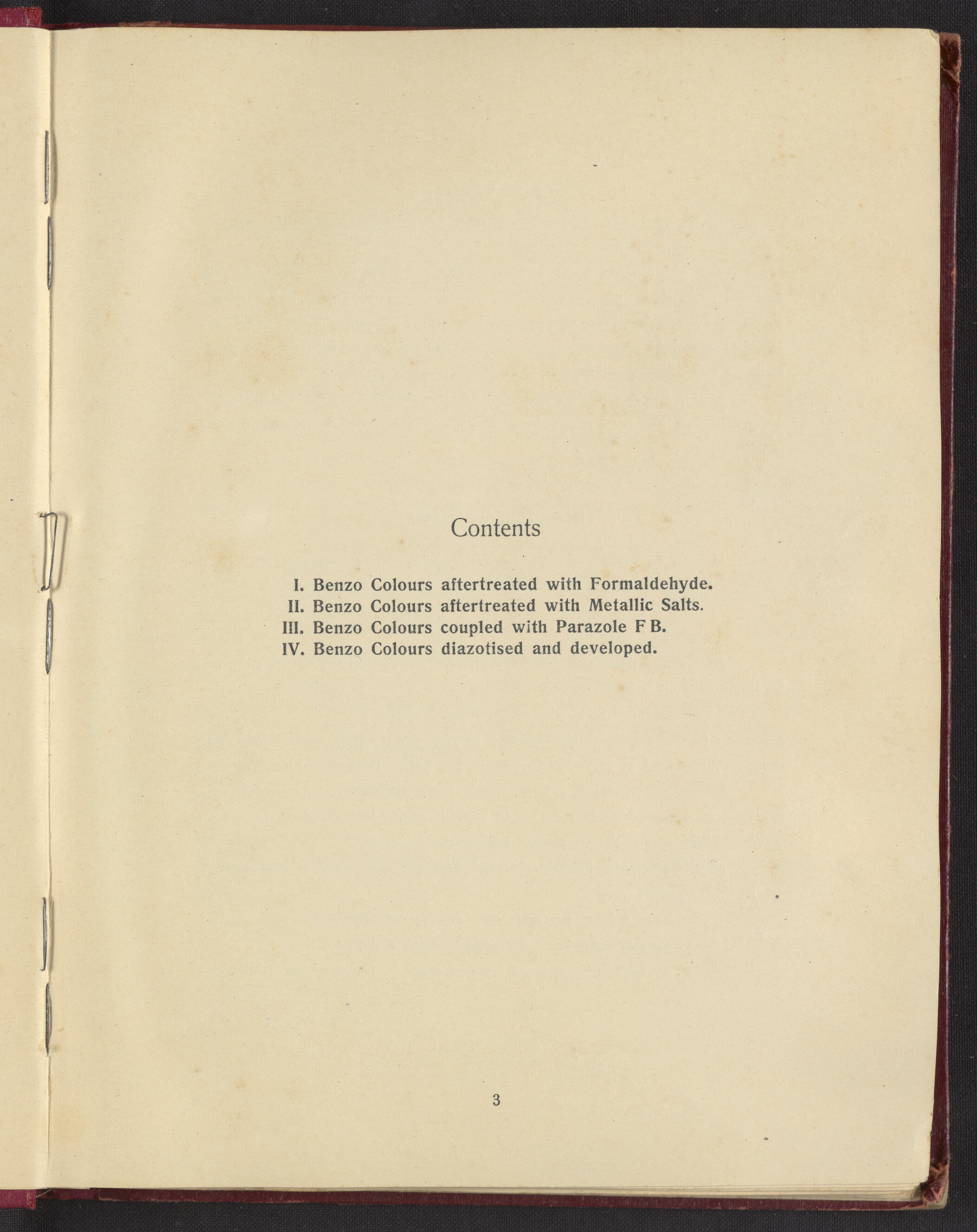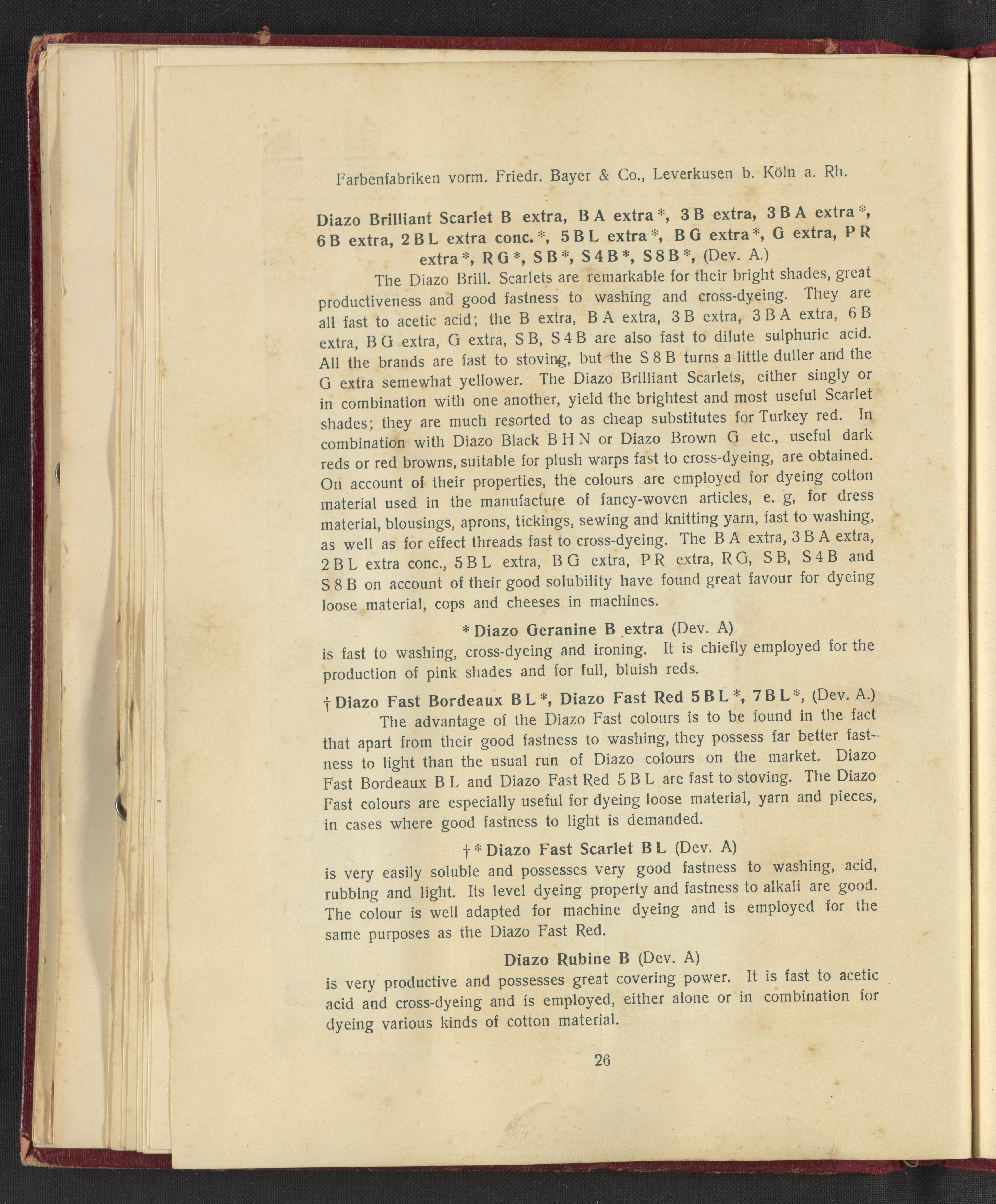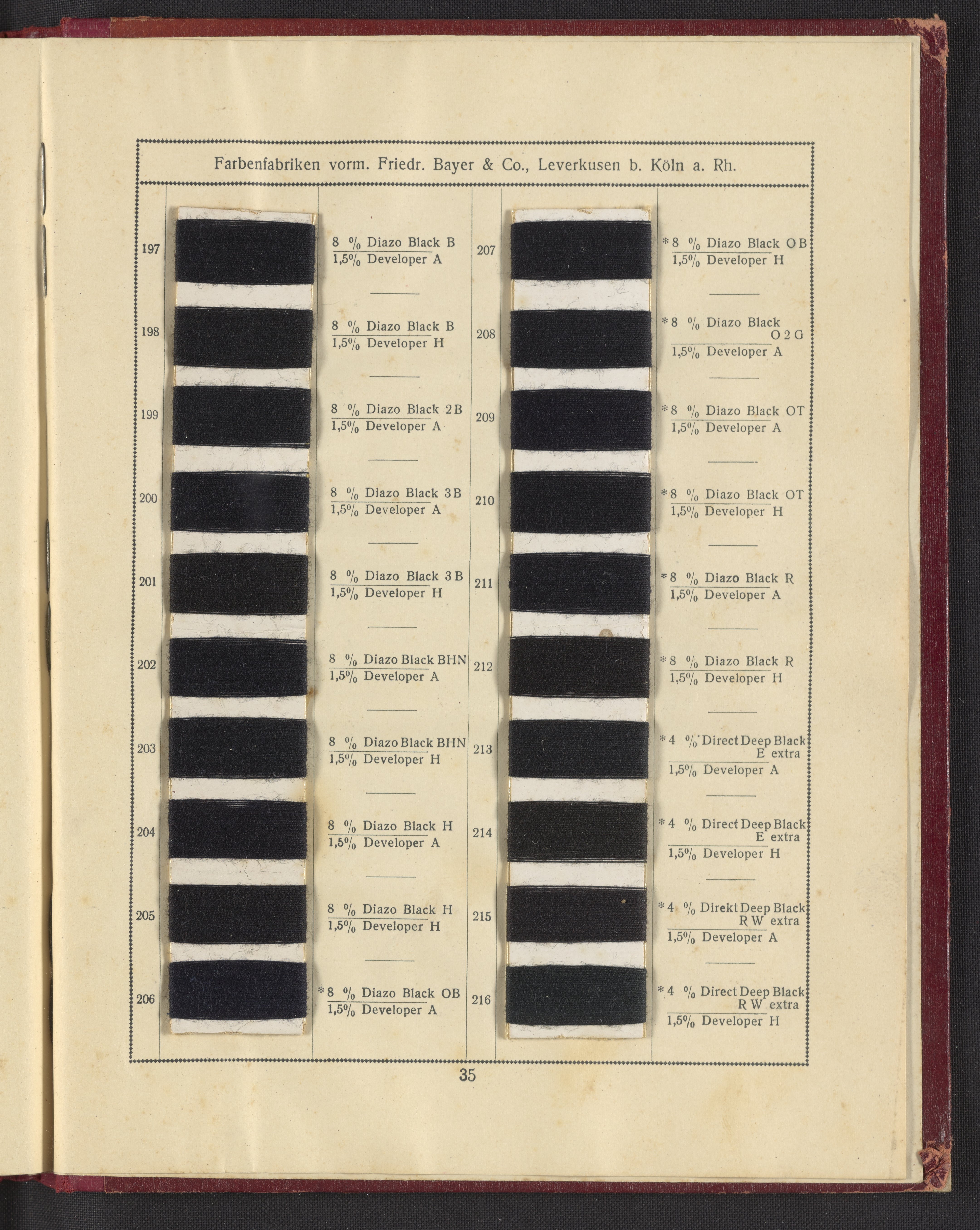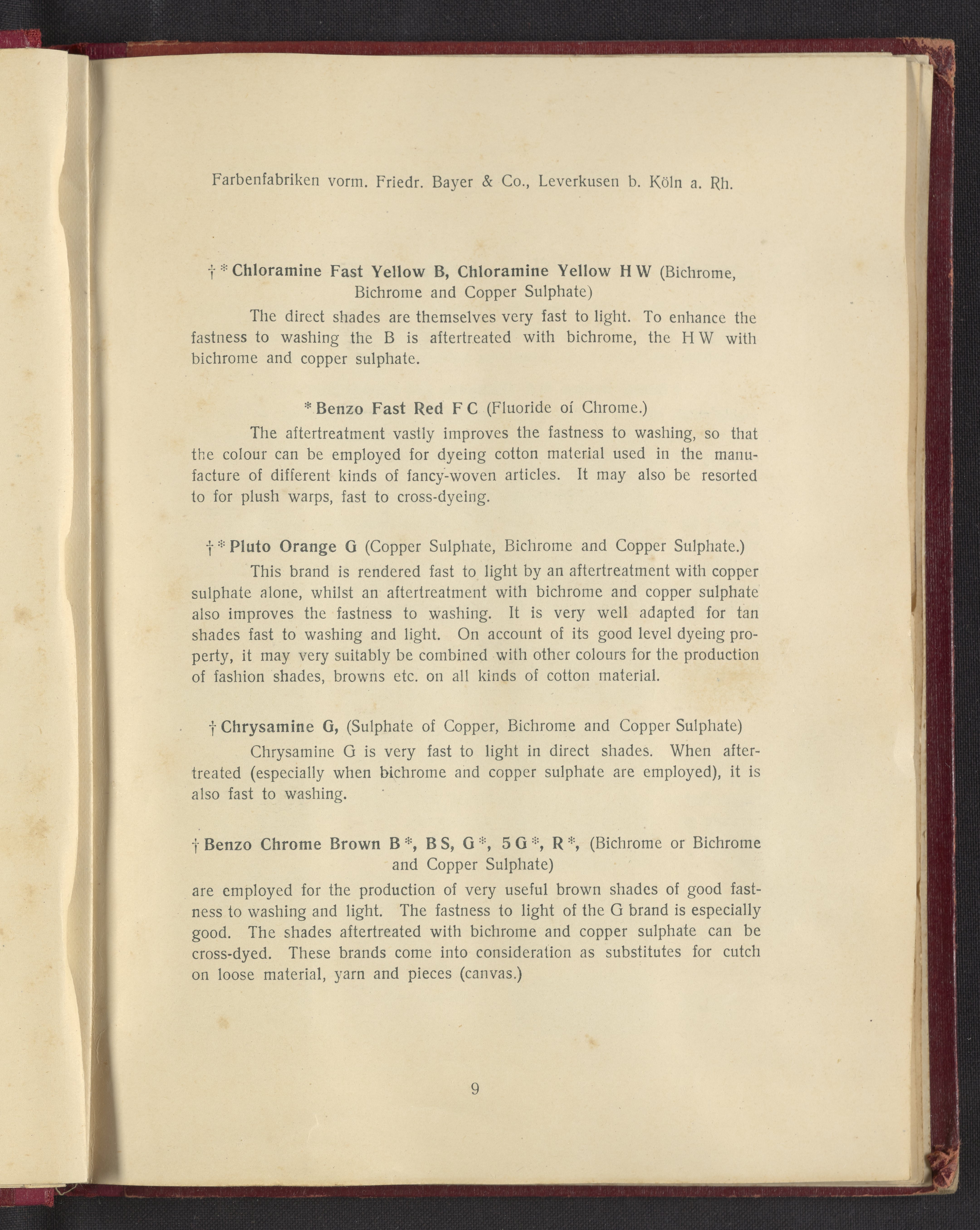 Small JPG1200 x 1459px — 446 KBLarge JPG2880 x 3502px — 2.5 MBFull-sized JPG4372 x 5316px — 5.0 MBOriginal fileTIFF — 4372 x 5316px — 66.6 MBPart II of a sample book from Farbenfabriken vorm. Friedrich Bayer & Co.—the first incarnation of the modern pharmaceutical company Bayer AG established to manufacture and sell synthetic dyestuffs—containing mounted dyed yarn and cotton thread samples. Benzo refers to benzene, indicating the chemistry of direct cotton color from coal-tar derivatives. The samples illustrate benzo colors after treatment with formaldehyde and metallic salts, coupled with parazole FB, and diazotized and developed. The text includes directions, dye concentrations and formulas, and information on color fastness.
