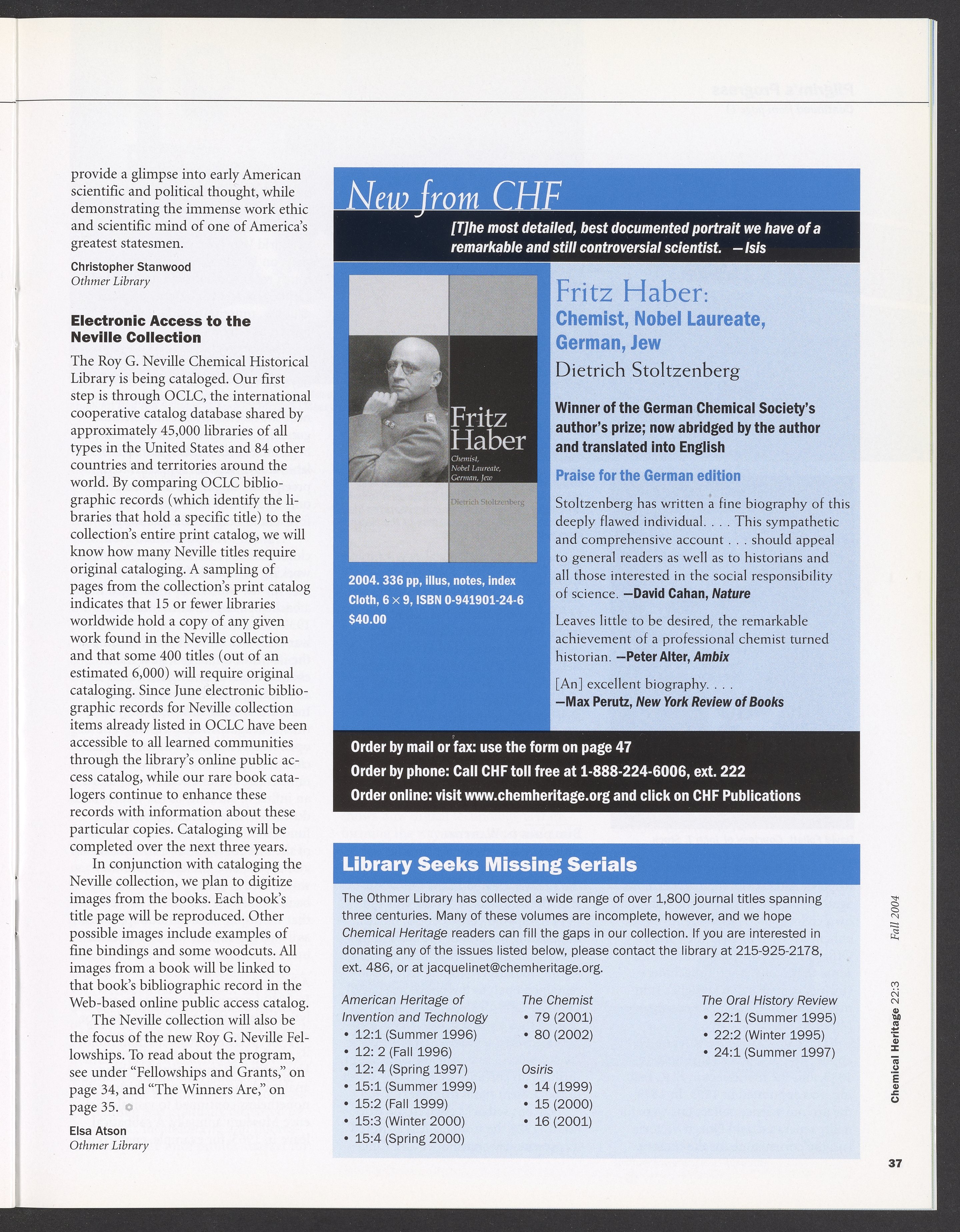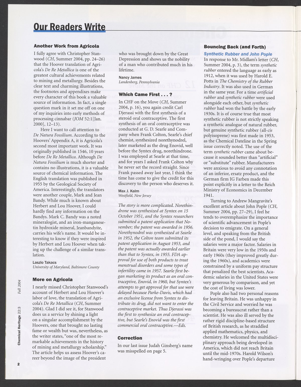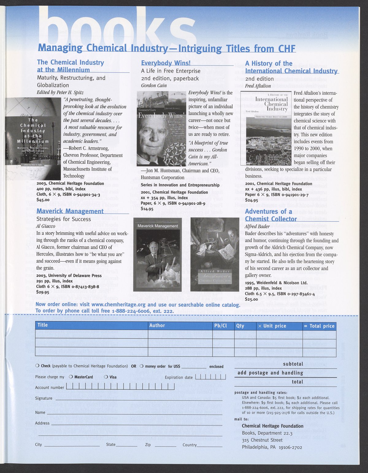 “Chemical Heritage, Volume 22 Number 3.” Philadelphia, Pennsylvania: Chemical Heritage Foundation, 2004. 099C001. Science History Institute. Philadelphia. https://digital.sciencehistory.org/works/kk6zz3v.