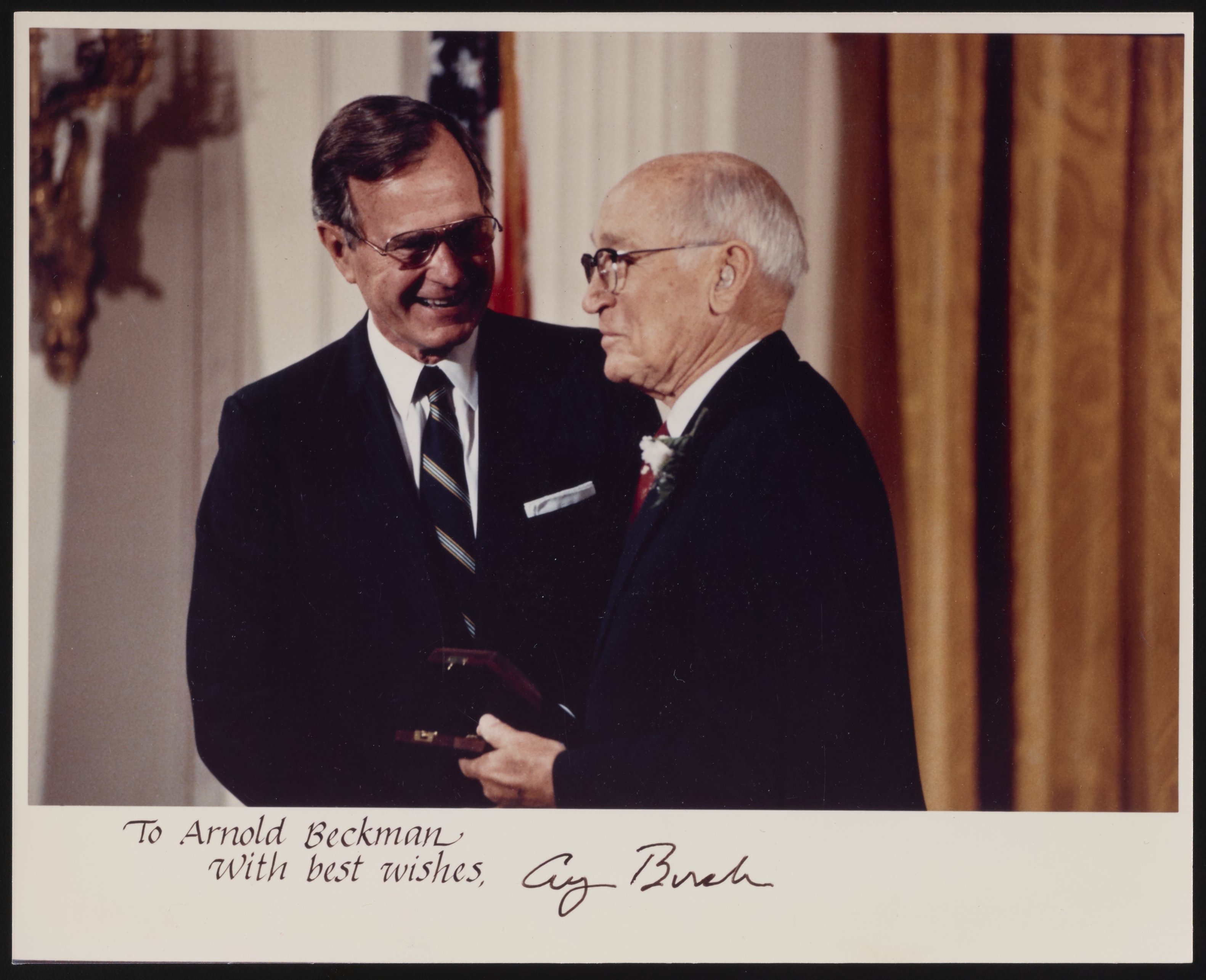 Valdez, D. “Arnold Beckman Receiving the National Medal of Science from President George H. W. Bush,” October 18, 1989. Beckman Historical Collection, Box 56, Folder 61. Science History Institute. Philadelphia. https://digital.sciencehistory.org/works/kk91fk52b.