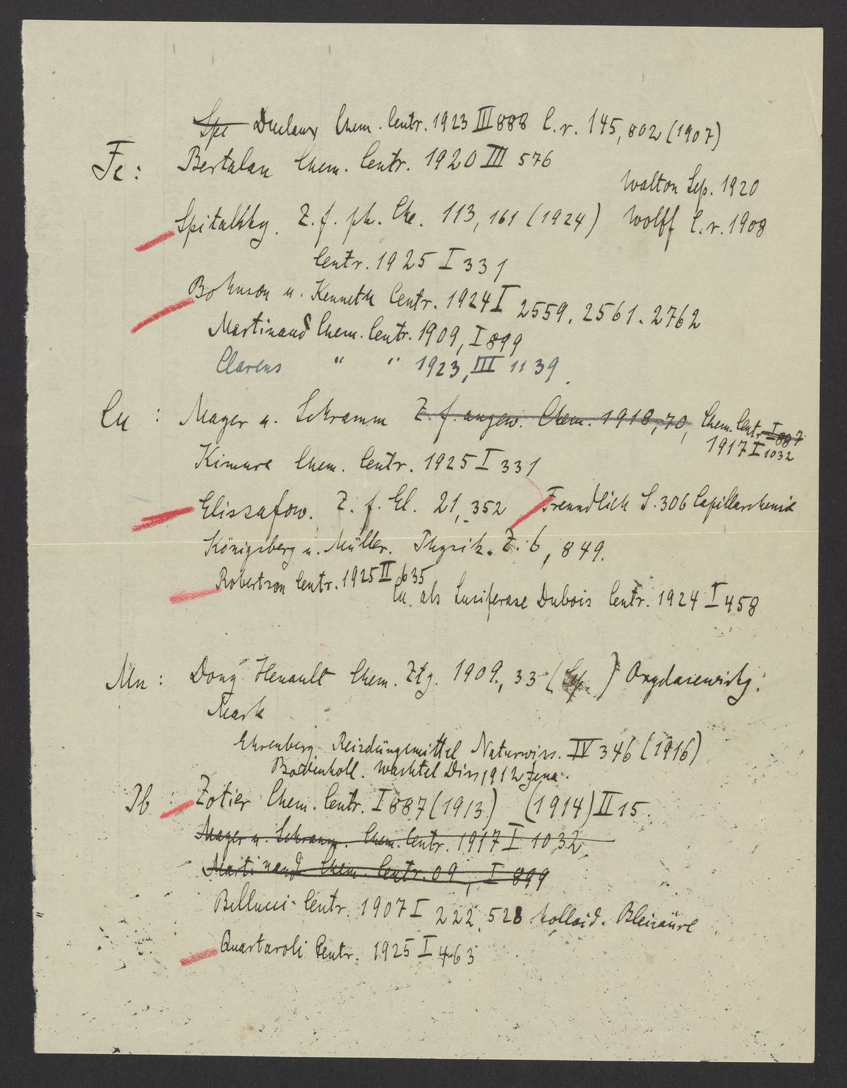 Small JPG1200 x 1541px — 318 KBLarge JPG2880 x 3699px — 1.8 MBFull-sized JPG4127 x 5300px — 3.5 MBOriginal fileTIFF — 4127 x 5300px — 62.6 MBNotes on iron, copper, manganese, and terbium written by Georg Bredig (1868-1944).