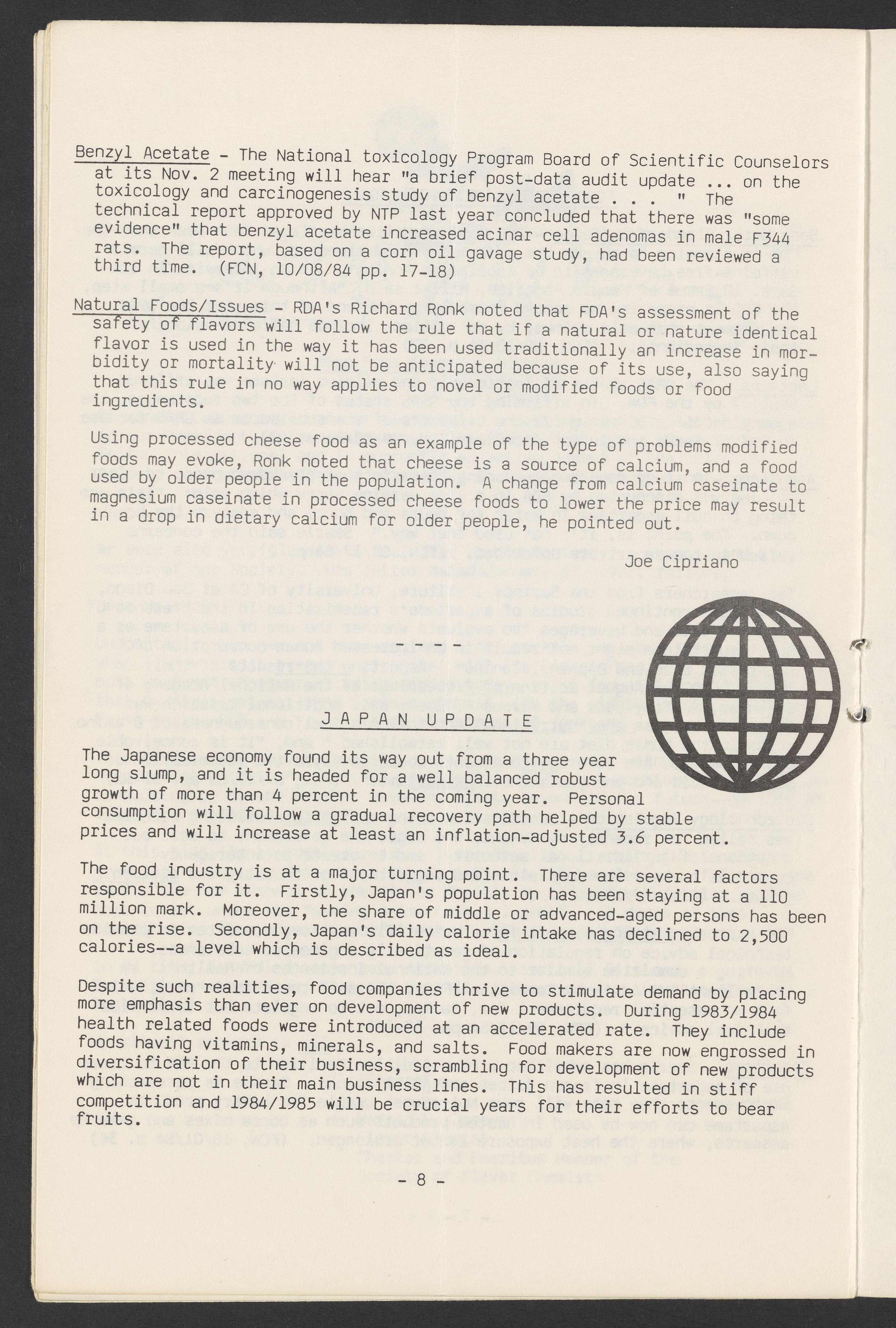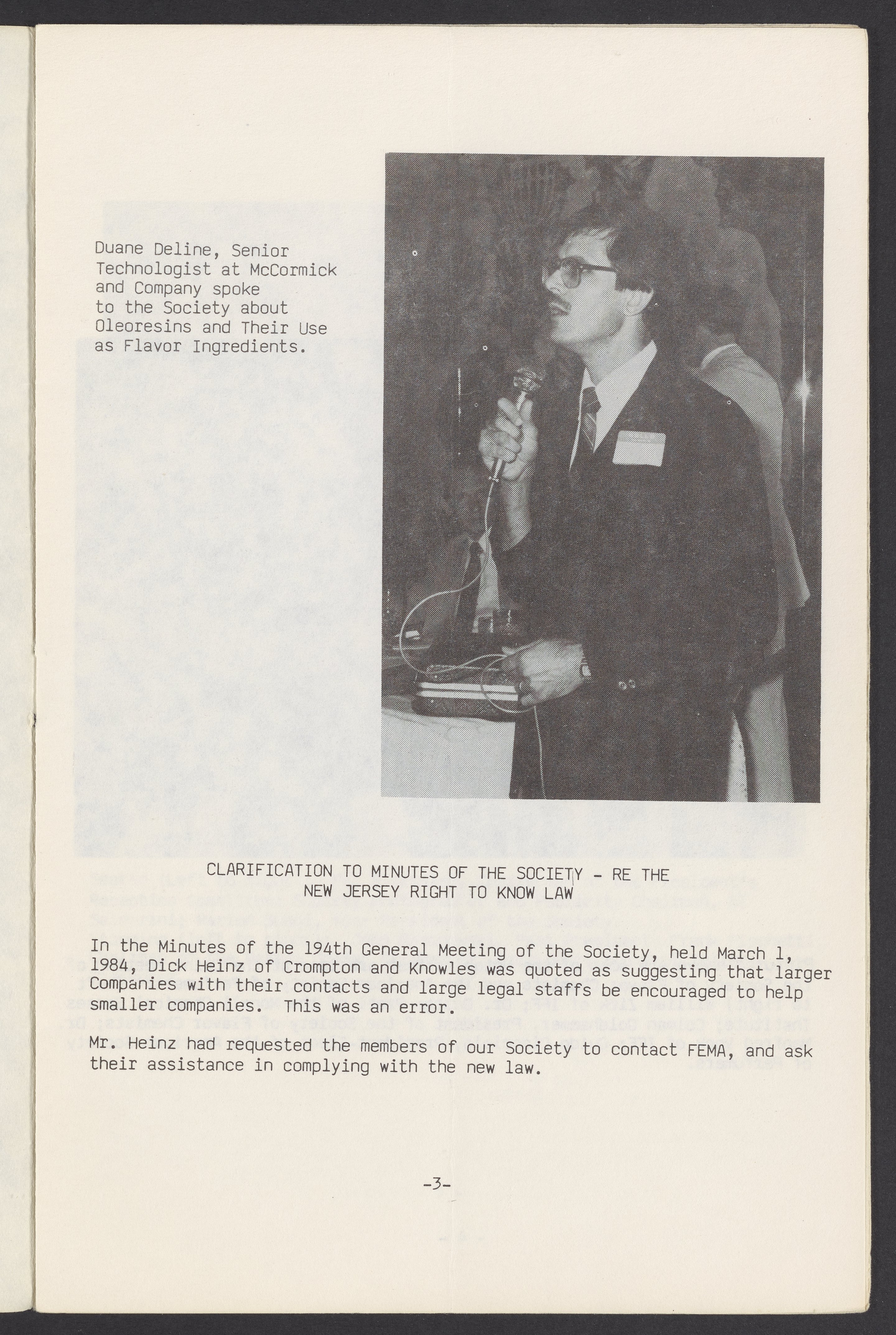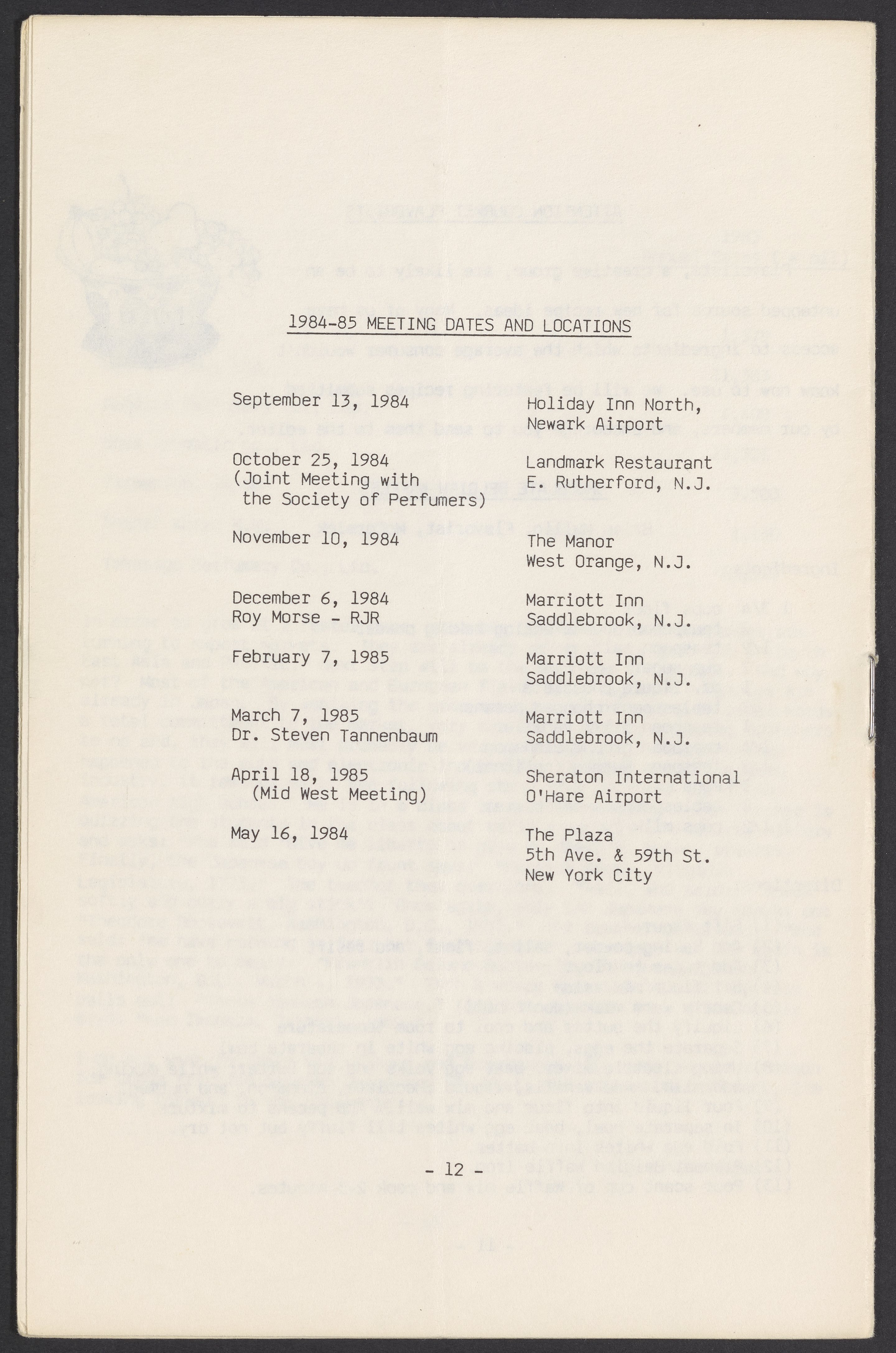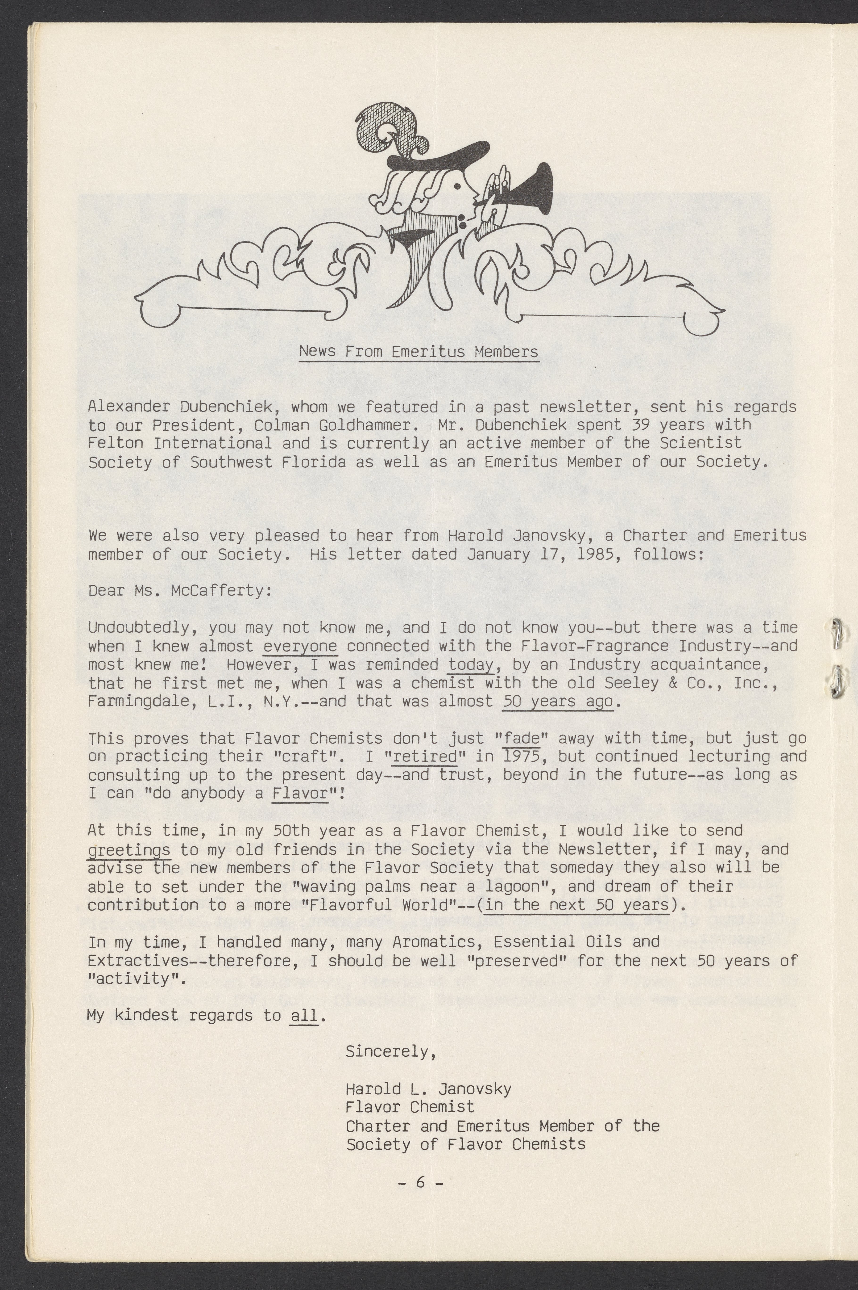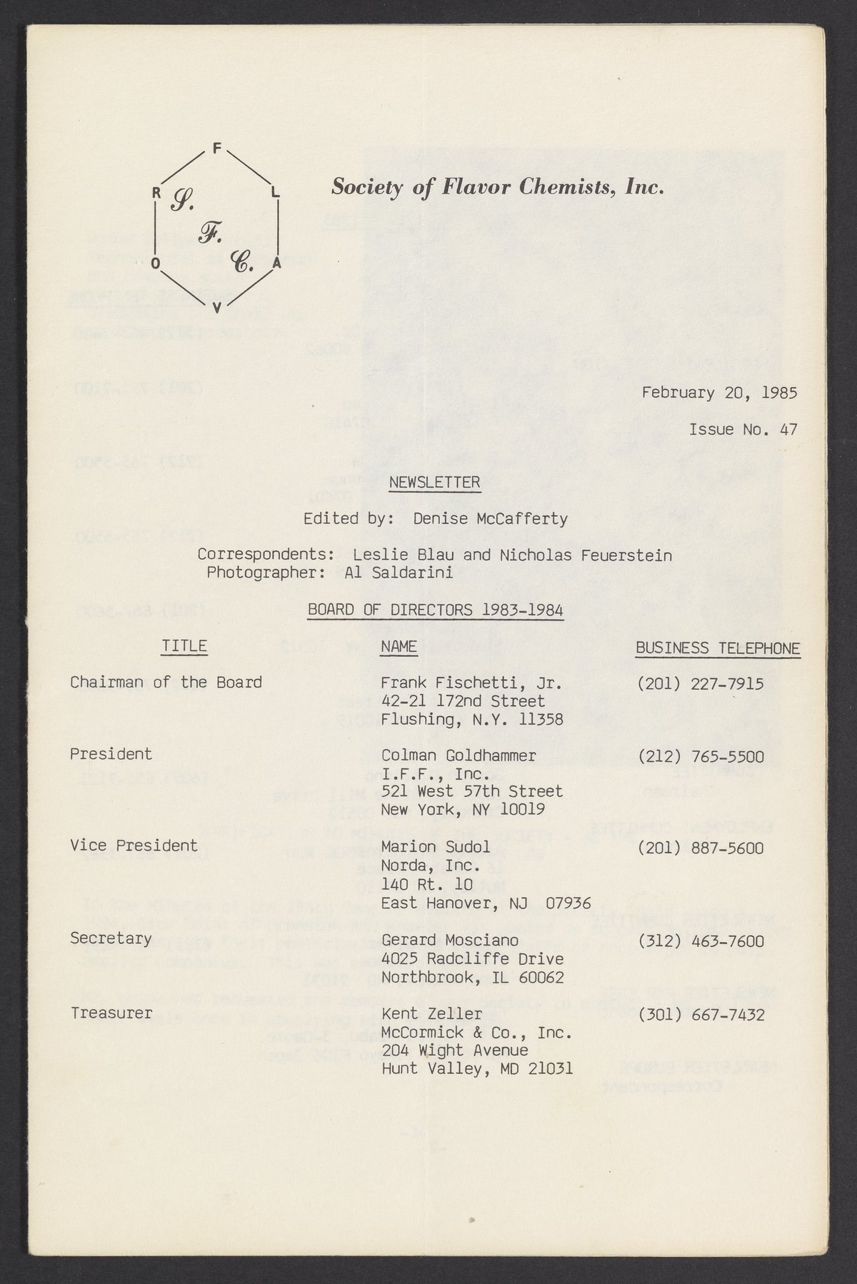 Society of Flavor Chemists. “Society of Flavor Chemists Newsletter, February 1985,” February 20, 1985. Society of Flavor Chemists Newsletters , Box 1, Folder 1. Science History Institute. Philadelphia. https://digital.sciencehistory.org/works/kmixo4o.