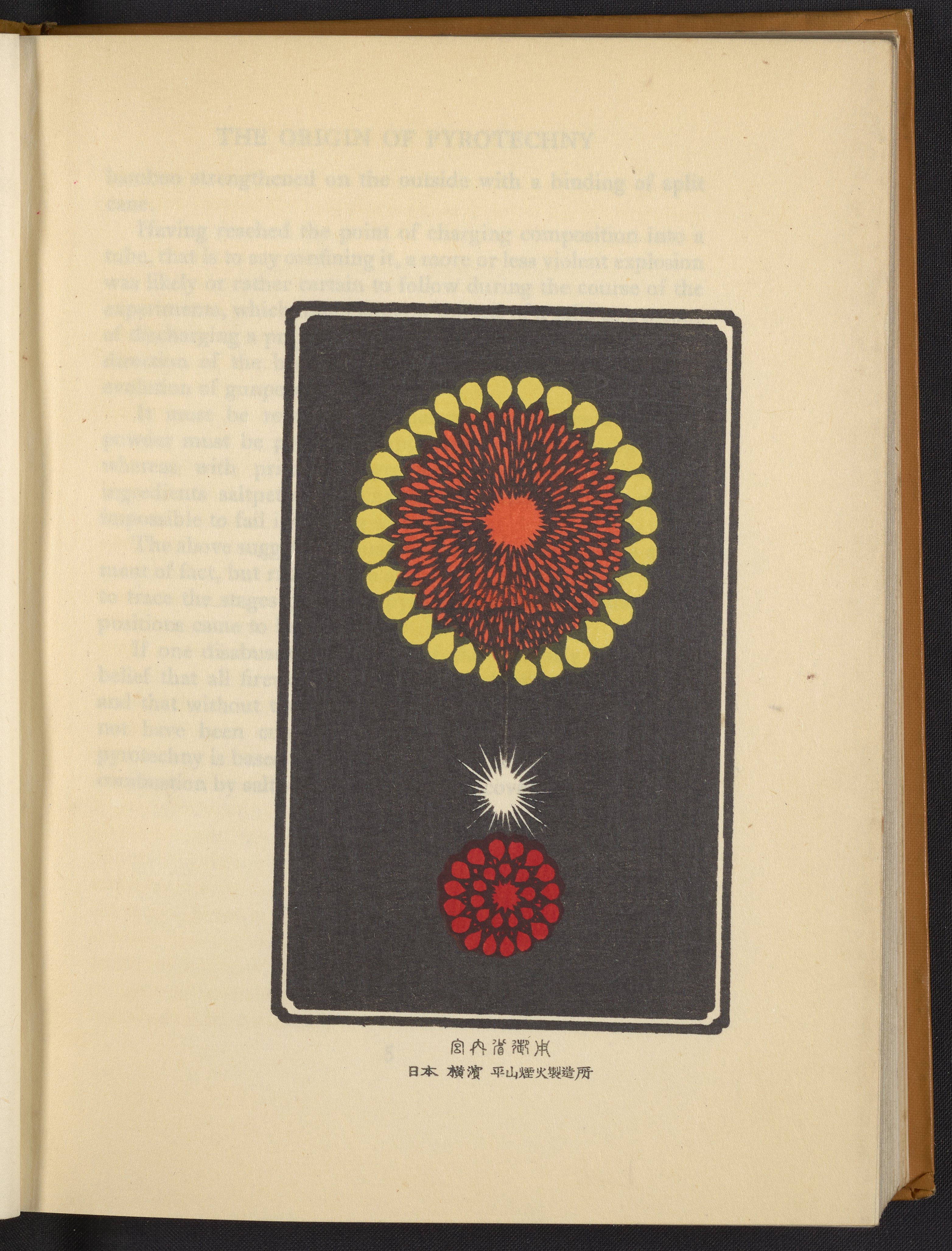 Small JPG1200 x 1546px — 365 KBLarge JPG2880 x 3709px — 1.8 MBFull-sized JPG3222 x 4150px — 2.2 MBOriginal fileTIFF — 3222 x 4150px — 38.3 MBVolume containing a history of firework design and creation. The work is divided into two parts, the first containing chapters concerning the history of pyrotechny and firework manufacture, and the second describing various classifications of fireworks and their display. Concludes with a bibliography, a list of principal ingredients used in pyrotechny, and an index. Contains 6 colored Japanese prints of fireworks and 29 black and white printed plates.