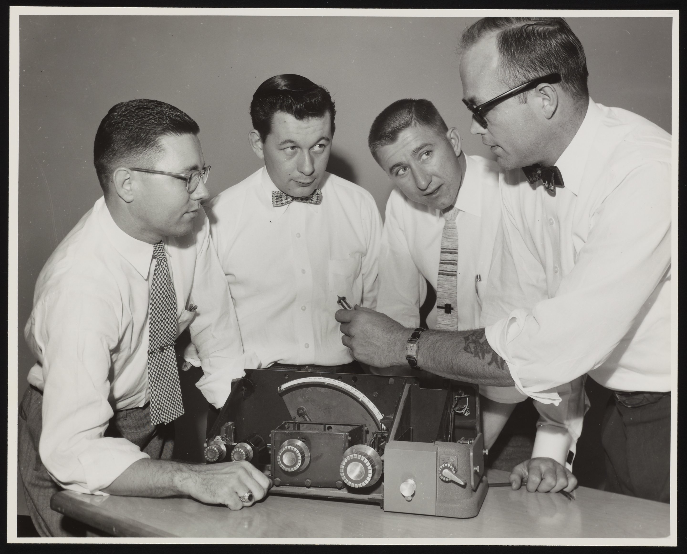 An unidentified man with a tattoo on his forearm has removed the case of a Model B DU Spectrophotometer in order to demonstrate its functions to three other (also unidentified) men.